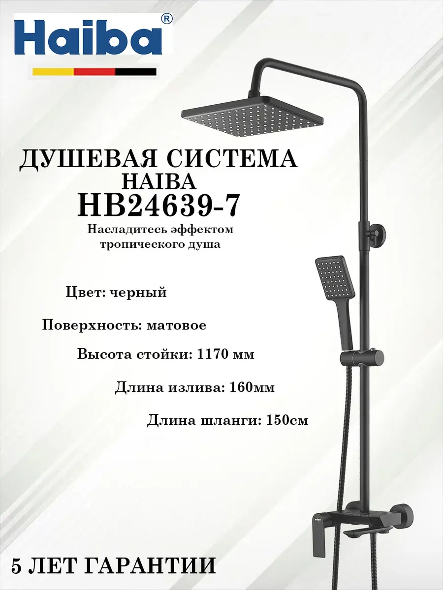 Душевая система Haiba HB24639-7 разработана по последним технологиям и имеет современный и стильный дизайн, выполнена в черном цвете. Фирменный керамический картридж обеспечивает плавность хода джойстика, качество смешивания воды и надежность запорного механизма. Предусмотрена регулировка тропического душа по высоте, также регулируется наклон верхнего душа. Максимальная высота стойки 1170 мм. Держатель ручной лейки регулируется по высоте. Комплект состоит из верхнего душа, лейки, шланги, штанги, смесителя, держателя лейки, крепления и эксцентриков. Гарантия 5 лет на корпус, 1 год на комплектующие, имеется выездной сервисный центр по всей России.