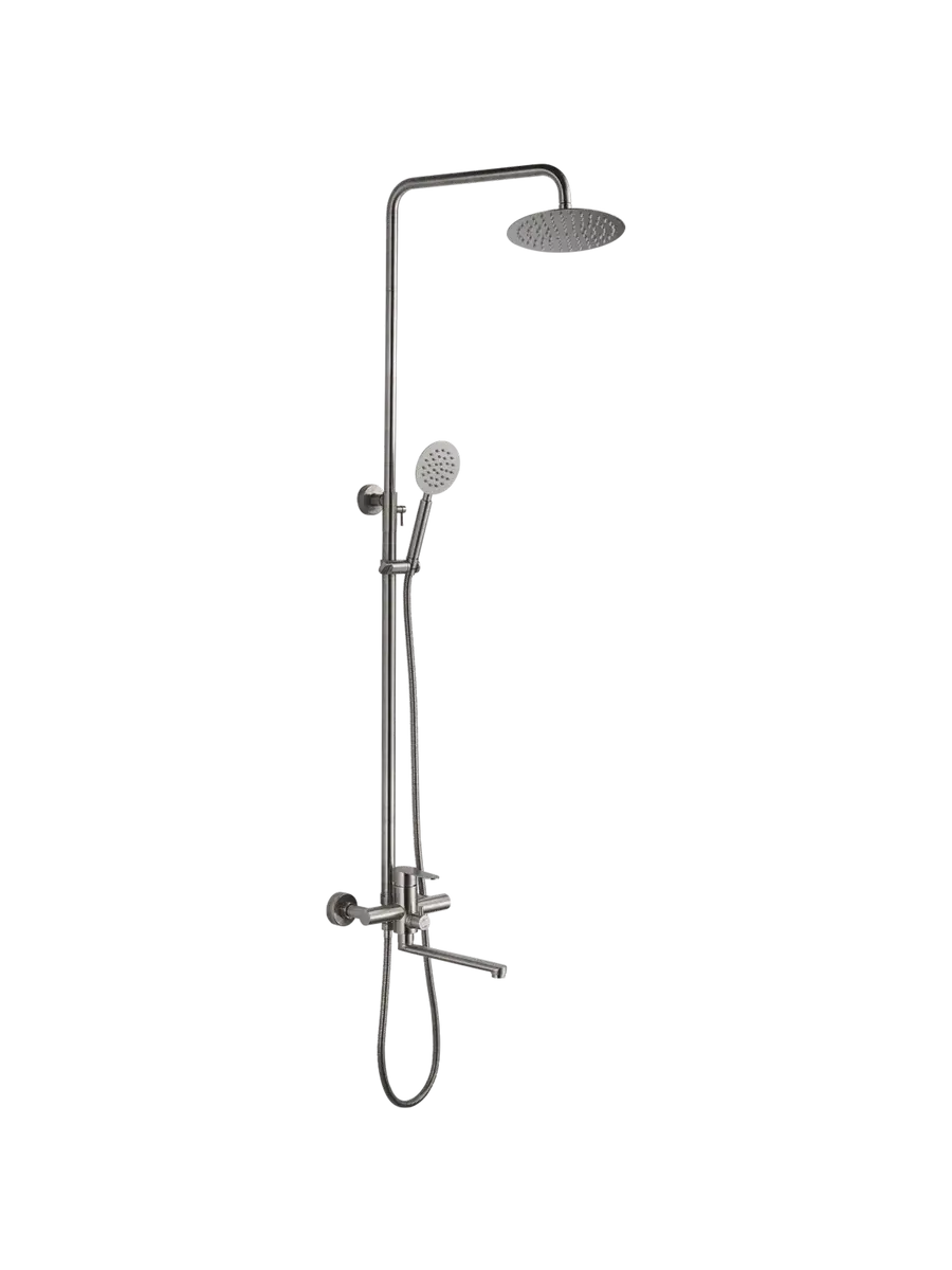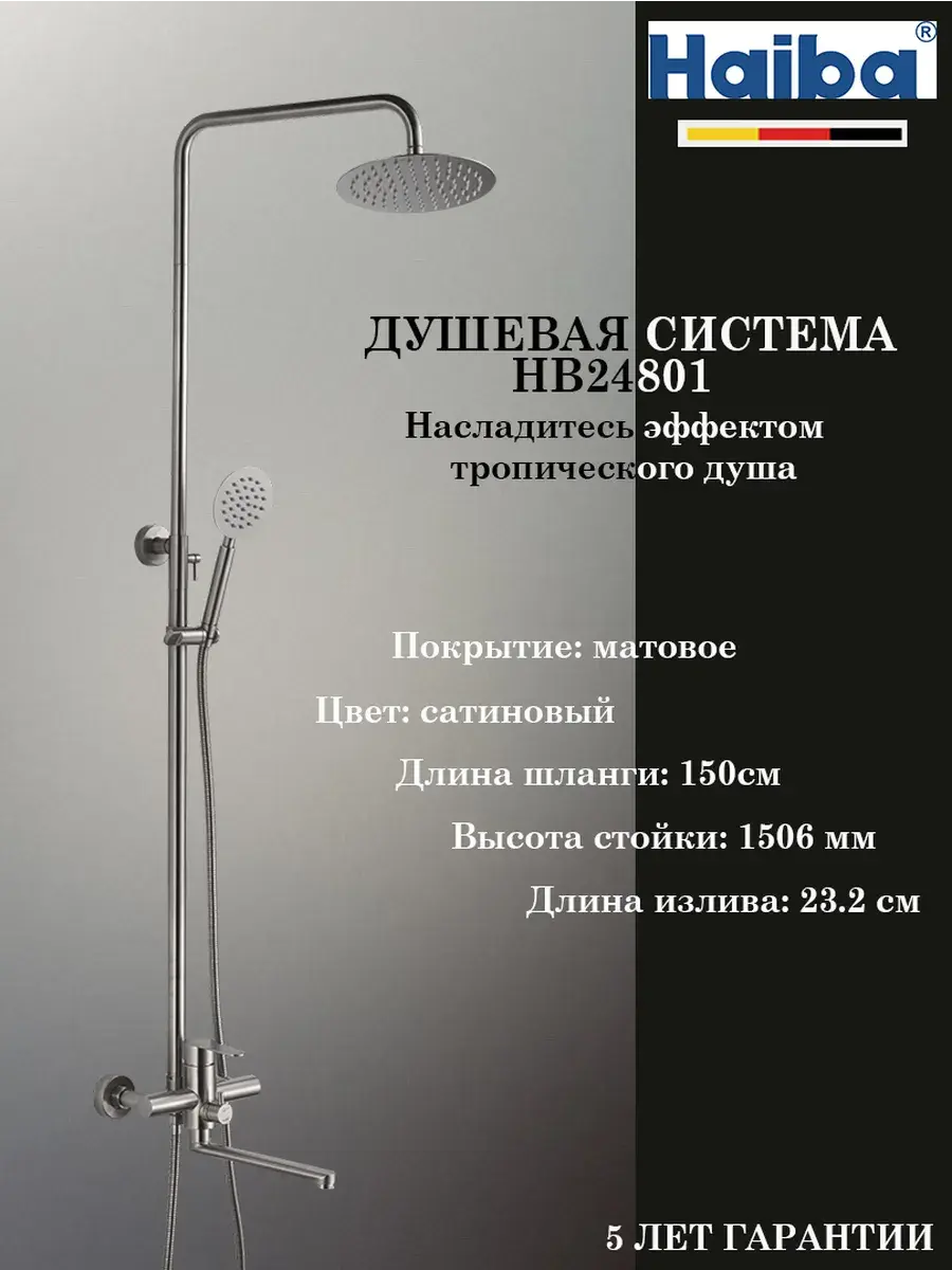 Душевая система Haiba HB24801 разработана по последним технологиям и имеет современный и стильный дизайн, выполнена в черном сатиновом цвете. Фирменный керамический картридж обеспечивает плавность хода джойстика, качество смешивания воды и надежность запорного механизма. Предусмотрена регулировка тропического душа по высоте, также регулируется наклон верхнего душа. Максимальная высота стойки 1506 мм. Держатель ручной лейки регулируется по высоте. Комплект состоит из верхнего душа, лейки, шланги, штанги, смесителя, держателя лейки, крепления и эксцентриков. Гарантия 5 лет на корпус, 1 год на комплектующие, имеется выездной сервисный центр по всей России.