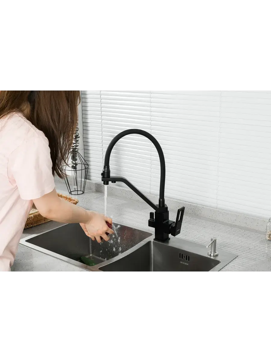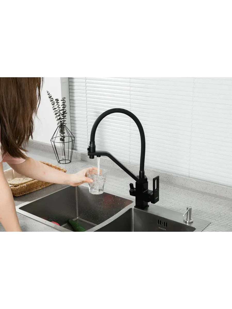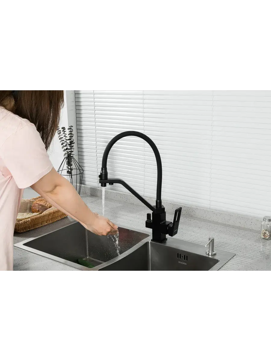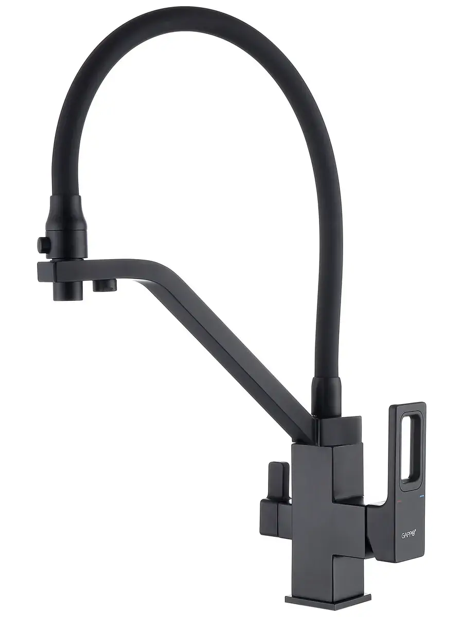 Предлагаем однорычажный смеситель с подключением фильтра для воды для кухонной мойки с гибким силиконовым изливом в черном цвете G4317-6 GAPPO (ГАППО) с гайкой. Излив гибкий. Картридж испанский Sedal Ф35 мм. Металлическая рукоятка. Аэратор. Гибкая подводка на 1/2 дюйма (длина 500 мм). Смесители GAPPO это технологии, дизайн и качество по доступным ценам. Продукция производится на современных станках с числовым программным управлением. Высокоточные линии литья и обработки, а также использование современных материалов позволяют гарантировать высокий уровень качества продукции. GAPPO - это надёжный работник, который добросовестно будет исполнять свои обязанности. Продукция отличается хорошим соотношением цены и качества.