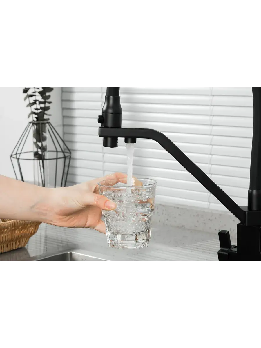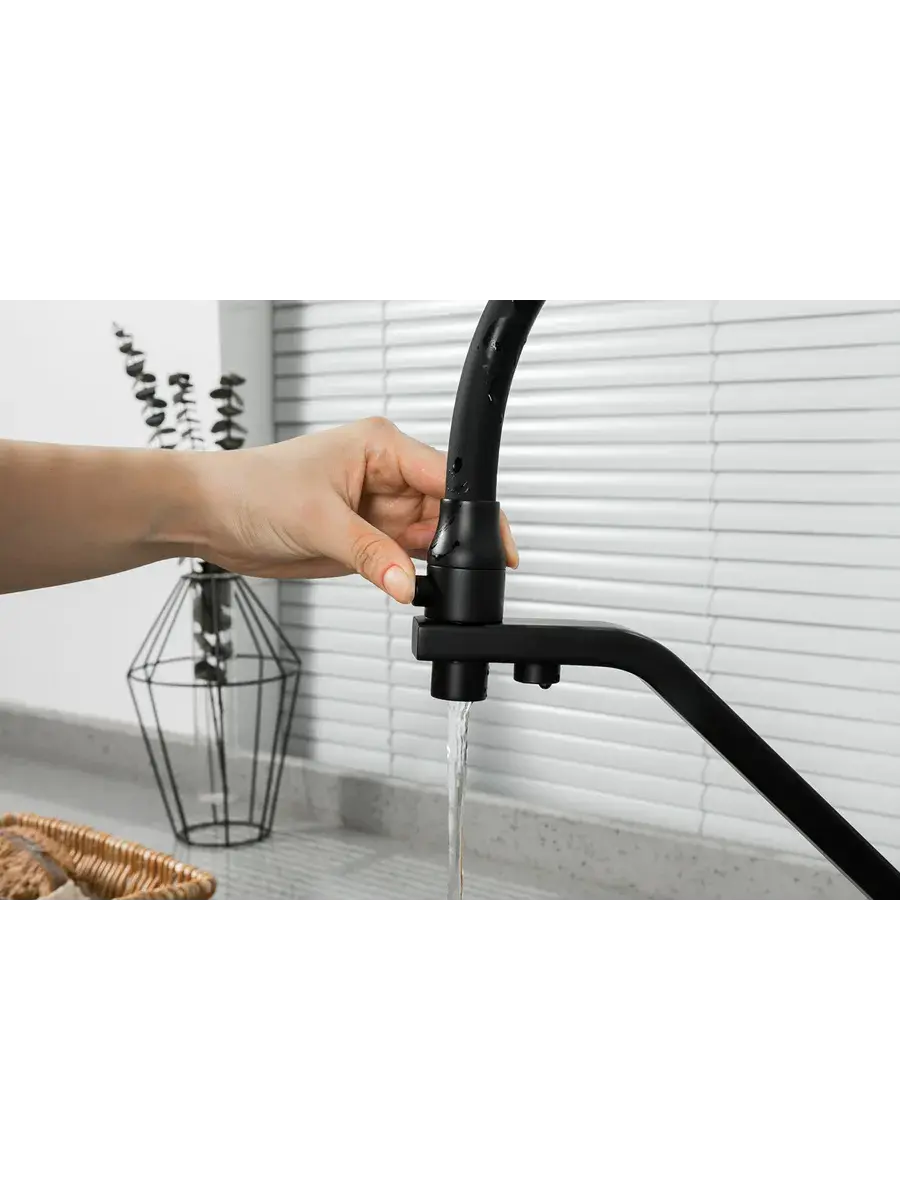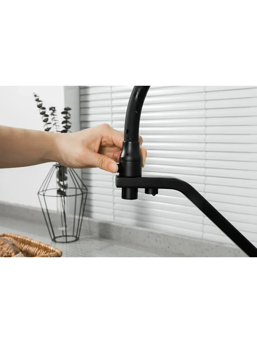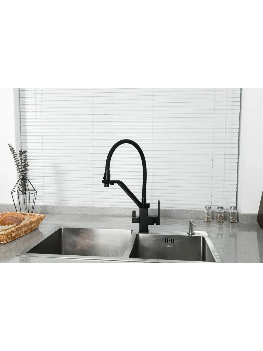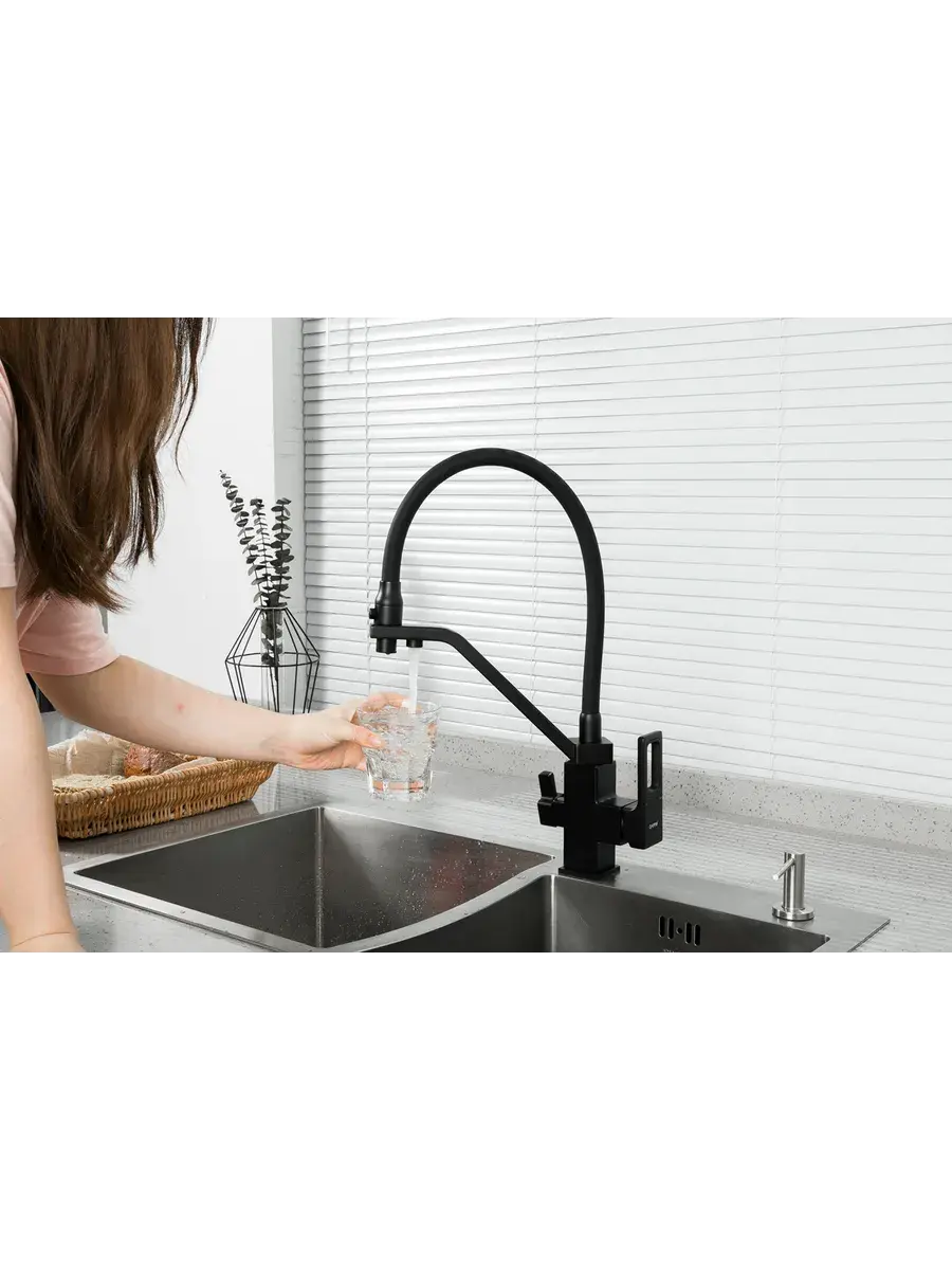 Предлагаем однорычажный смеситель с подключением фильтра для воды для кухонной мойки с гибким силиконовым изливом в черном цвете G4317-6 GAPPO (ГАППО) с гайкой. Излив гибкий. Картридж испанский Sedal Ф35 мм. Металлическая рукоятка. Аэратор. Гибкая подводка на 1/2 дюйма (длина 500 мм). Смесители GAPPO это технологии, дизайн и качество по доступным ценам. Продукция производится на современных станках с числовым программным управлением. Высокоточные линии литья и обработки, а также использование современных материалов позволяют гарантировать высокий уровень качества продукции. GAPPO - это надёжный работник, который добросовестно будет исполнять свои обязанности. Продукция отличается хорошим соотношением цены и качества.