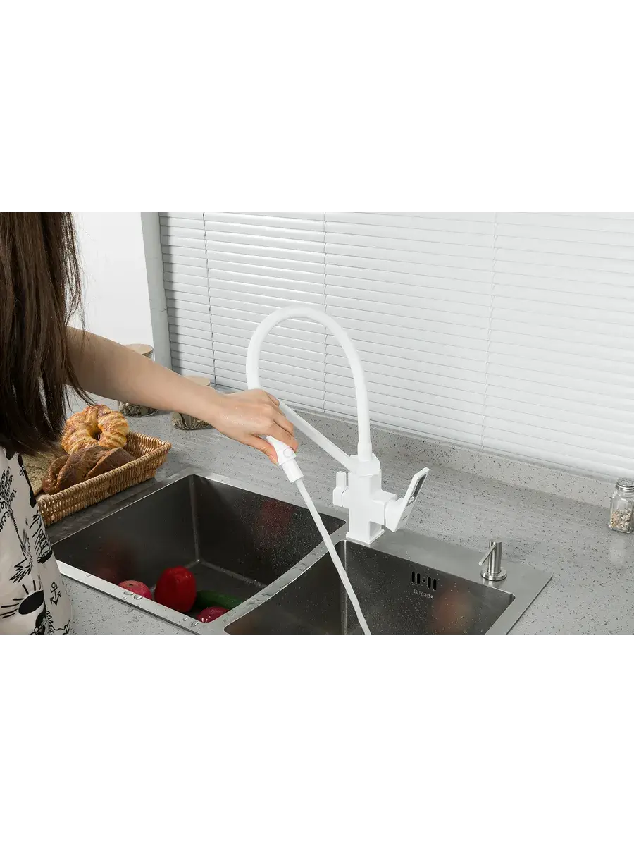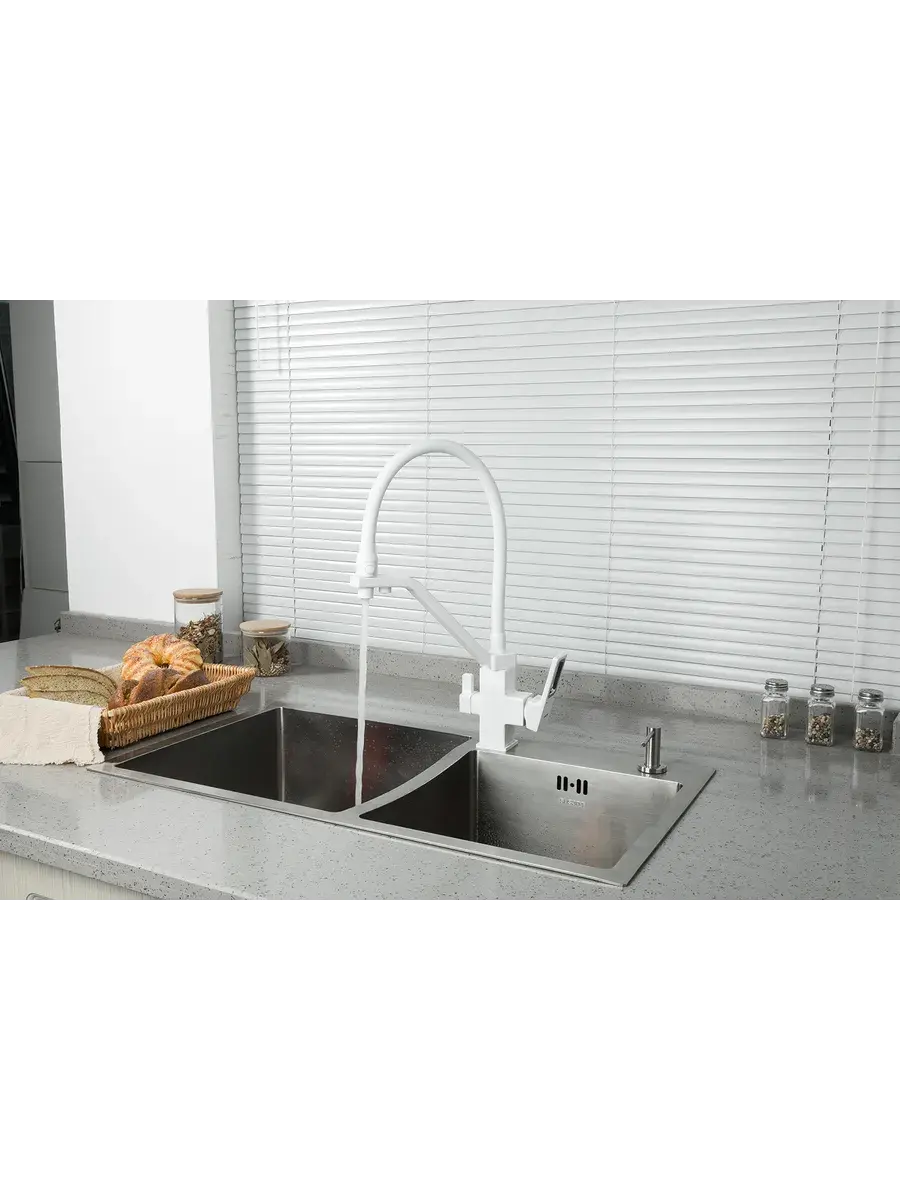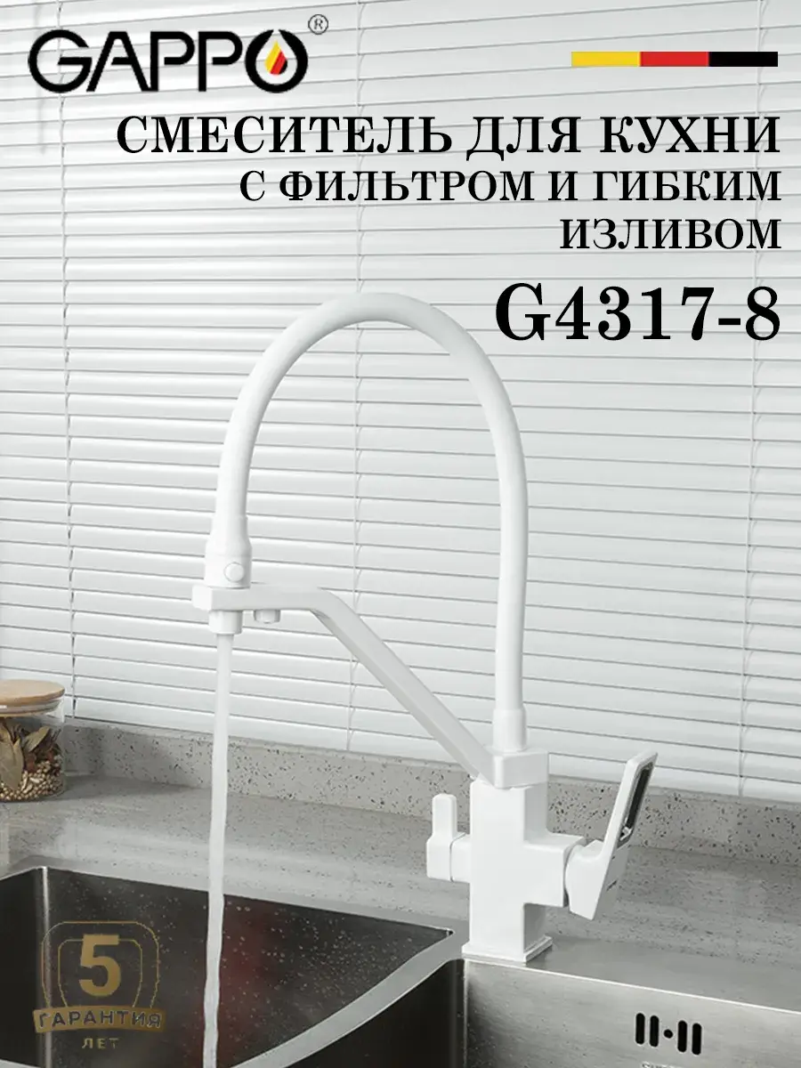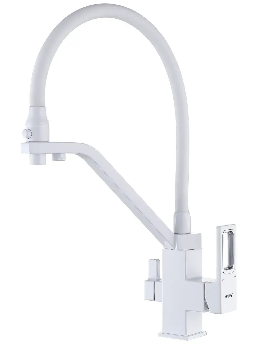 Предлагаем однорычажный смеситель с подключением фильтра для воды для кухонной мойки с гибким силиконовым изливом в белом цвете G4317-8 GAPPO (ГАППО) с гайкой. Излив гибкий. Картридж испанский Sedal Ф35 мм. Металлическая рукоятка. Аэратор. Гибкая подводка на 1/2 дюйма (длина 500 мм). Смесители GAPPO это технологии, дизайн и качество по доступным ценам. Продукция производится на современных станках с числовым программным управлением. Высокоточные линии литья и обработки, а также использование современных материалов позволяют гарантировать высокий уровень качества продукции. GAPPO - это надёжный работник, который добросовестно будет исполнять свои обязанности. Продукция отличается хорошим соотношением цены и качества.