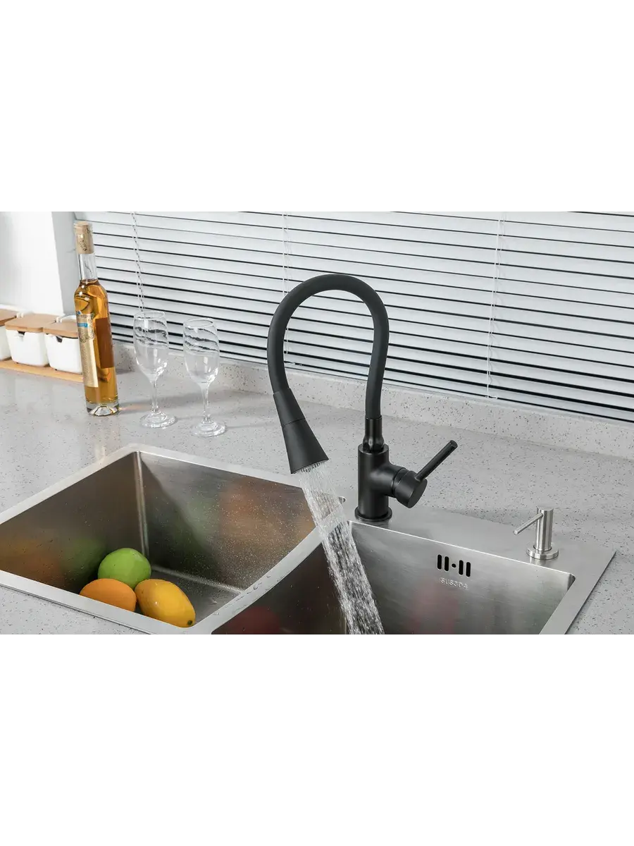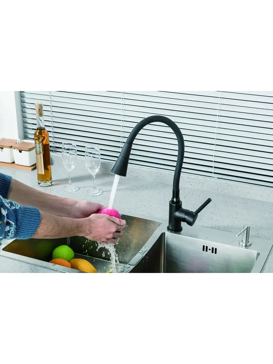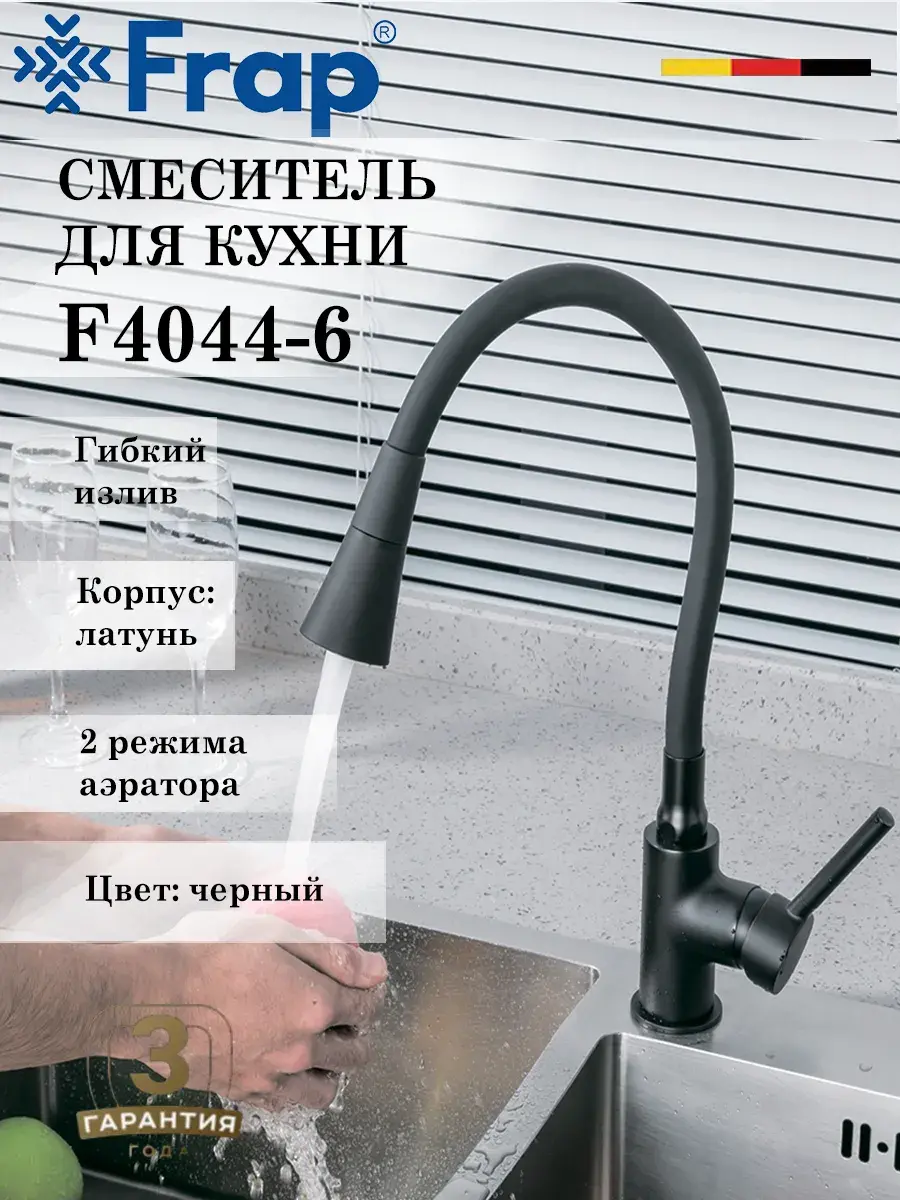 Латунный смеситель с гибким высоким поворотным изливом F4044-6 в черном цвете - лучшая современная сантехника для дома и дачи. Имеет свойство шумоподавления благодаря насадке-распылителю на гусаке - универсальному аэратору. Длинный излив с рассеивателем предназначен для мытья большой посуды кухонных принадлежностей и утвари - противня или сковороды. Имеет рычаг с клапаном из керамики для водопроводной воды и встроенный краник-переключатель для воды из системы очистки. Керамический картридж однорычажного регулирующего крана обеспечивает точную настройку температуры и давления воды. Эргономичная модель со стильным дизайном подойдет к мойкам любых размеров и форм украсив интерьер Вашей кухни. Все наши смесители 2 в 1 - качество и надежность во время эксплуатации.