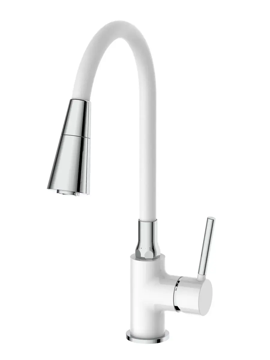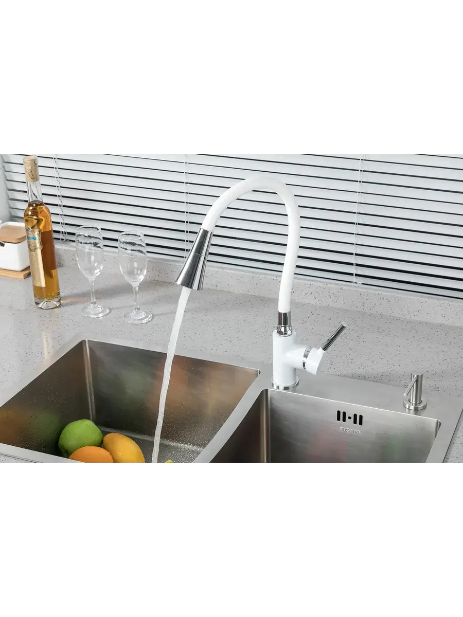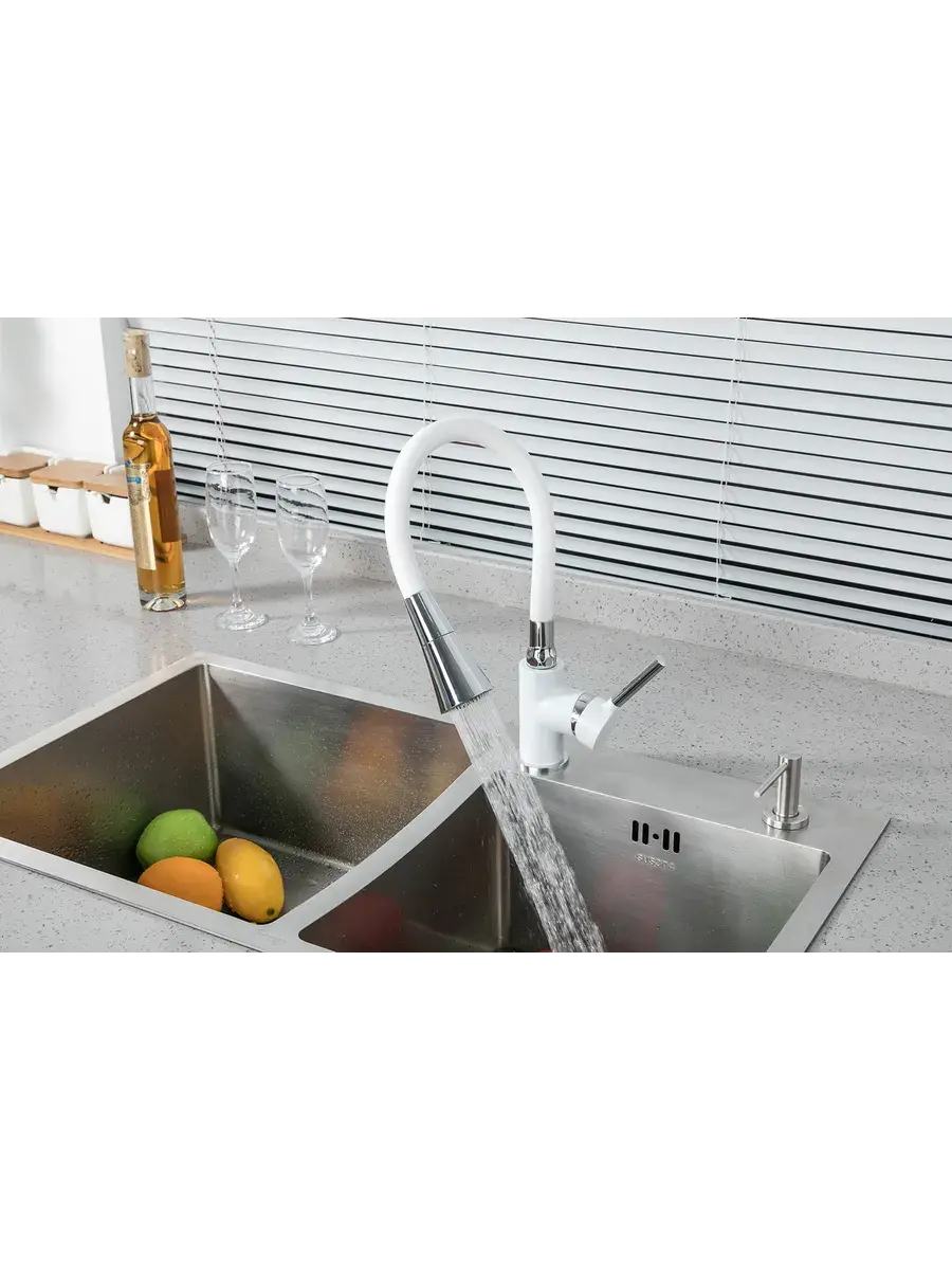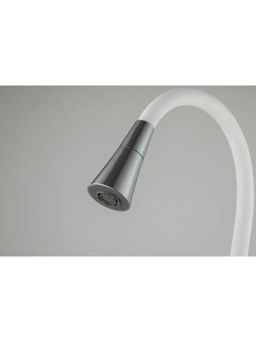 Латунный смеситель с гибким высоким поворотным изливом F4044-8 в белом цвете - лучшая современная сантехника для дома и дачи. Имеет свойство шумоподавления благодаря насадке-распылителю на гусаке - универсальному аэратору. Длинный излив с рассеивателем предназначен для мытья большой посуды кухонных принадлежностей и утвари - противня или сковороды. Имеет рычаг с клапаном из керамики для водопроводной воды и встроенный краник-переключатель для воды из системы очистки. Керамический картридж однорычажного регулирующего крана обеспечивает точную настройку температуры и давления воды. Эргономичная модель со стильным дизайном подойдет к мойкам любых размеров и форм украсив интерьер Вашей кухни. Все наши смесители 2 в 1 - качество и надежность во время эксплуатации.