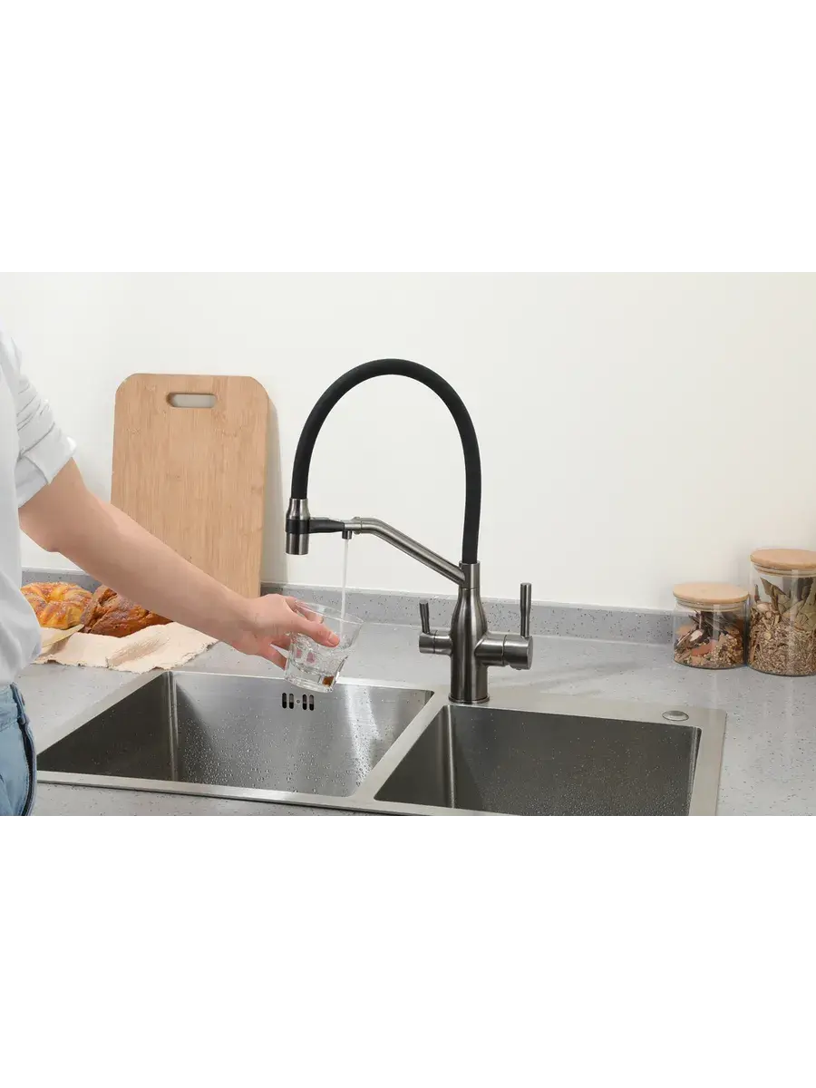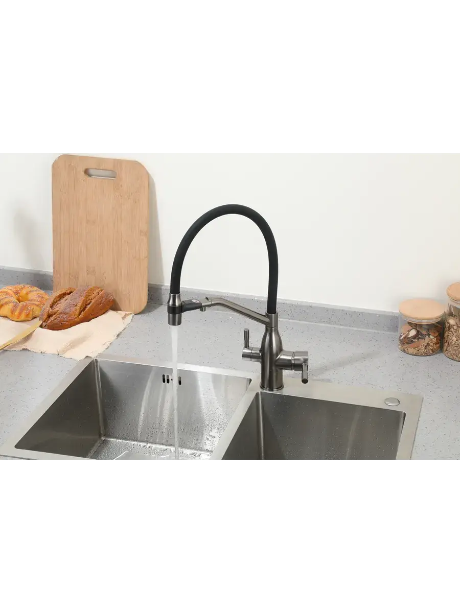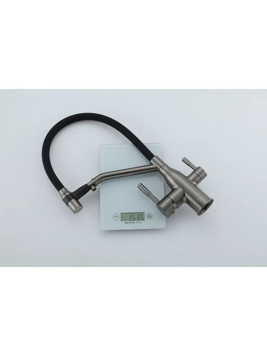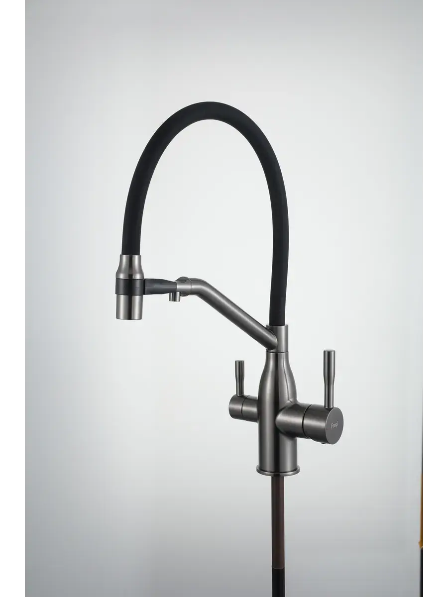 Смеситель для кухни с подключением фильтра для питьевой воды и гибким изливом FRAP F4397-9 станет стильным и функциональным дополнением к вашей рабочей зоне. Модель оснащена поворотным гибким изливом высотой 43.9 см и длиной 23 см, что обеспечивает удобство использования при мытье посуды и заполнении емкостей. Встроенный фильтр и аэратор гарантируют чистую и экономичную подачу воды. Двухрычажный механизм управления позволяет легко регулировать температуру и напор воды. Смеситель FRAP F4397-9 выполнен из прочных материалов - латуни, силикона и силумина, что обеспечивает его долговечность и надежность. 2 режима аэратора позволит Вам насладиться комфортом смесителя в полной мере.
