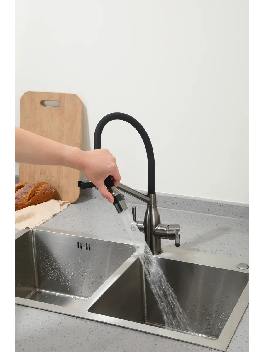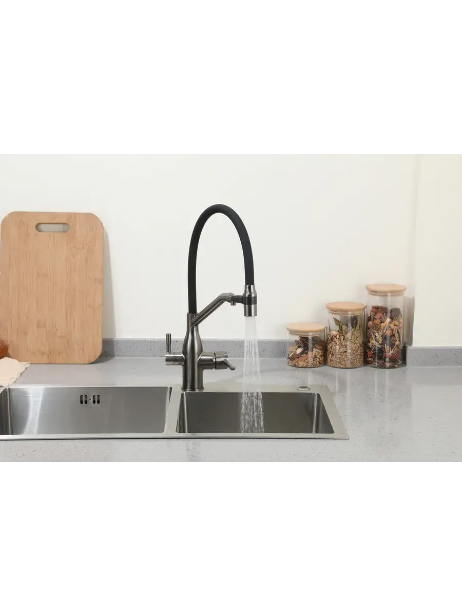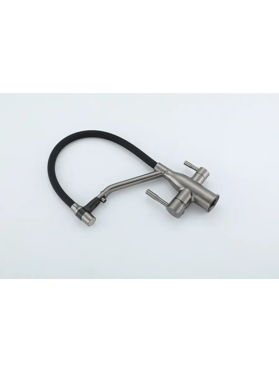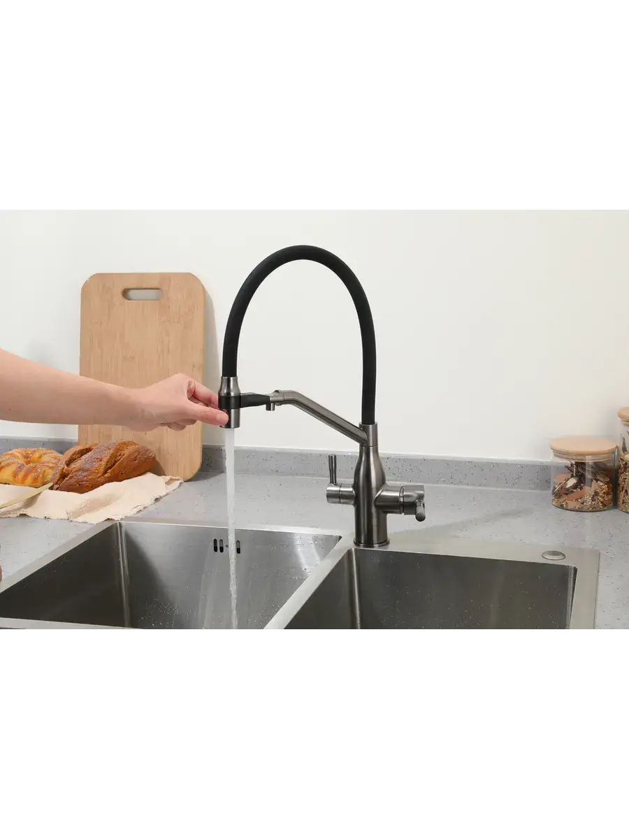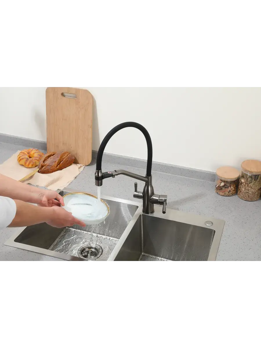 Смеситель для кухни с подключением фильтра для питьевой воды и гибким изливом FRAP F4397-9 станет стильным и функциональным дополнением к вашей рабочей зоне. Модель оснащена поворотным гибким изливом высотой 43.9 см и длиной 23 см, что обеспечивает удобство использования при мытье посуды и заполнении емкостей. Встроенный фильтр и аэратор гарантируют чистую и экономичную подачу воды. Двухрычажный механизм управления позволяет легко регулировать температуру и напор воды. Смеситель FRAP F4397-9 выполнен из прочных материалов - латуни, силикона и силумина, что обеспечивает его долговечность и надежность. 2 режима аэратора позволит Вам насладиться комфортом смесителя в полной мере.