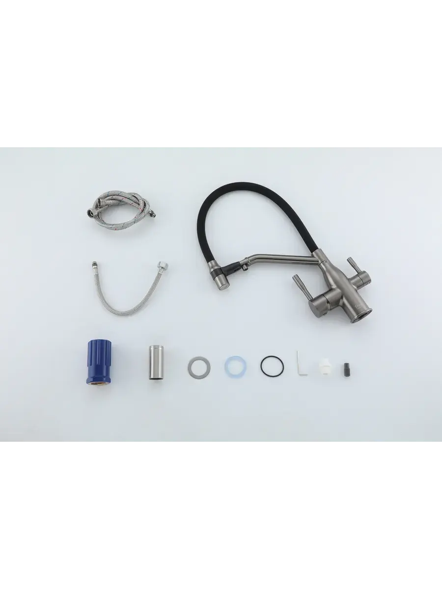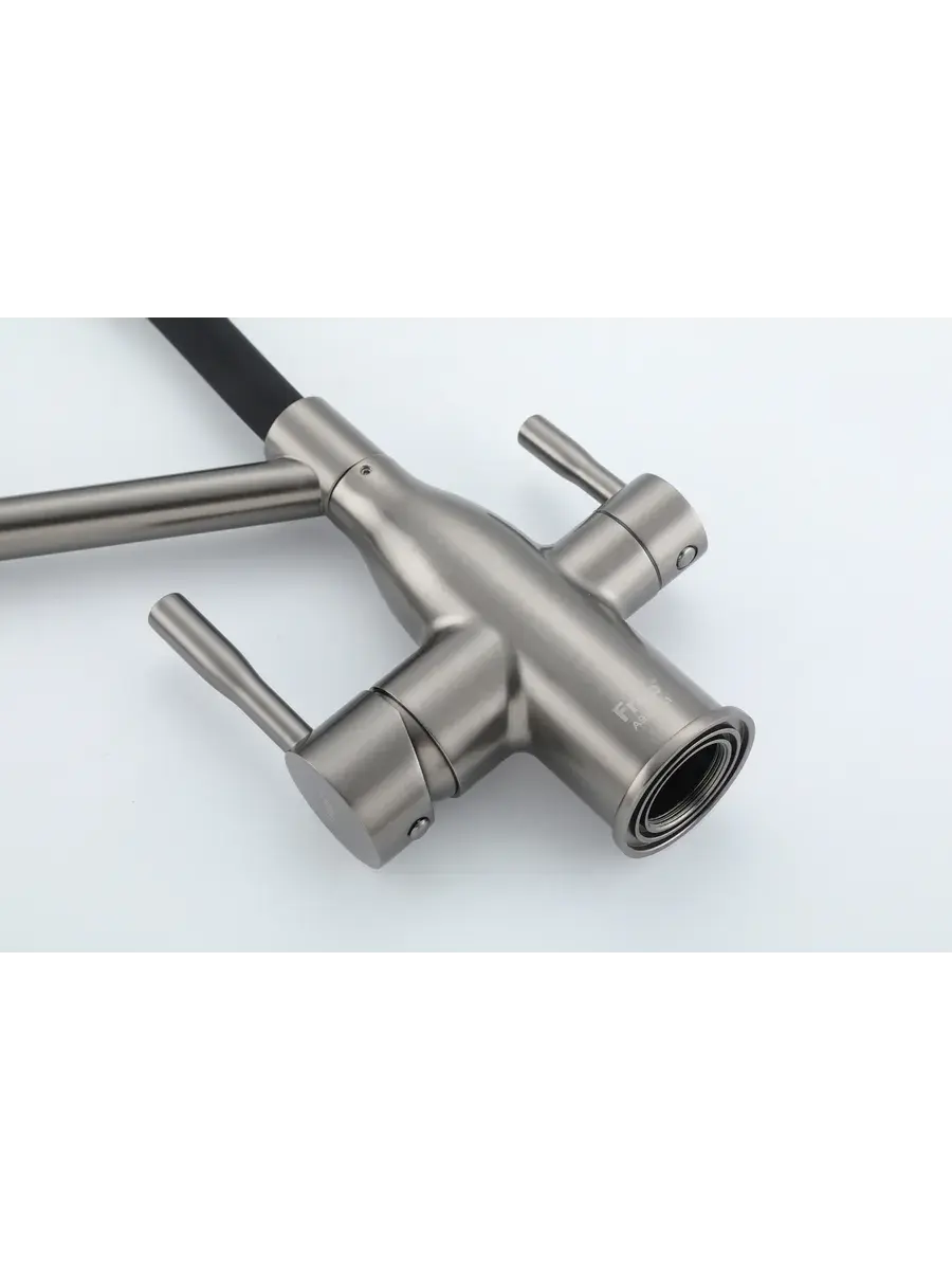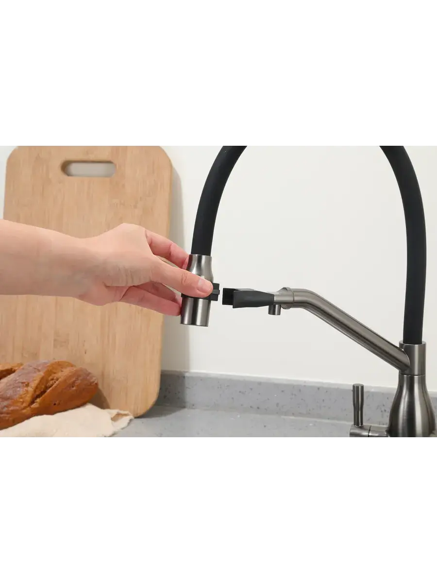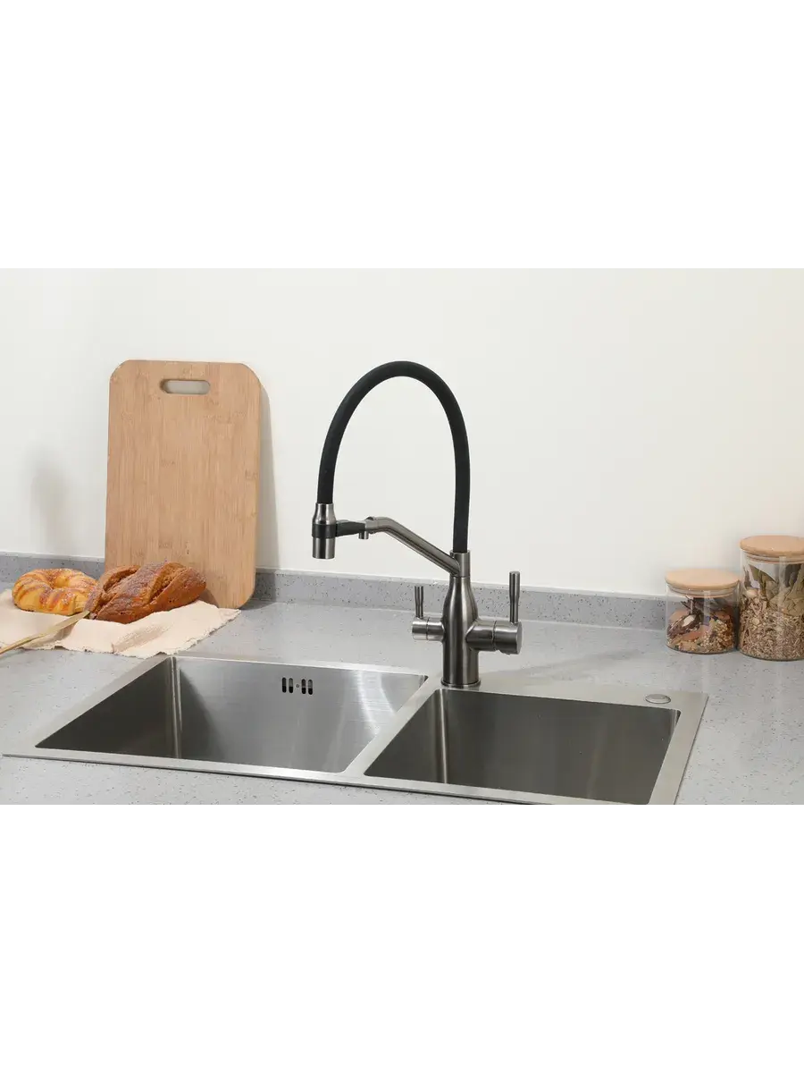 Смеситель для кухни с подключением фильтра для питьевой воды и гибким изливом FRAP F4397-9 станет стильным и функциональным дополнением к вашей рабочей зоне. Модель оснащена поворотным гибким изливом высотой 43.9 см и длиной 23 см, что обеспечивает удобство использования при мытье посуды и заполнении емкостей. Встроенный фильтр и аэратор гарантируют чистую и экономичную подачу воды. Двухрычажный механизм управления позволяет легко регулировать температуру и напор воды. Смеситель FRAP F4397-9 выполнен из прочных материалов - латуни, силикона и силумина, что обеспечивает его долговечность и надежность. 2 режима аэратора позволит Вам насладиться комфортом смесителя в полной мере.