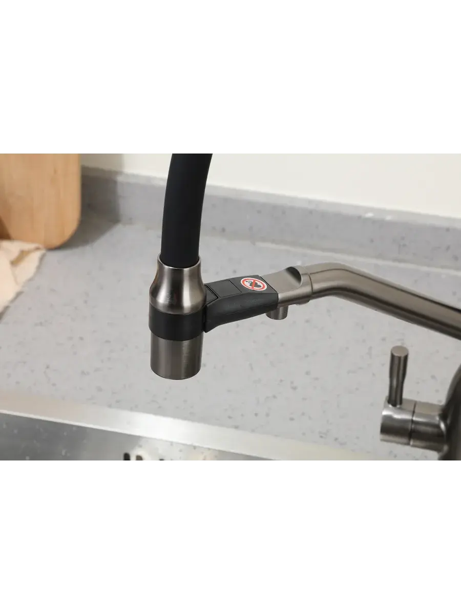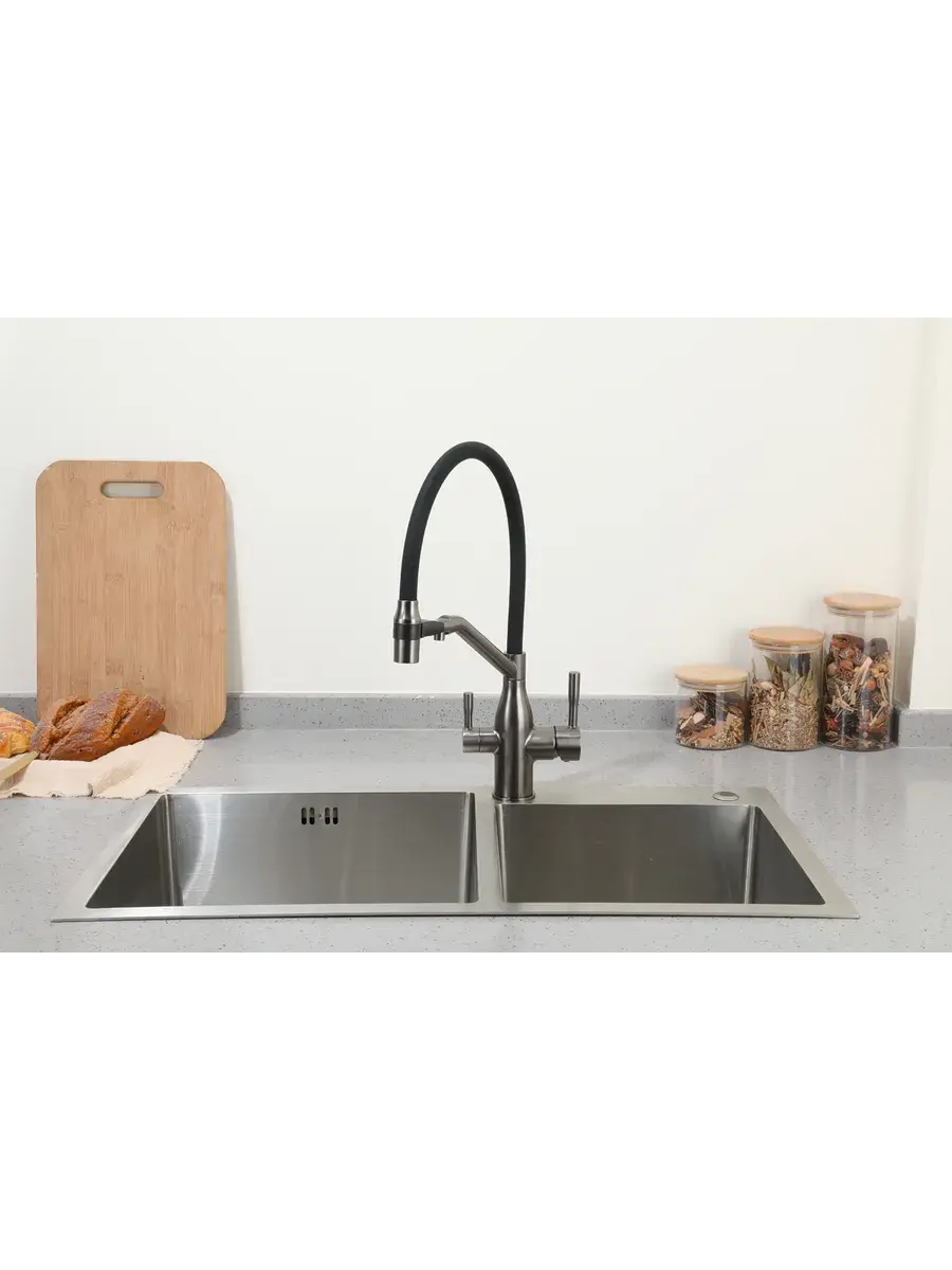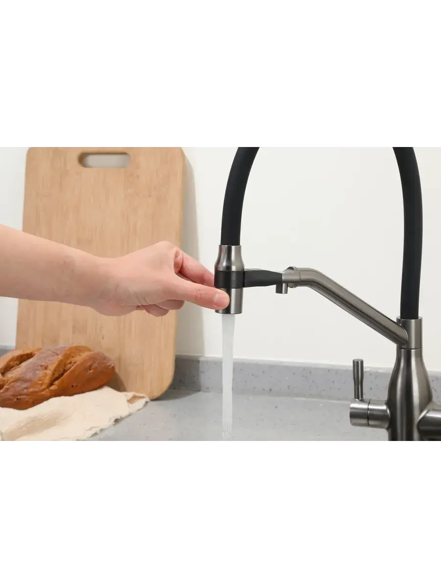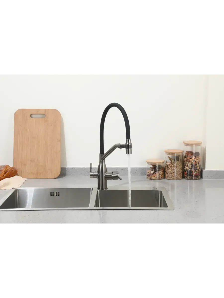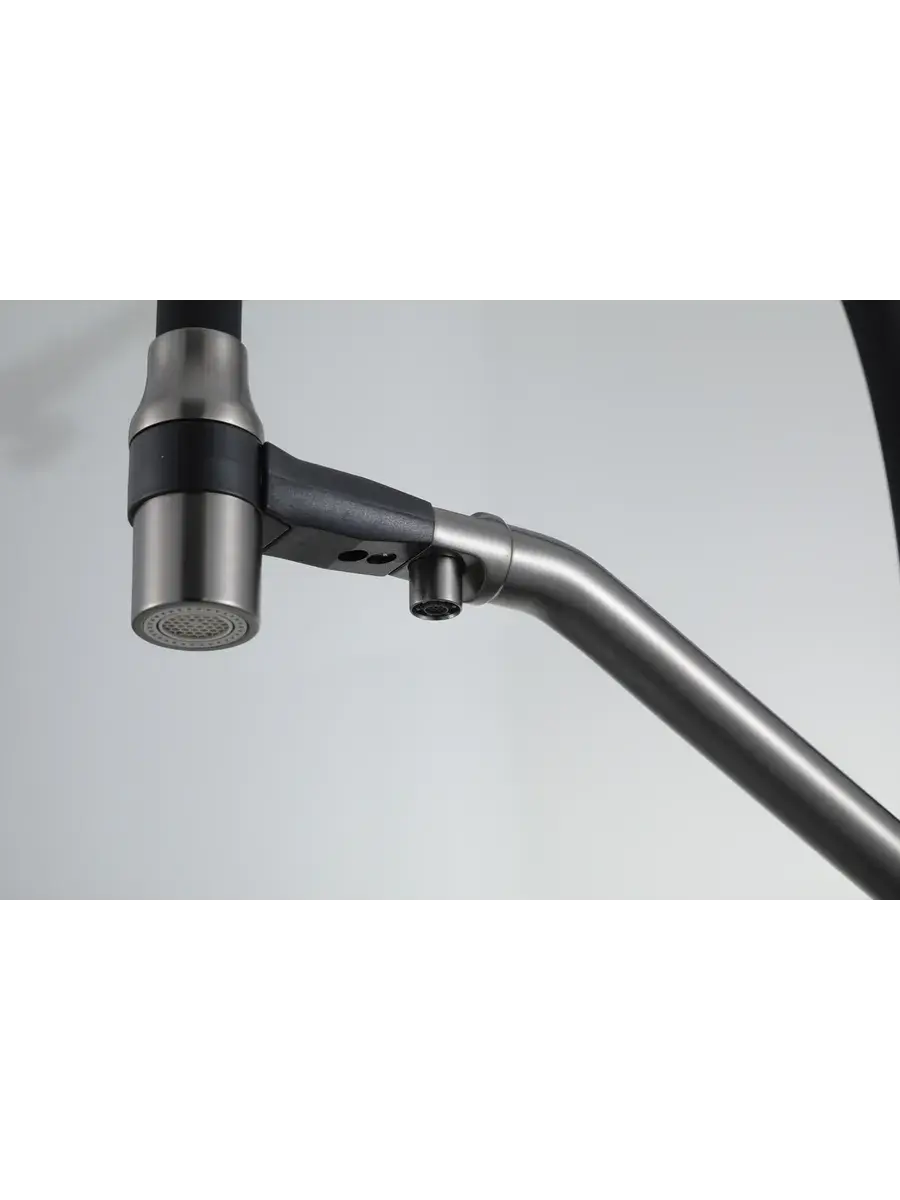 Смеситель для кухни с подключением фильтра для питьевой воды и гибким изливом FRAP F4397-9 станет стильным и функциональным дополнением к вашей рабочей зоне. Модель оснащена поворотным гибким изливом высотой 43.9 см и длиной 23 см, что обеспечивает удобство использования при мытье посуды и заполнении емкостей. Встроенный фильтр и аэратор гарантируют чистую и экономичную подачу воды. Двухрычажный механизм управления позволяет легко регулировать температуру и напор воды. Смеситель FRAP F4397-9 выполнен из прочных материалов - латуни, силикона и силумина, что обеспечивает его долговечность и надежность. 2 режима аэратора позволит Вам насладиться комфортом смесителя в полной мере.