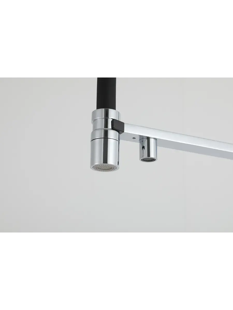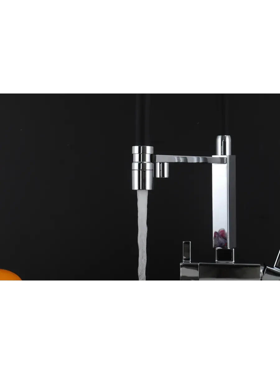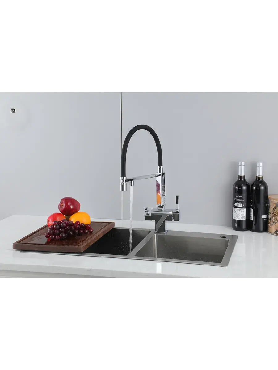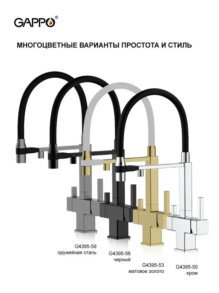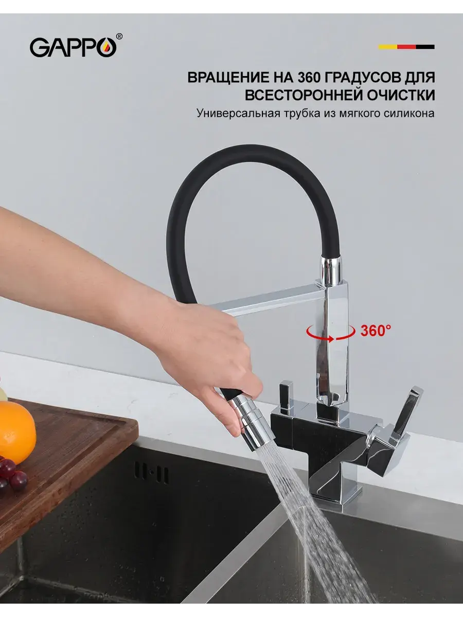 Смеситель для кухни с гибким изливом и подключением к фильтру Gappo G4395-50 в цвете хром – стильное и функциональное решение для вашей кухни. Модель оснащена гибким поворотным изливом высотой 48 см и длиной 23 см, что обеспечивает удобство использования при мытье посуды и заполнении емкостей. Встроенный фильтр и аэратор гарантируют чистую воду и экономию ее расхода. Двухрычажный механизм управления позволяет легко регулировать температуру и напор воды. Смеситель выполнен из латуни и силикона, что обеспечивает его прочность и долговечность.