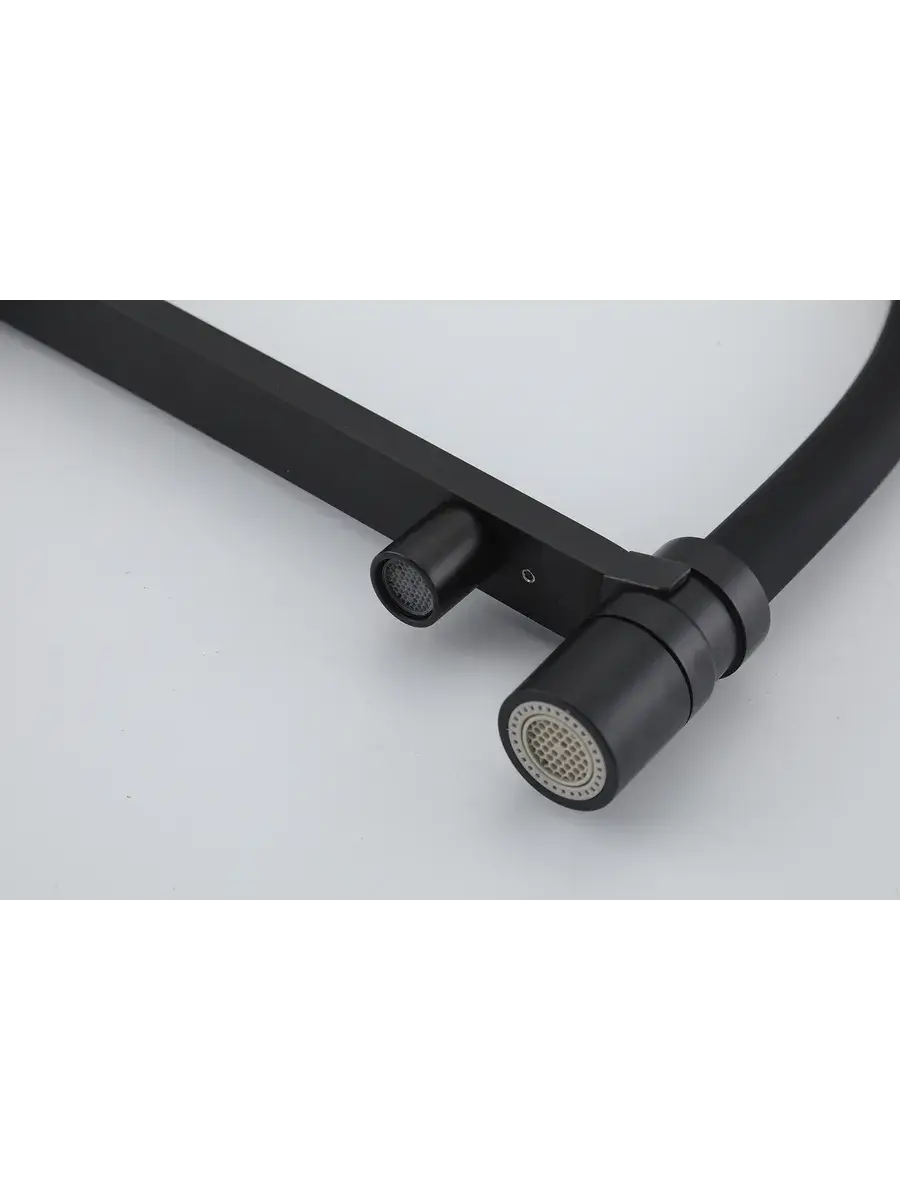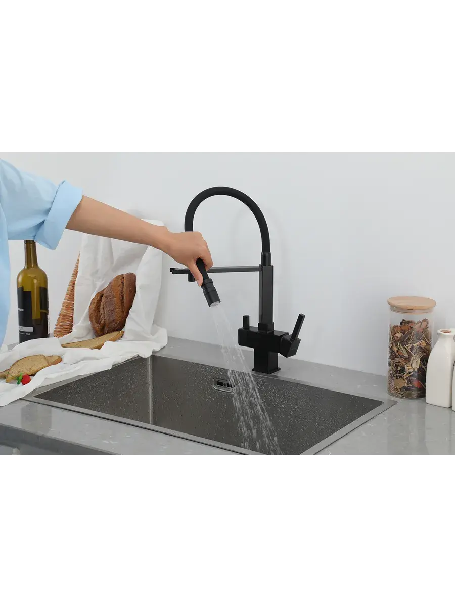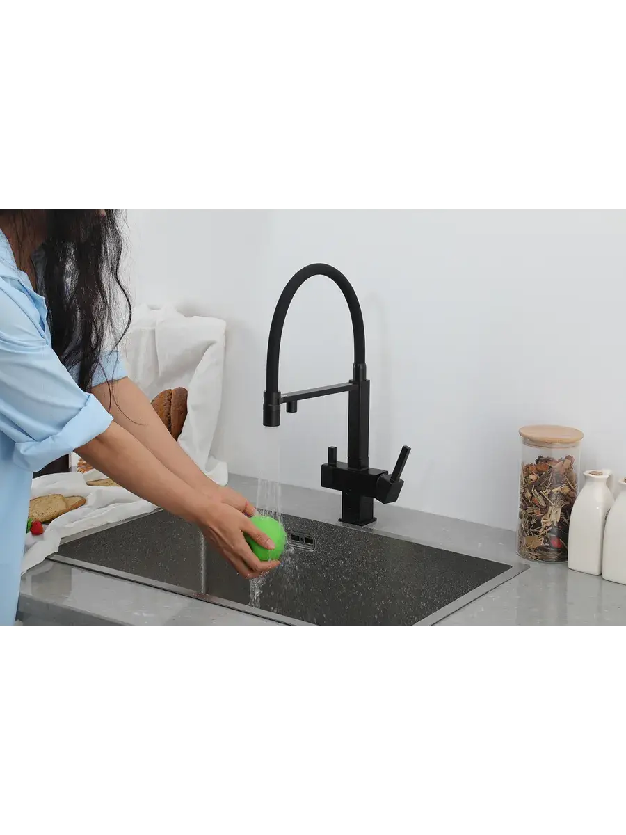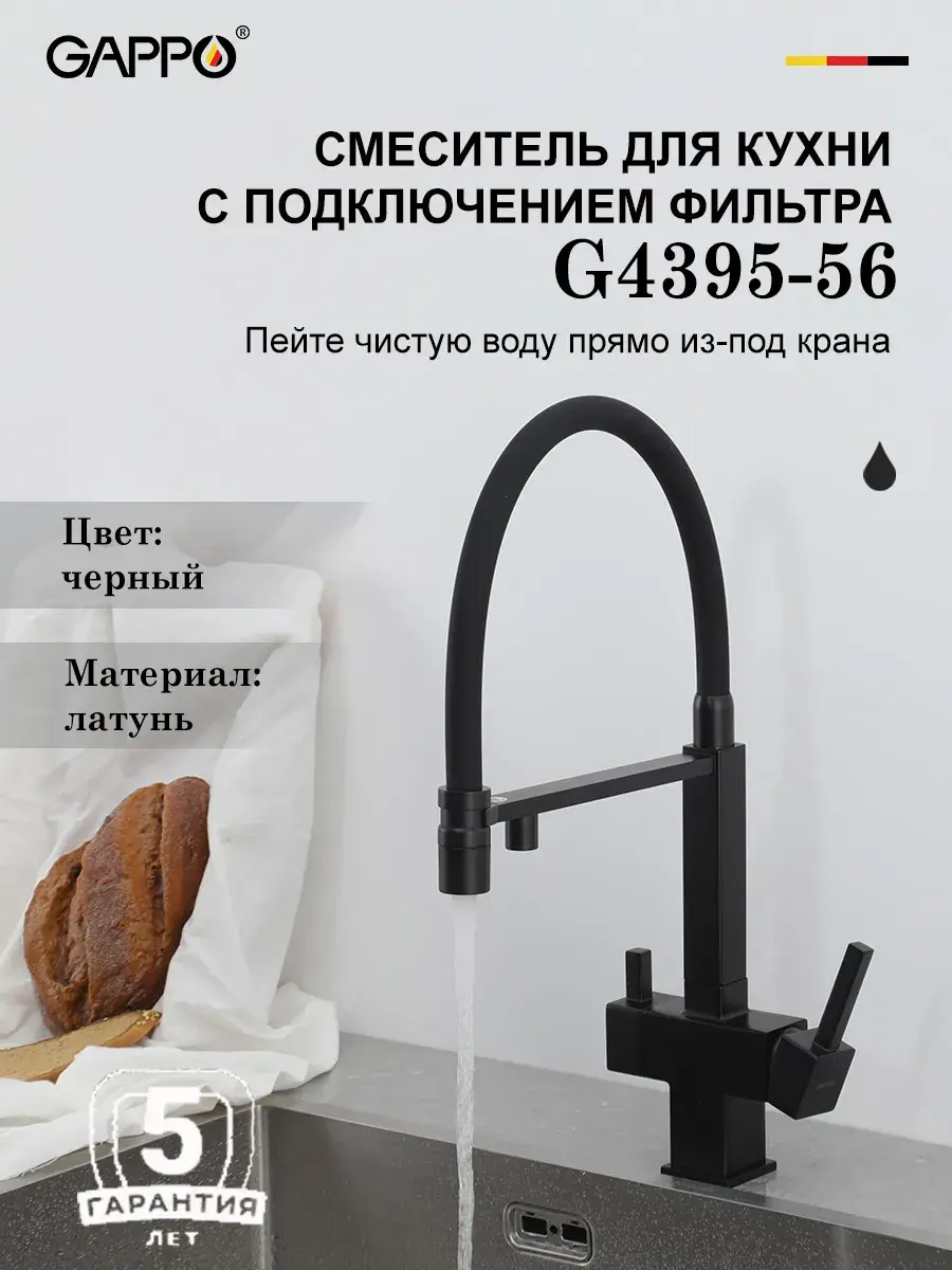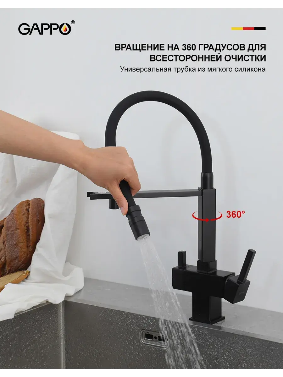 Смеситель для кухни с гибким изливом и подключением к фильтру Gappo G4395-56 в черном цвете – стильное и функциональное решение для вашей кухни. Модель оснащена гибким поворотным изливом высотой 48 см и длиной 23 см, что обеспечивает удобство использования при мытье посуды и заполнении емкостей. Встроенный фильтр и аэратор гарантируют чистую воду и экономию ее расхода. Двухрычажный механизм управления позволяет легко регулировать температуру и напор воды. Смеситель выполнен из латуни и силикона, что обеспечивает его прочность и долговечность.