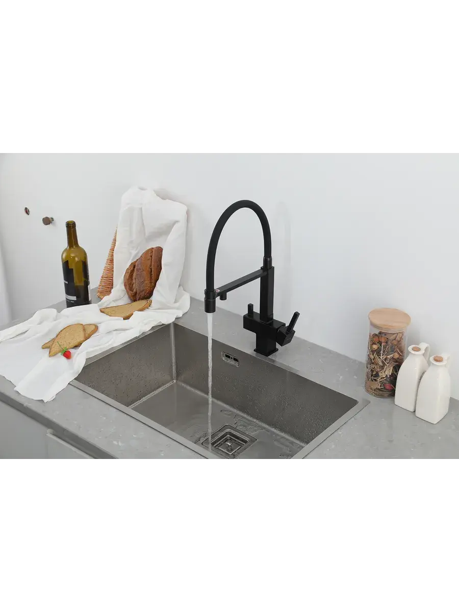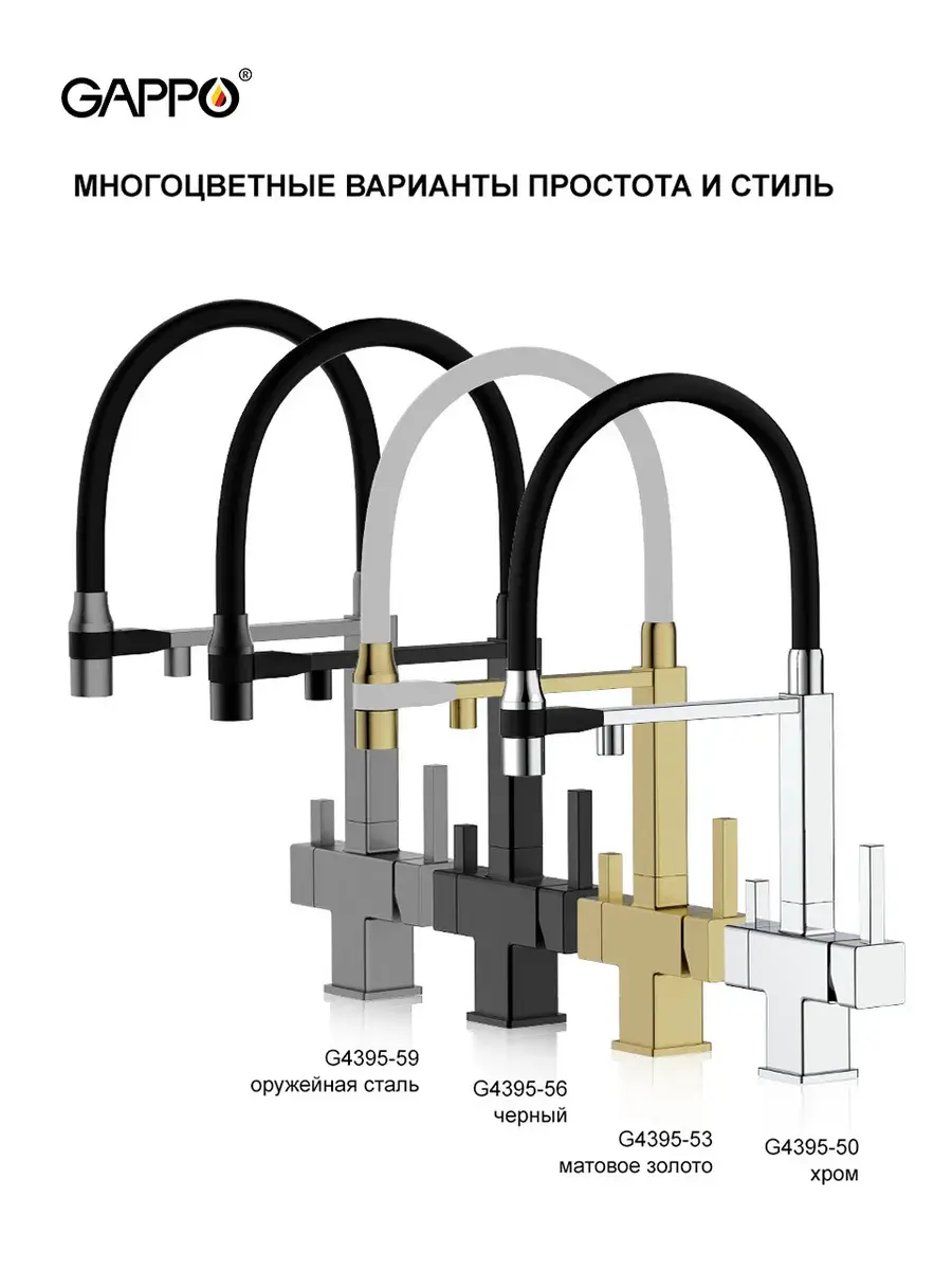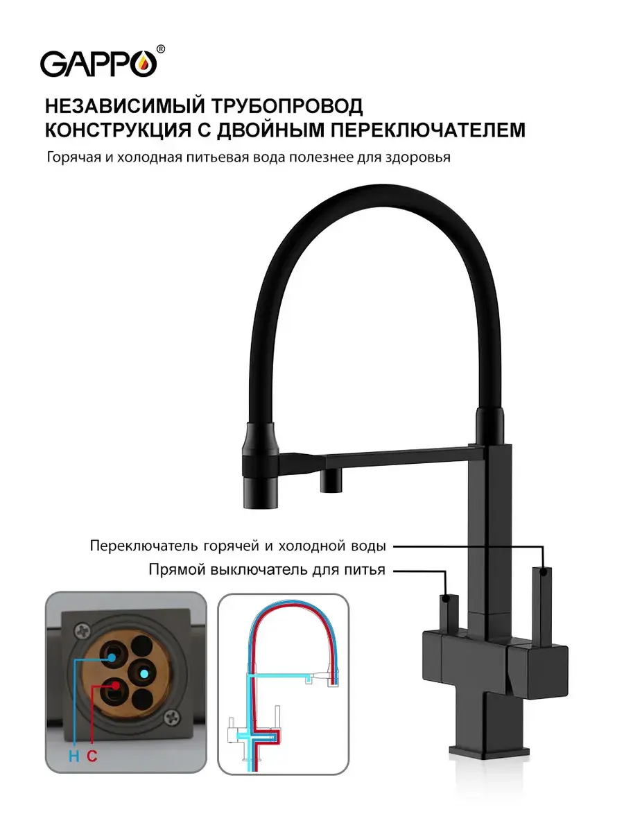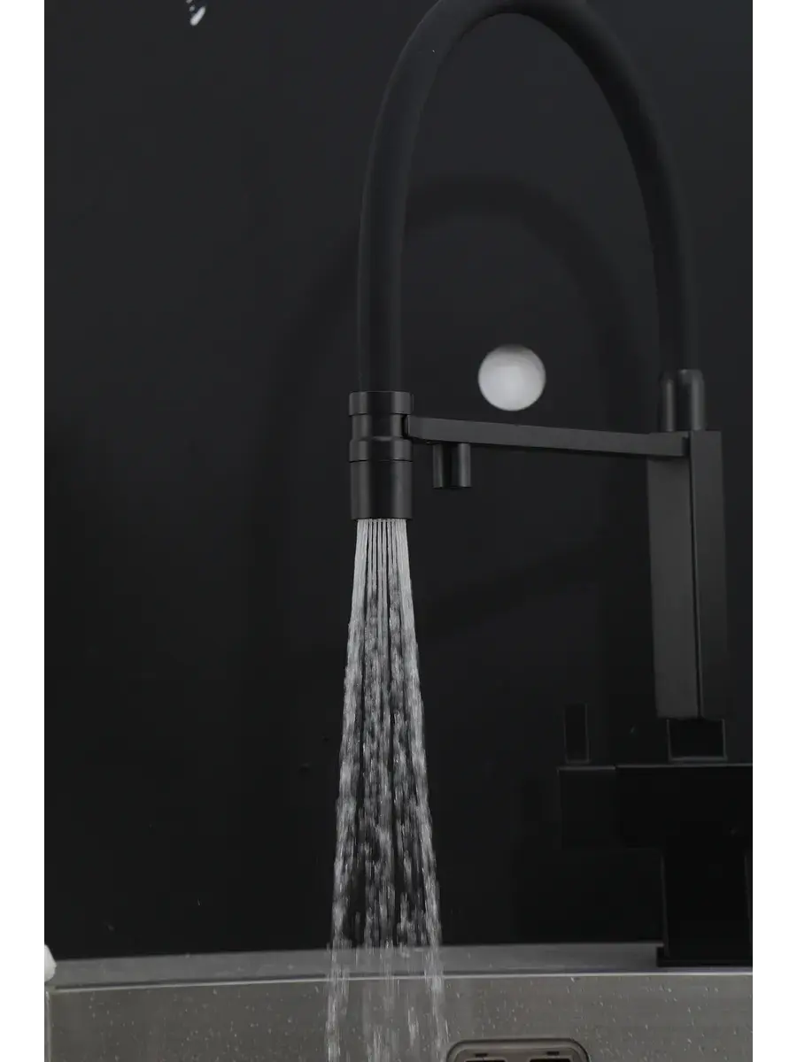 Смеситель для кухни с гибким изливом и подключением к фильтру Gappo G4395-56 в черном цвете – стильное и функциональное решение для вашей кухни. Модель оснащена гибким поворотным изливом высотой 48 см и длиной 23 см, что обеспечивает удобство использования при мытье посуды и заполнении емкостей. Встроенный фильтр и аэратор гарантируют чистую воду и экономию ее расхода. Двухрычажный механизм управления позволяет легко регулировать температуру и напор воды. Смеситель выполнен из латуни и силикона, что обеспечивает его прочность и долговечность.