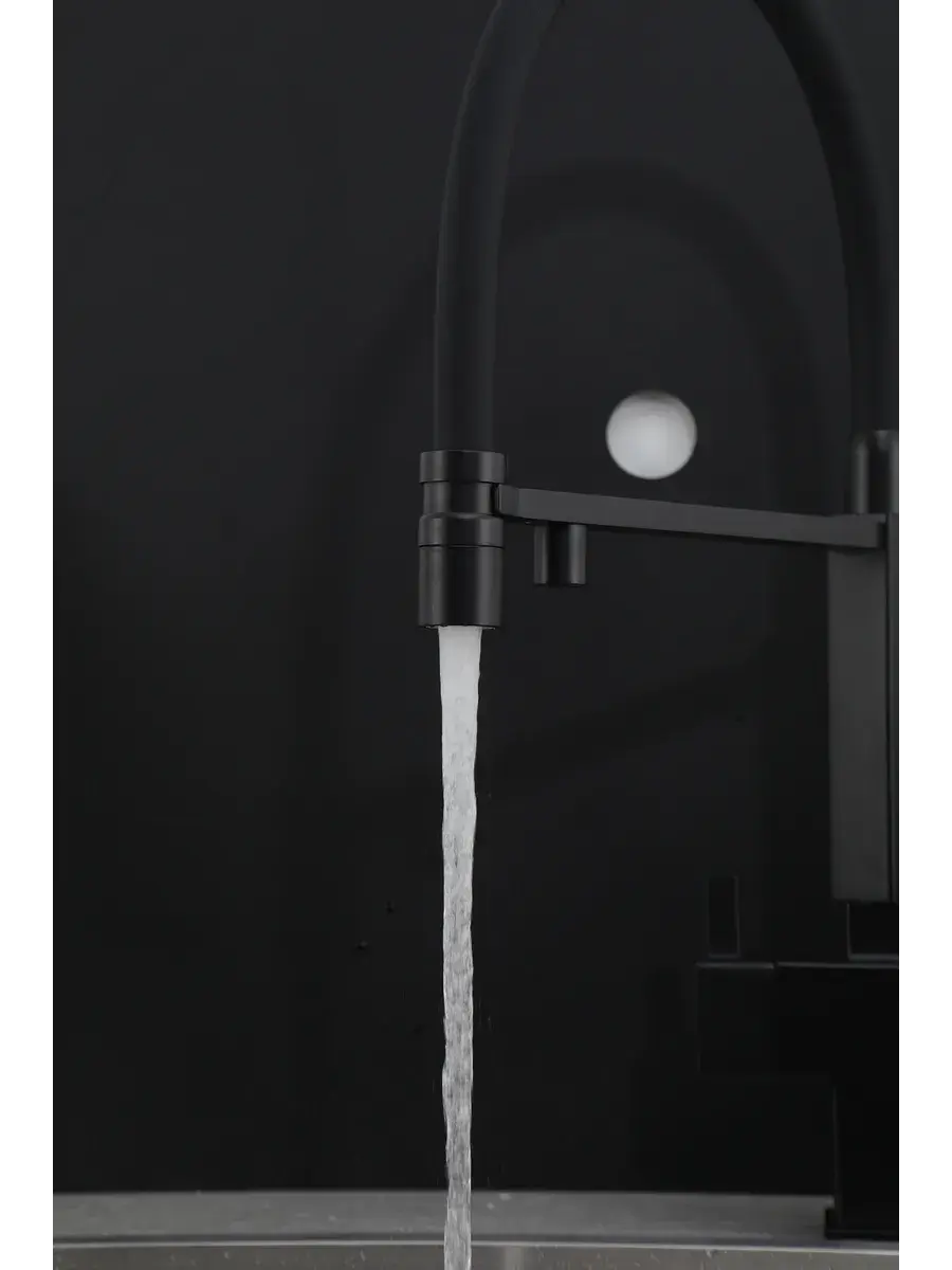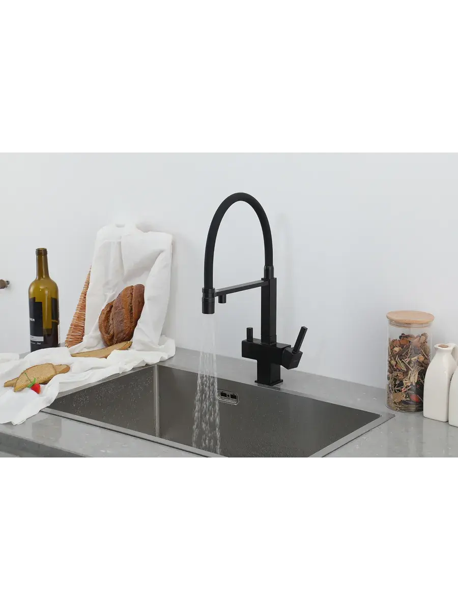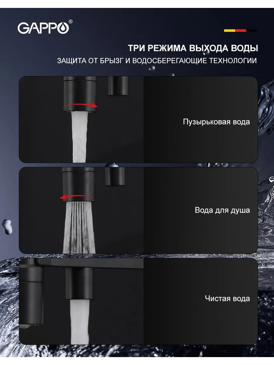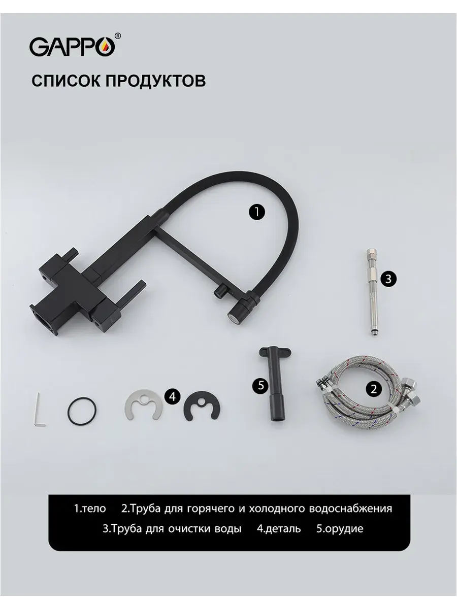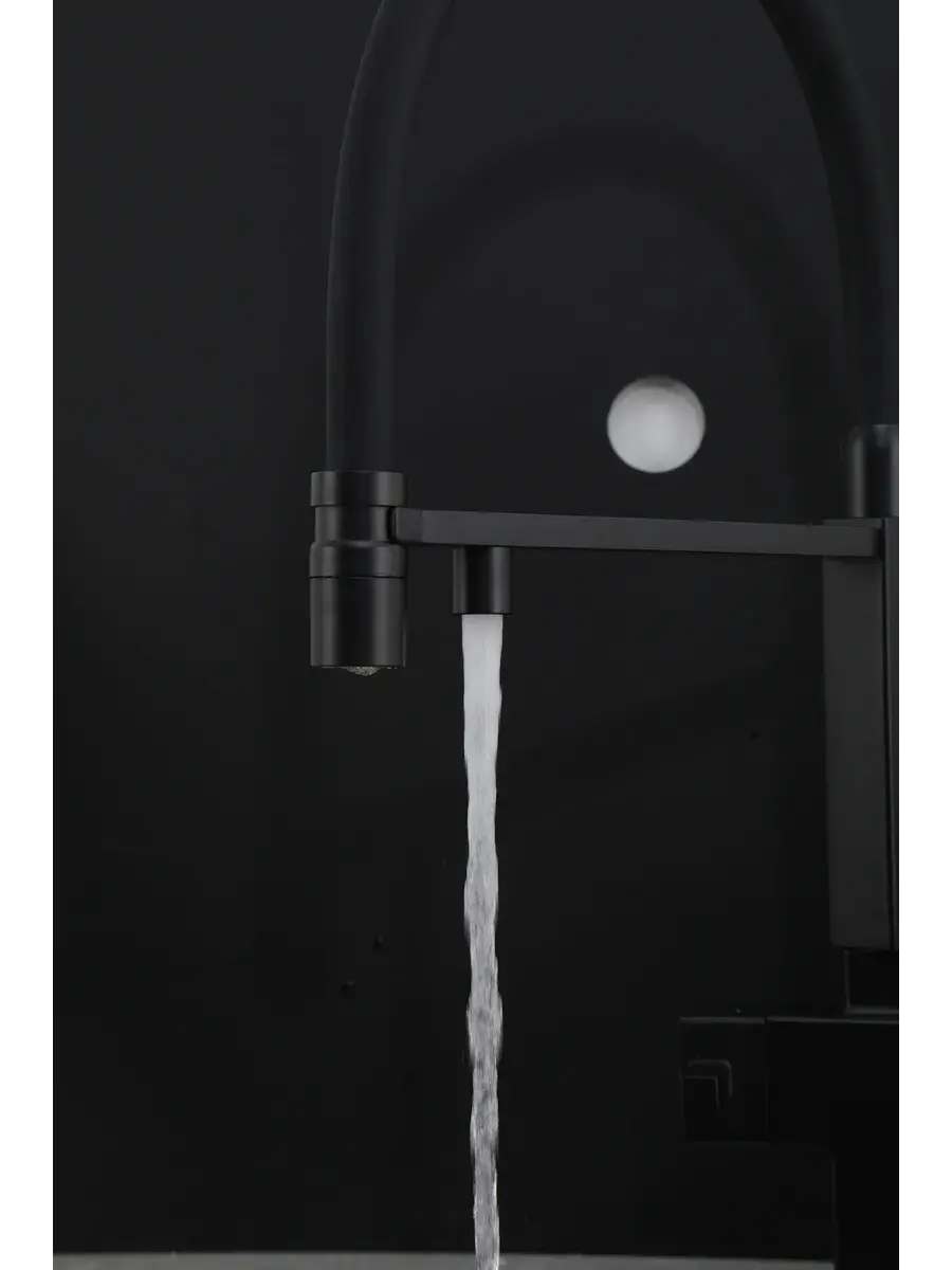 Смеситель для кухни с гибким изливом и подключением к фильтру Gappo G4395-56 в черном цвете – стильное и функциональное решение для вашей кухни. Модель оснащена гибким поворотным изливом высотой 48 см и длиной 23 см, что обеспечивает удобство использования при мытье посуды и заполнении емкостей. Встроенный фильтр и аэратор гарантируют чистую воду и экономию ее расхода. Двухрычажный механизм управления позволяет легко регулировать температуру и напор воды. Смеситель выполнен из латуни и силикона, что обеспечивает его прочность и долговечность.