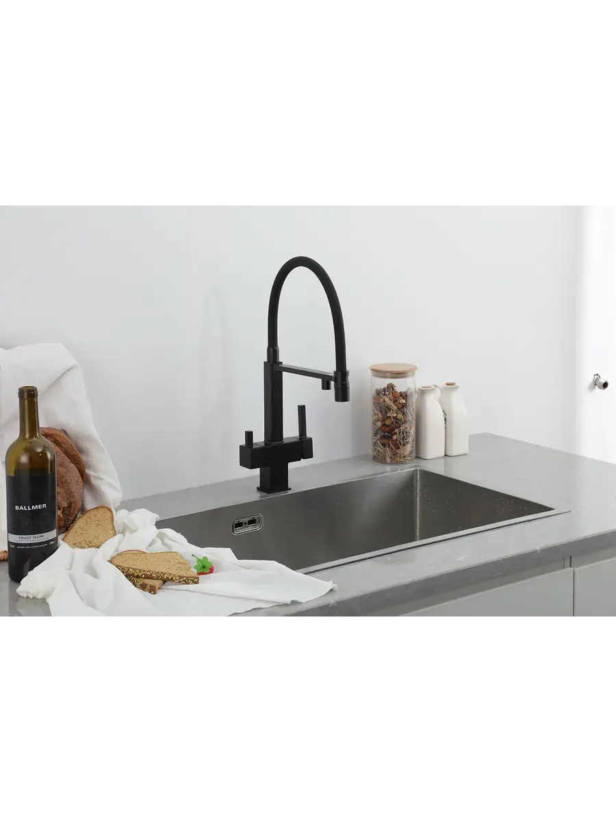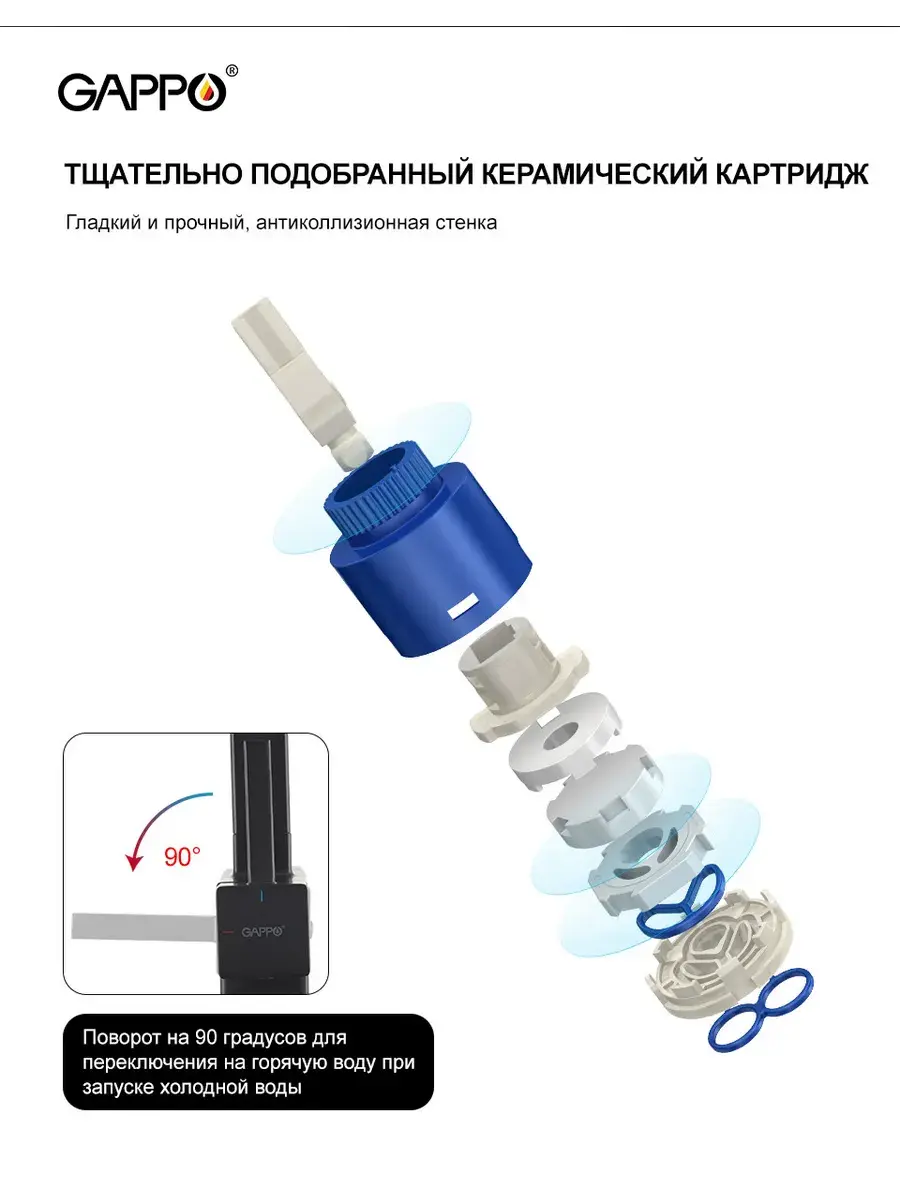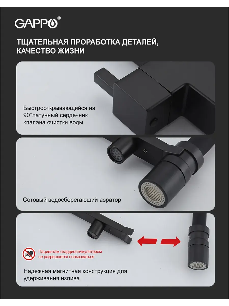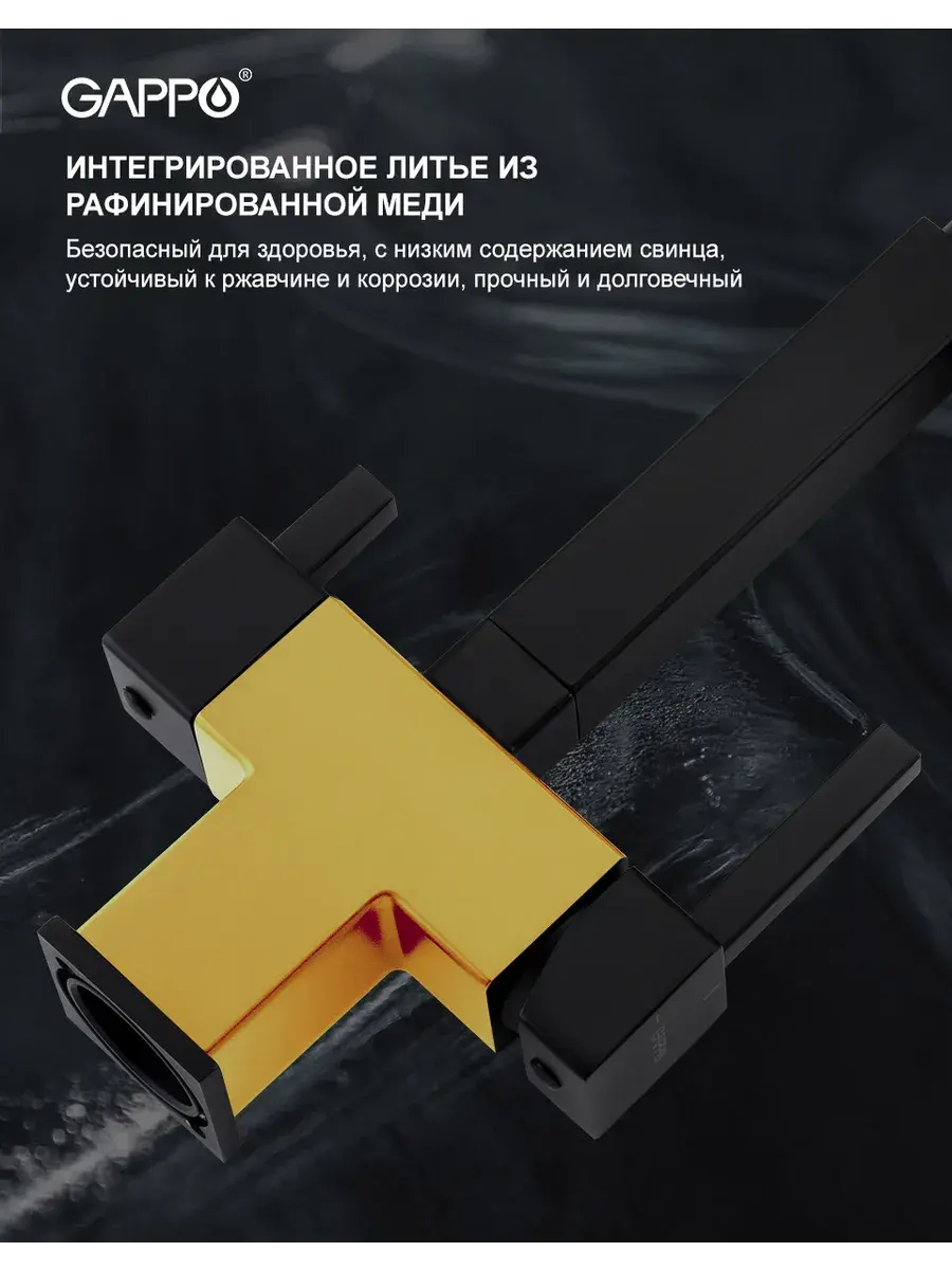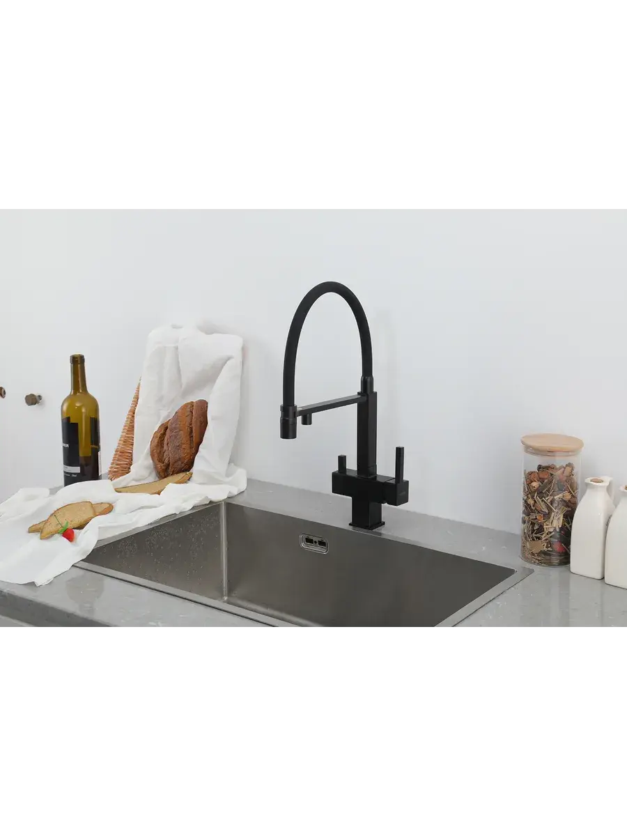 Смеситель для кухни с гибким изливом и подключением к фильтру Gappo G4395-56 в черном цвете – стильное и функциональное решение для вашей кухни. Модель оснащена гибким поворотным изливом высотой 48 см и длиной 23 см, что обеспечивает удобство использования при мытье посуды и заполнении емкостей. Встроенный фильтр и аэратор гарантируют чистую воду и экономию ее расхода. Двухрычажный механизм управления позволяет легко регулировать температуру и напор воды. Смеситель выполнен из латуни и силикона, что обеспечивает его прочность и долговечность.