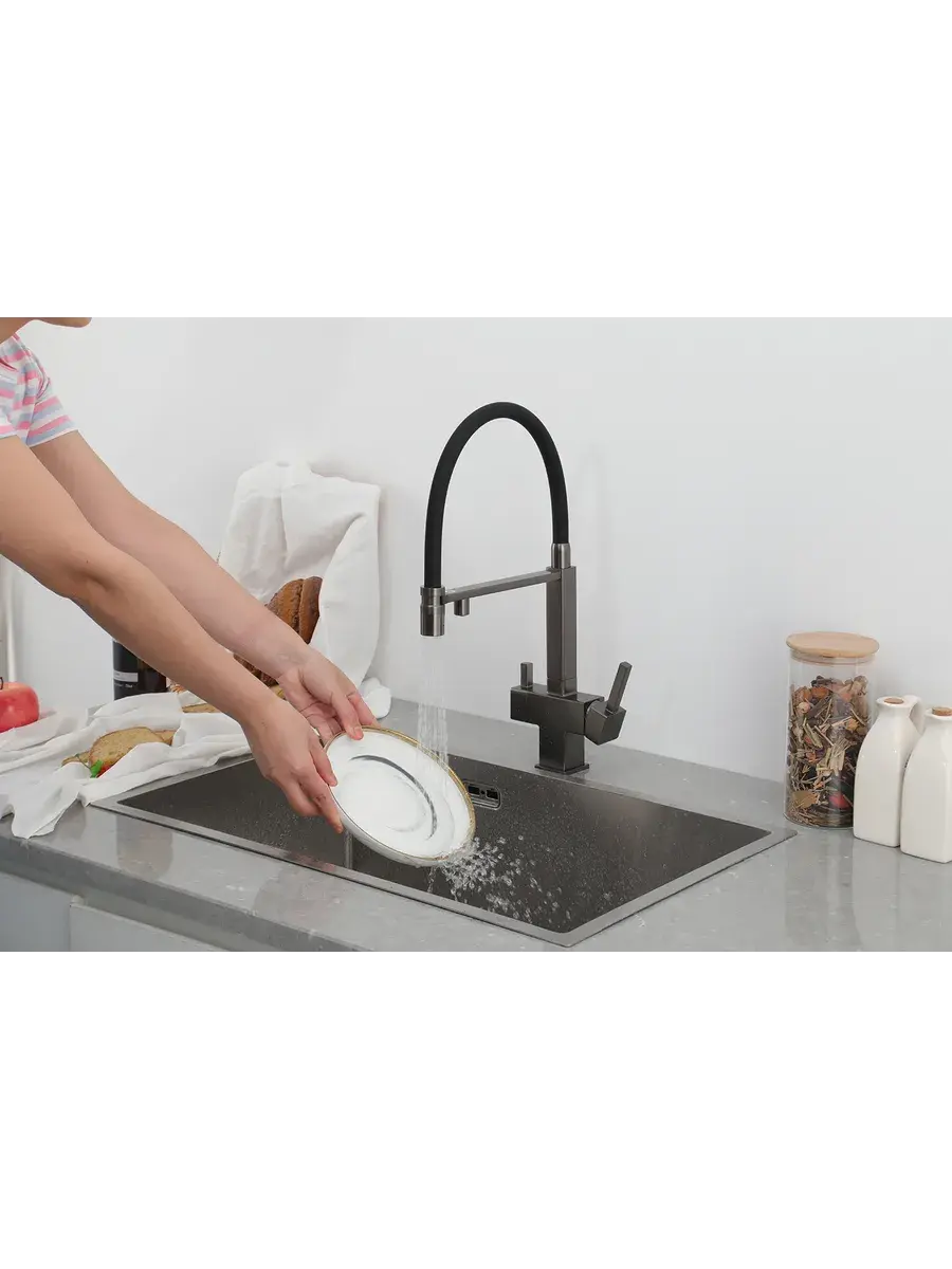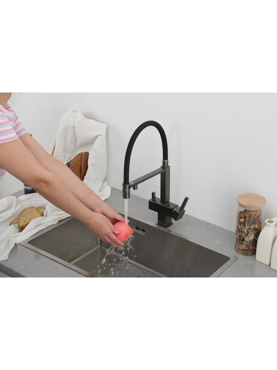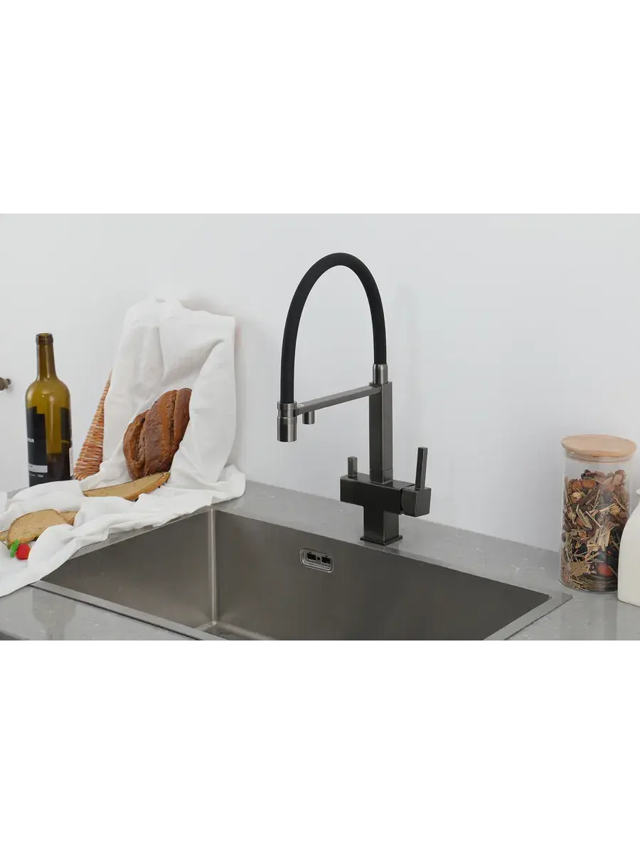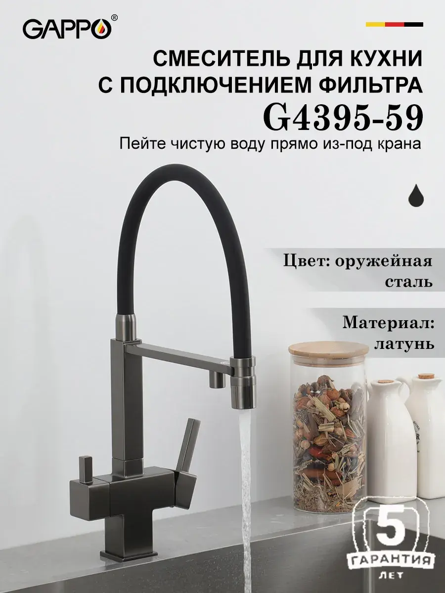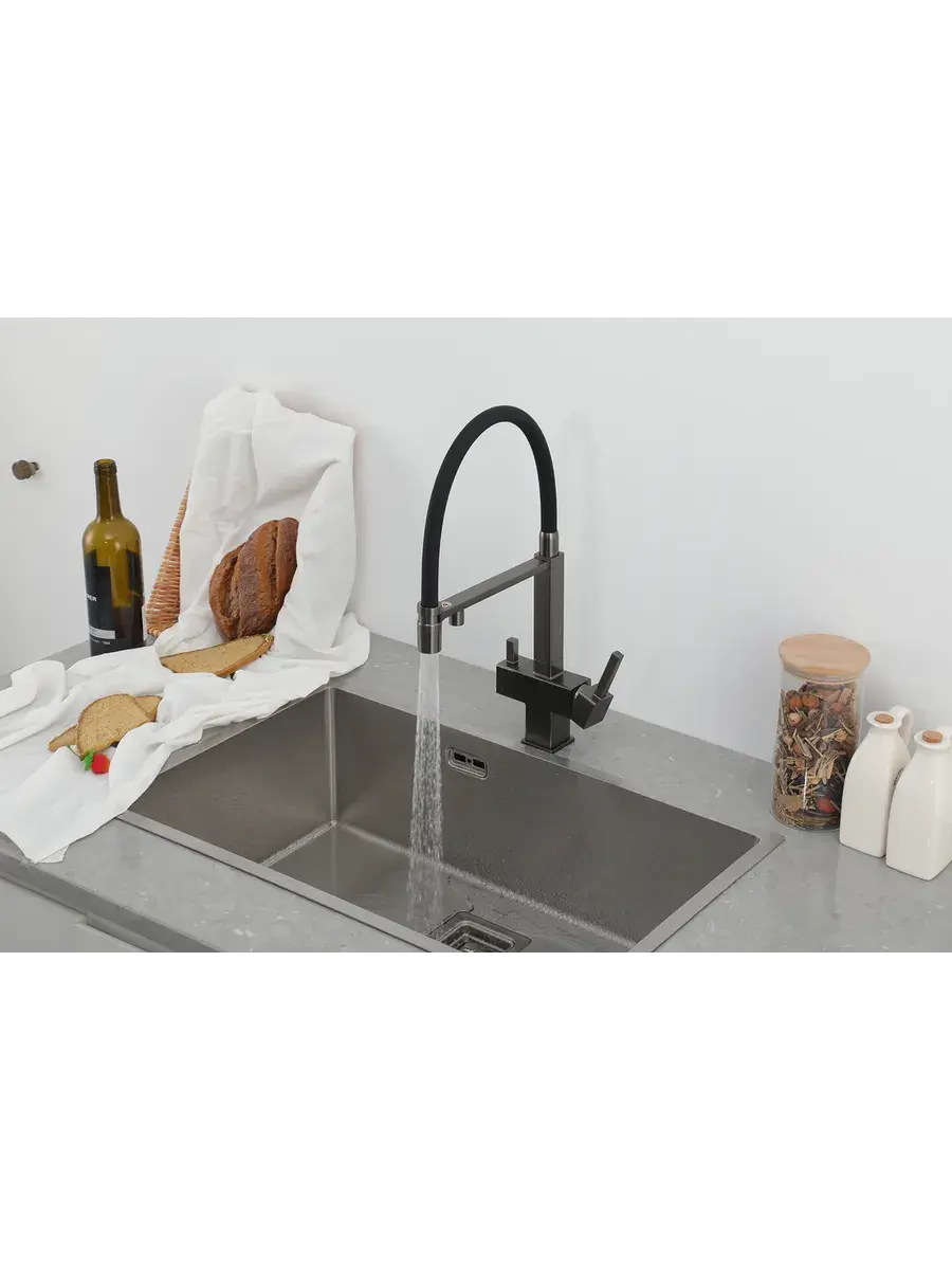 Смеситель для кухни с гибким изливом и подключением к фильтру Gappo G4395-59 в цвете оружейная сталь – стильное и функциональное решение для вашей кухни. Модель оснащена гибким поворотным изливом высотой 48 см и длиной 23 см, что обеспечивает удобство использования при мытье посуды и заполнении емкостей. Встроенный фильтр и аэратор гарантируют чистую воду и экономию ее расхода. Двухрычажный механизм управления позволяет легко регулировать температуру и напор воды. Смеситель выполнен из латуни и силикона, что обеспечивает его прочность и долговечность.
