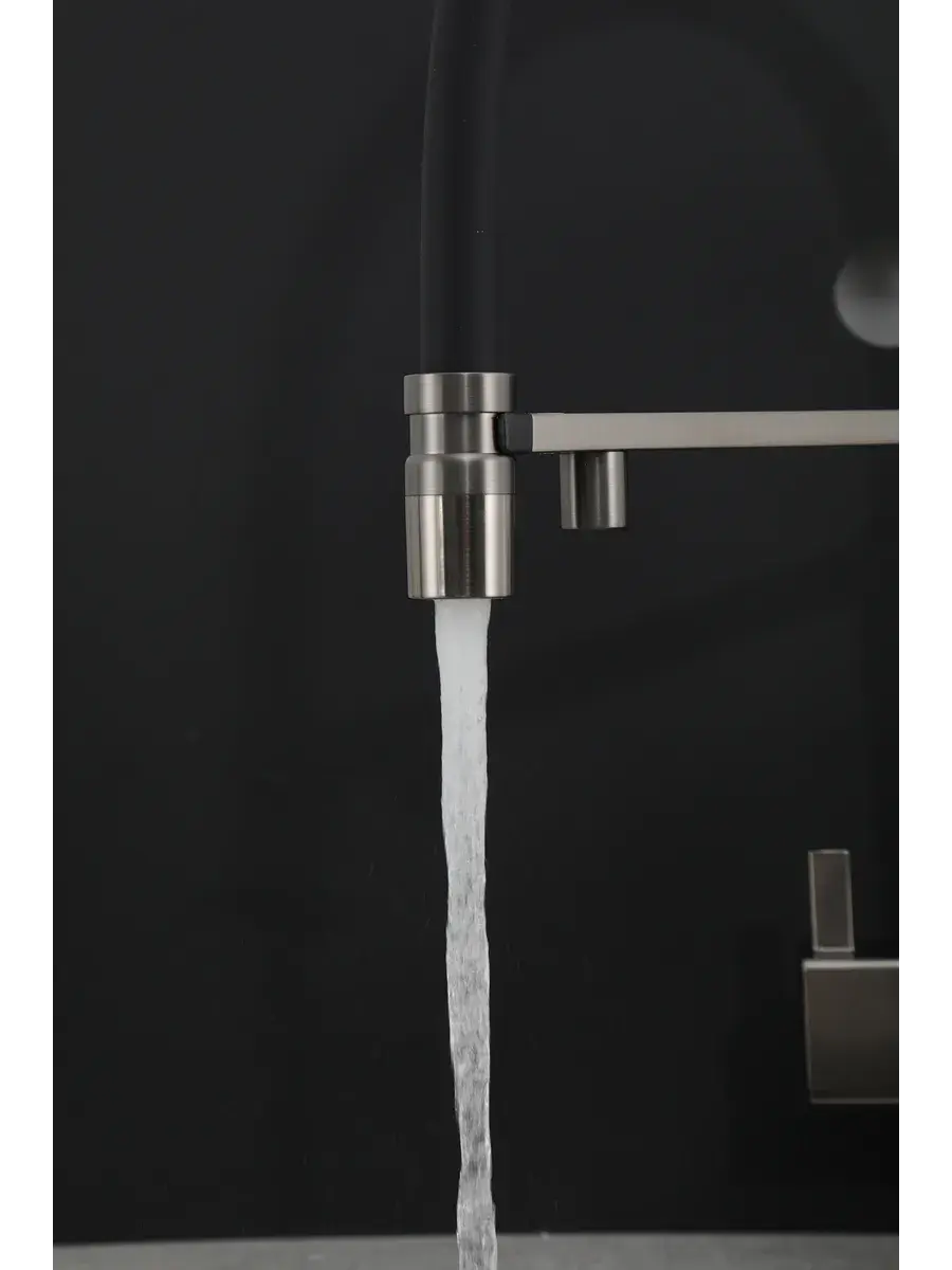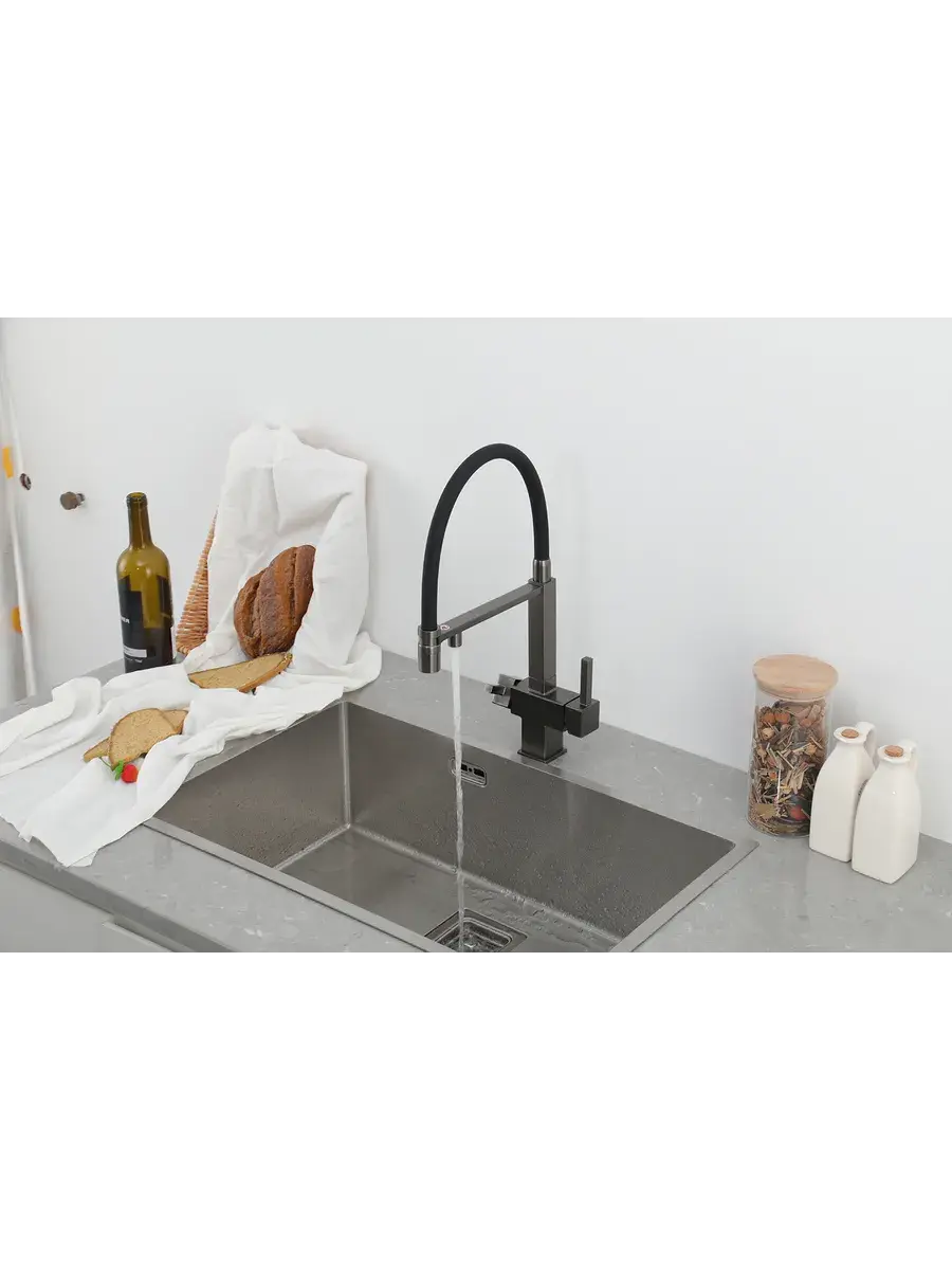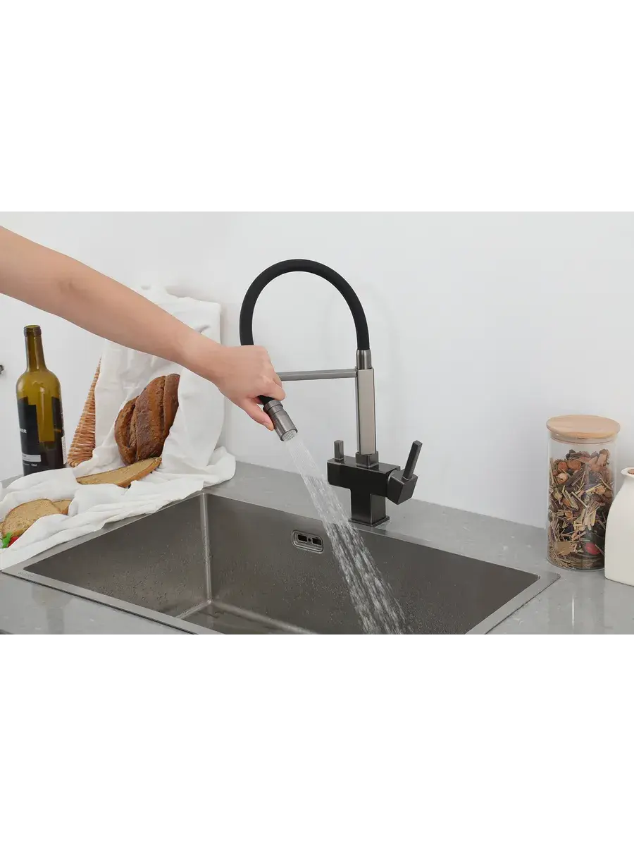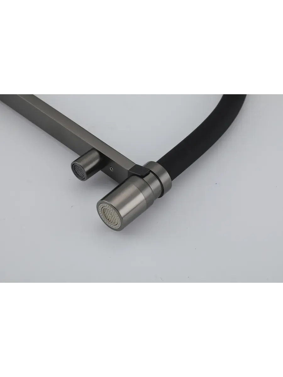 Смеситель для кухни с гибким изливом и подключением к фильтру Gappo G4395-59 в цвете оружейная сталь – стильное и функциональное решение для вашей кухни. Модель оснащена гибким поворотным изливом высотой 48 см и длиной 23 см, что обеспечивает удобство использования при мытье посуды и заполнении емкостей. Встроенный фильтр и аэратор гарантируют чистую воду и экономию ее расхода. Двухрычажный механизм управления позволяет легко регулировать температуру и напор воды. Смеситель выполнен из латуни и силикона, что обеспечивает его прочность и долговечность.