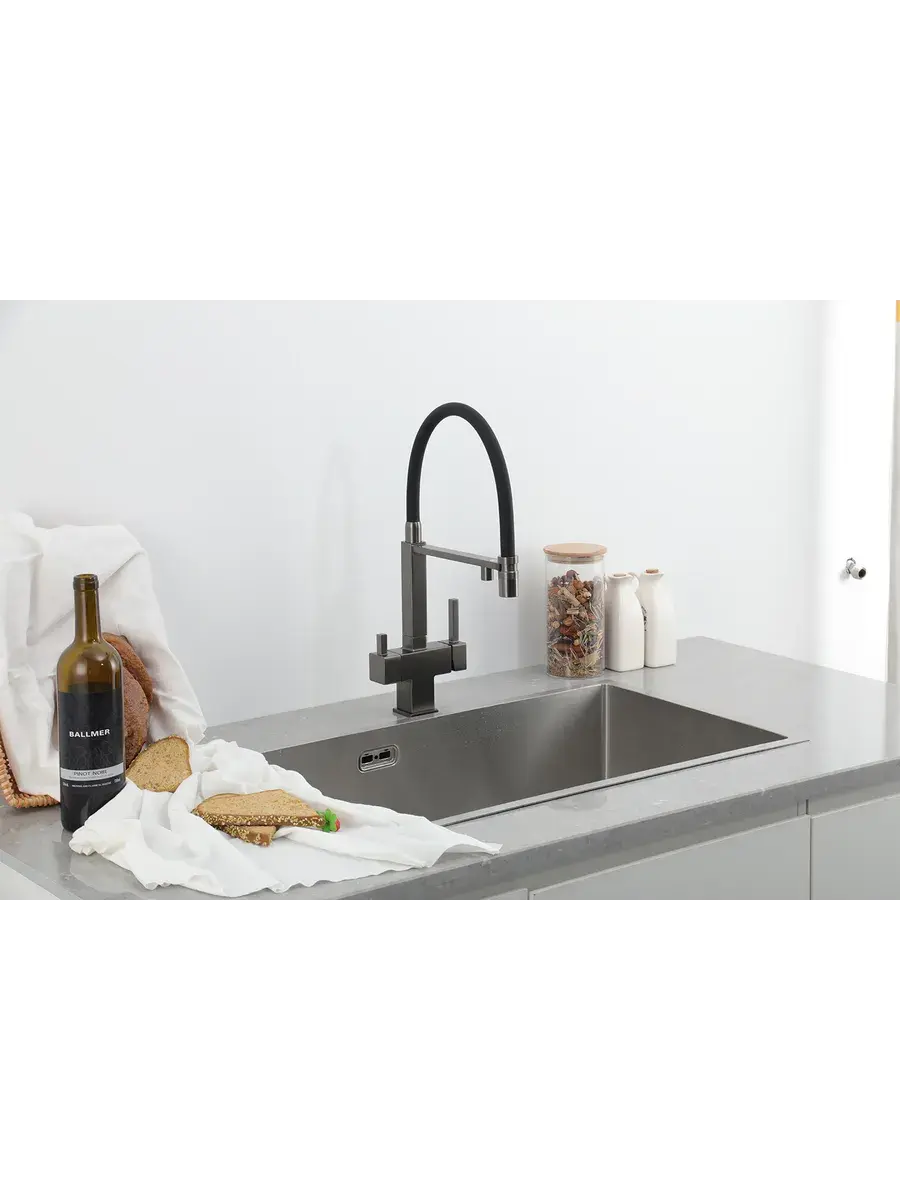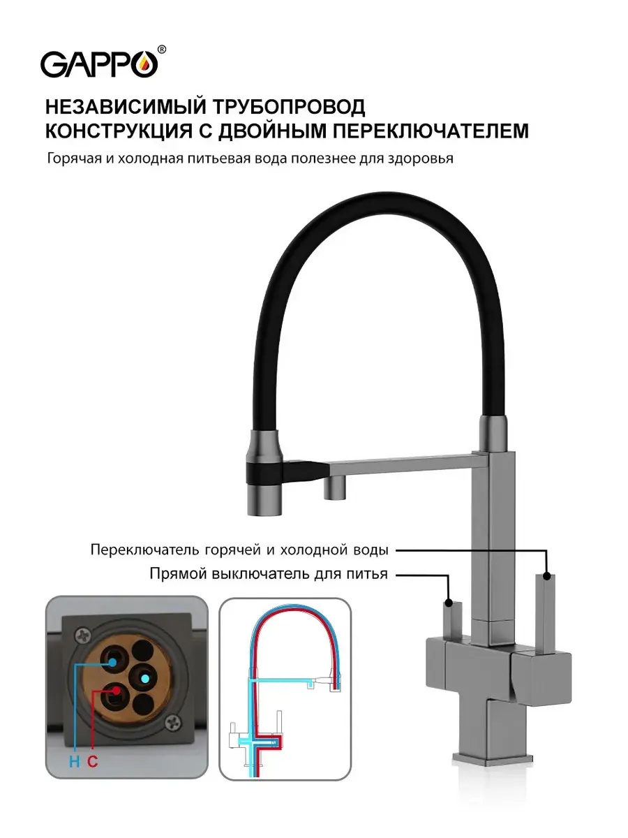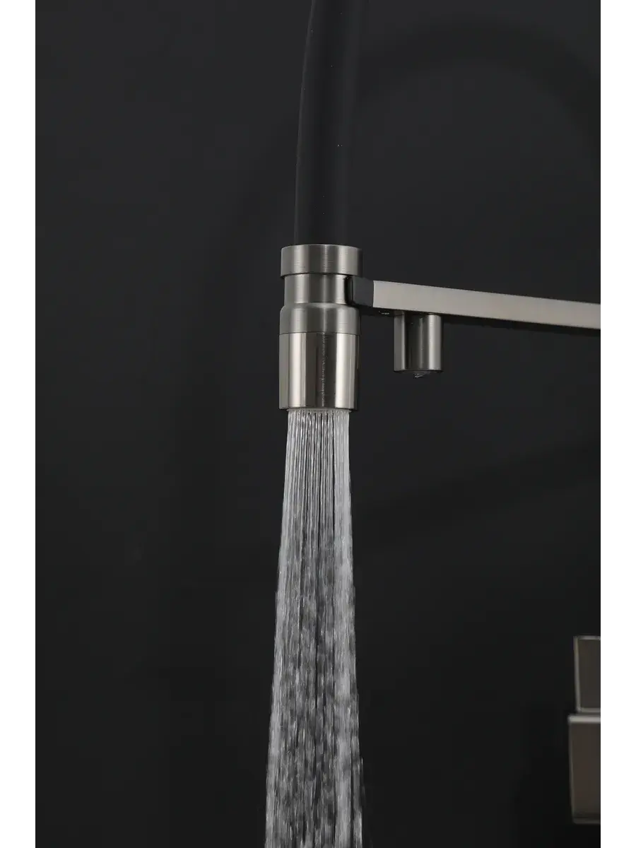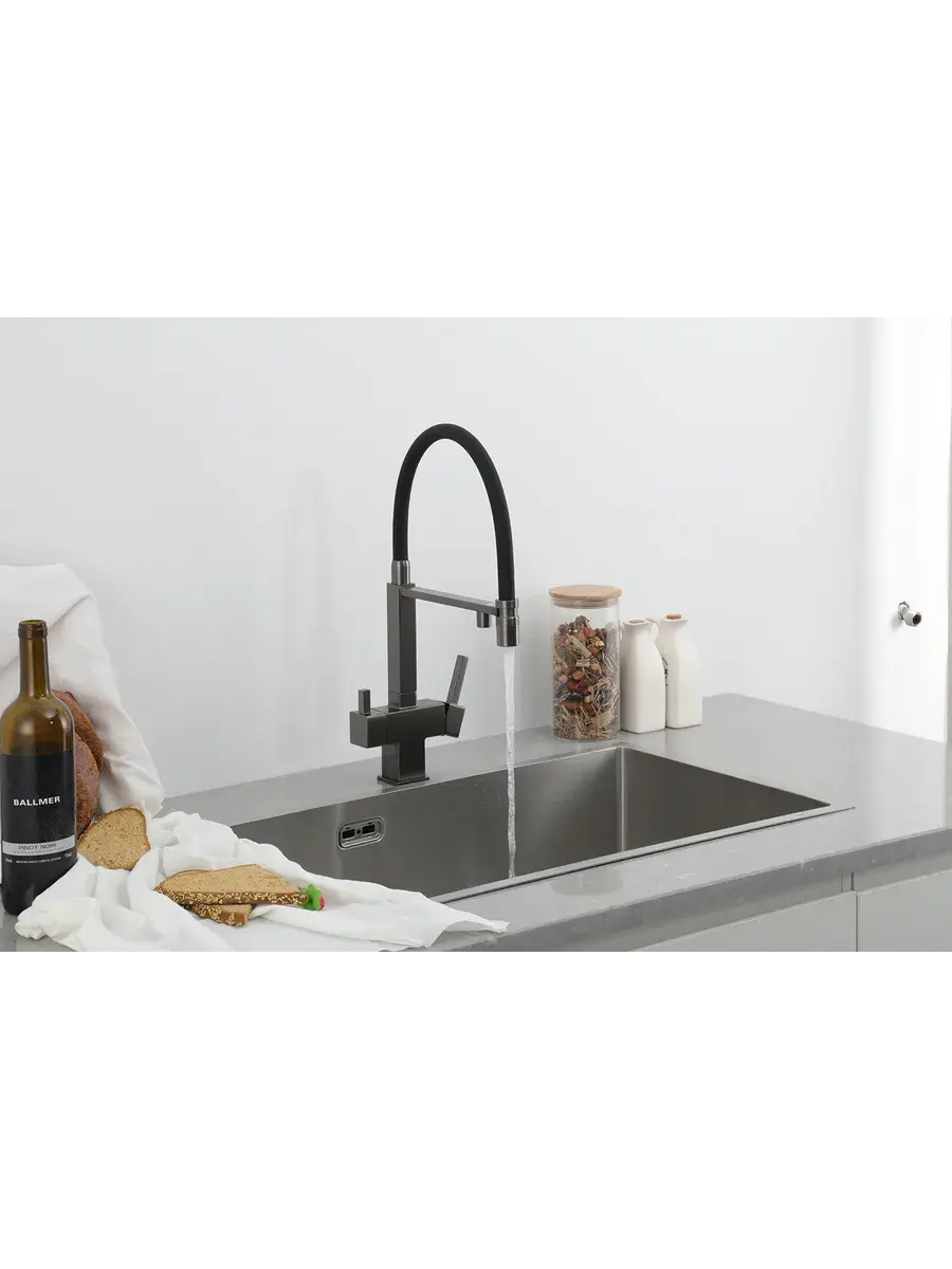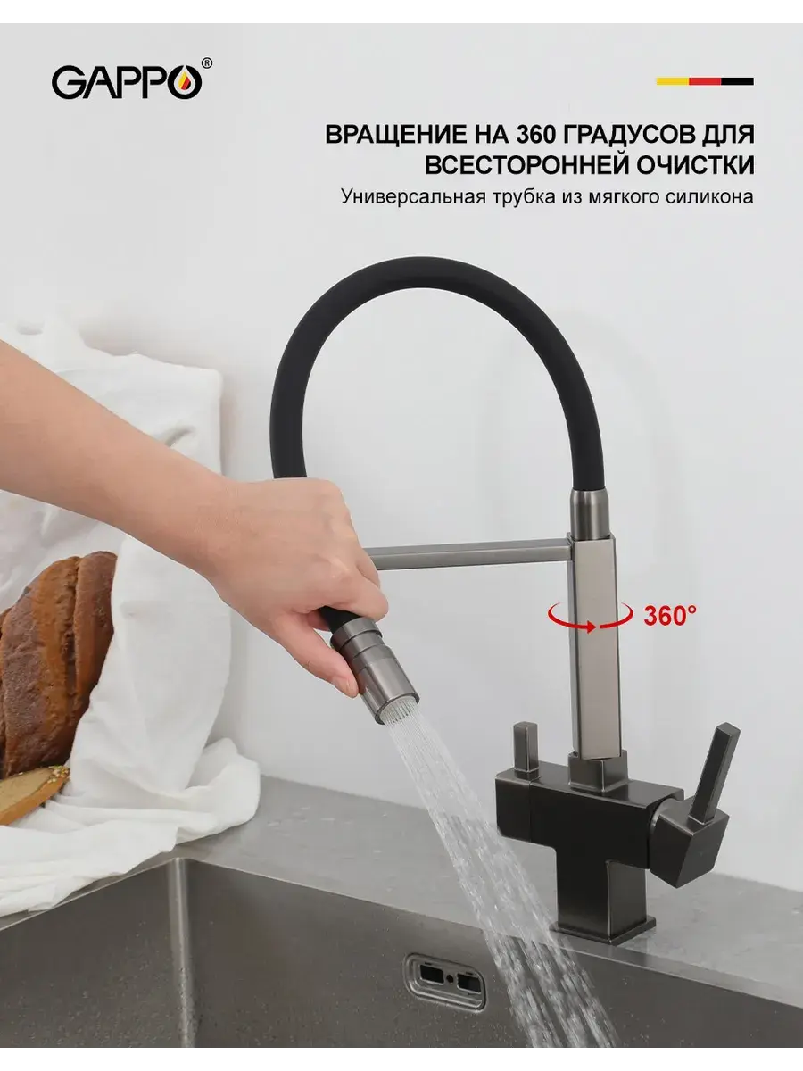 Смеситель для кухни с гибким изливом и подключением к фильтру Gappo G4395-59 в цвете оружейная сталь – стильное и функциональное решение для вашей кухни. Модель оснащена гибким поворотным изливом высотой 48 см и длиной 23 см, что обеспечивает удобство использования при мытье посуды и заполнении емкостей. Встроенный фильтр и аэратор гарантируют чистую воду и экономию ее расхода. Двухрычажный механизм управления позволяет легко регулировать температуру и напор воды. Смеситель выполнен из латуни и силикона, что обеспечивает его прочность и долговечность.