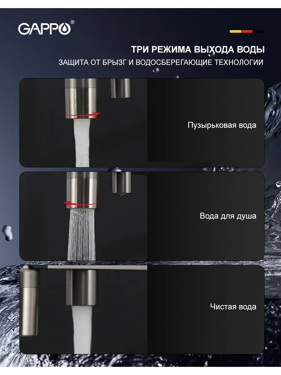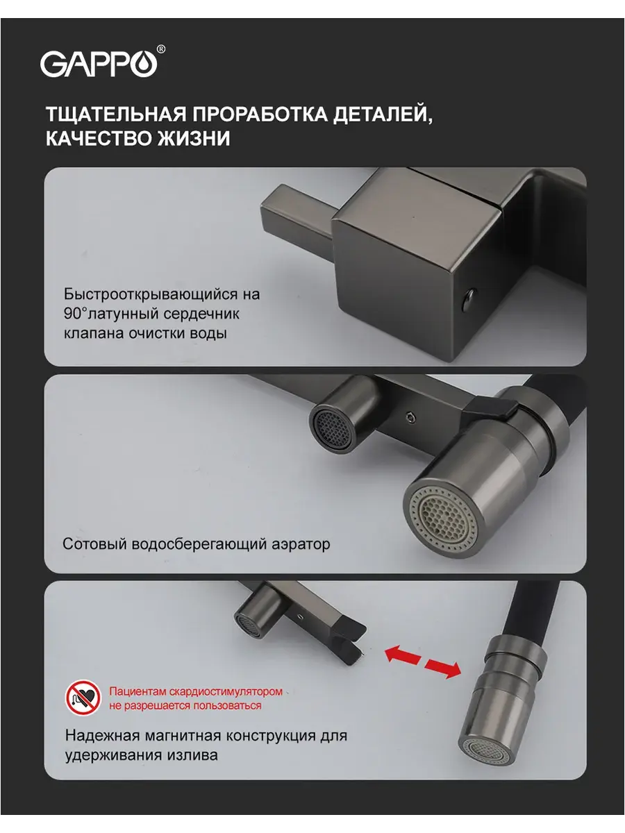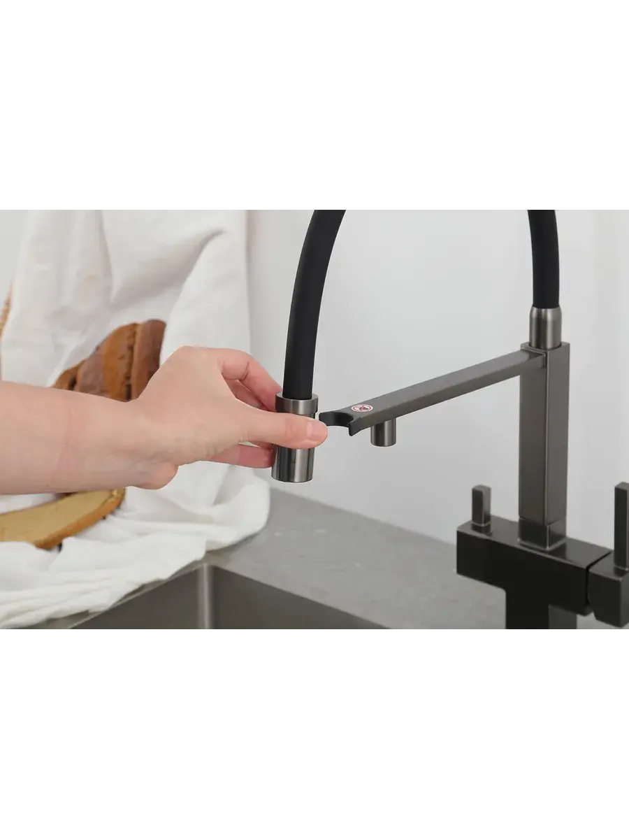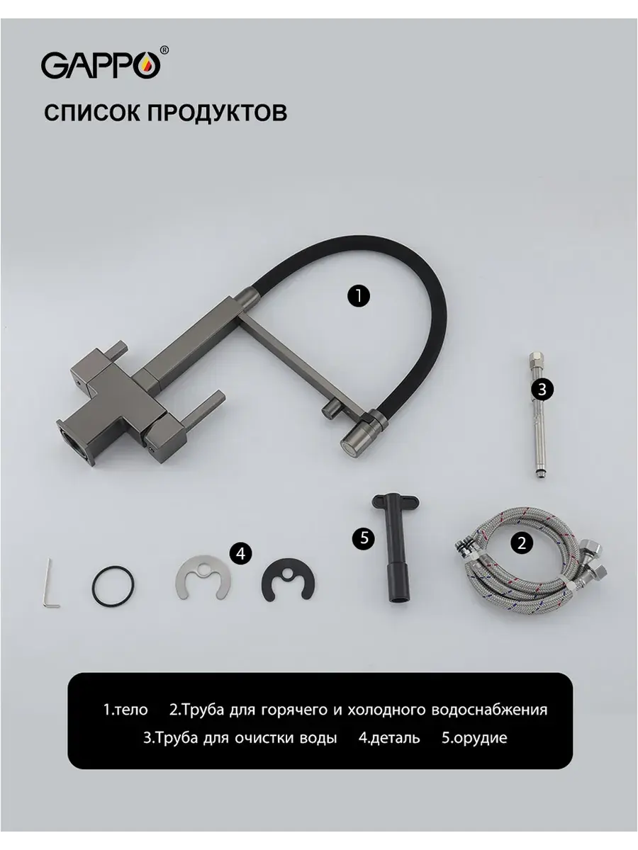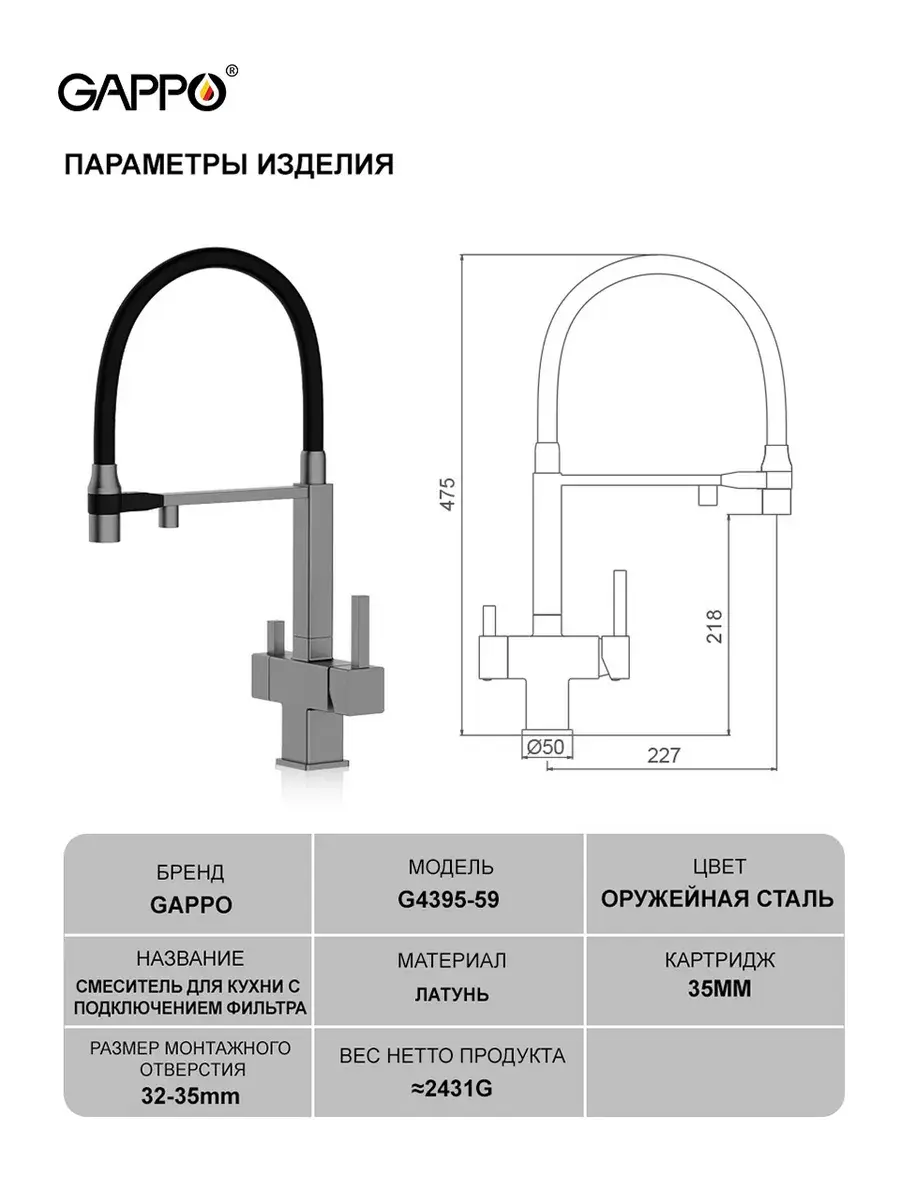 Смеситель для кухни с гибким изливом и подключением к фильтру Gappo G4395-59 в цвете оружейная сталь – стильное и функциональное решение для вашей кухни. Модель оснащена гибким поворотным изливом высотой 48 см и длиной 23 см, что обеспечивает удобство использования при мытье посуды и заполнении емкостей. Встроенный фильтр и аэратор гарантируют чистую воду и экономию ее расхода. Двухрычажный механизм управления позволяет легко регулировать температуру и напор воды. Смеситель выполнен из латуни и силикона, что обеспечивает его прочность и долговечность.