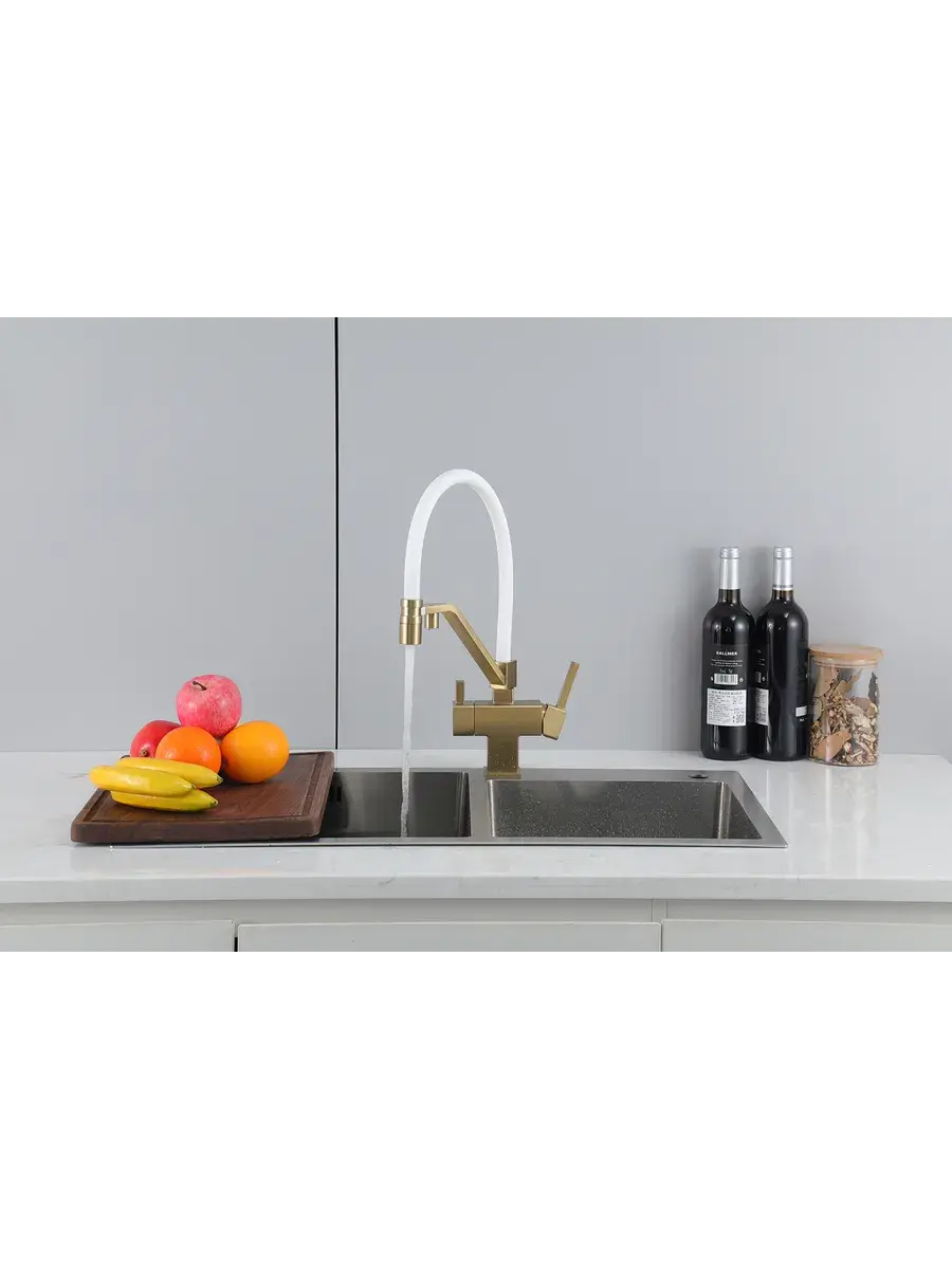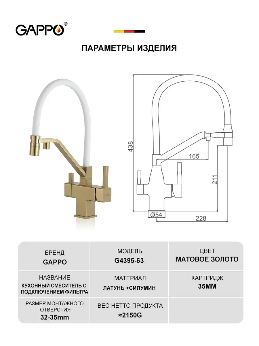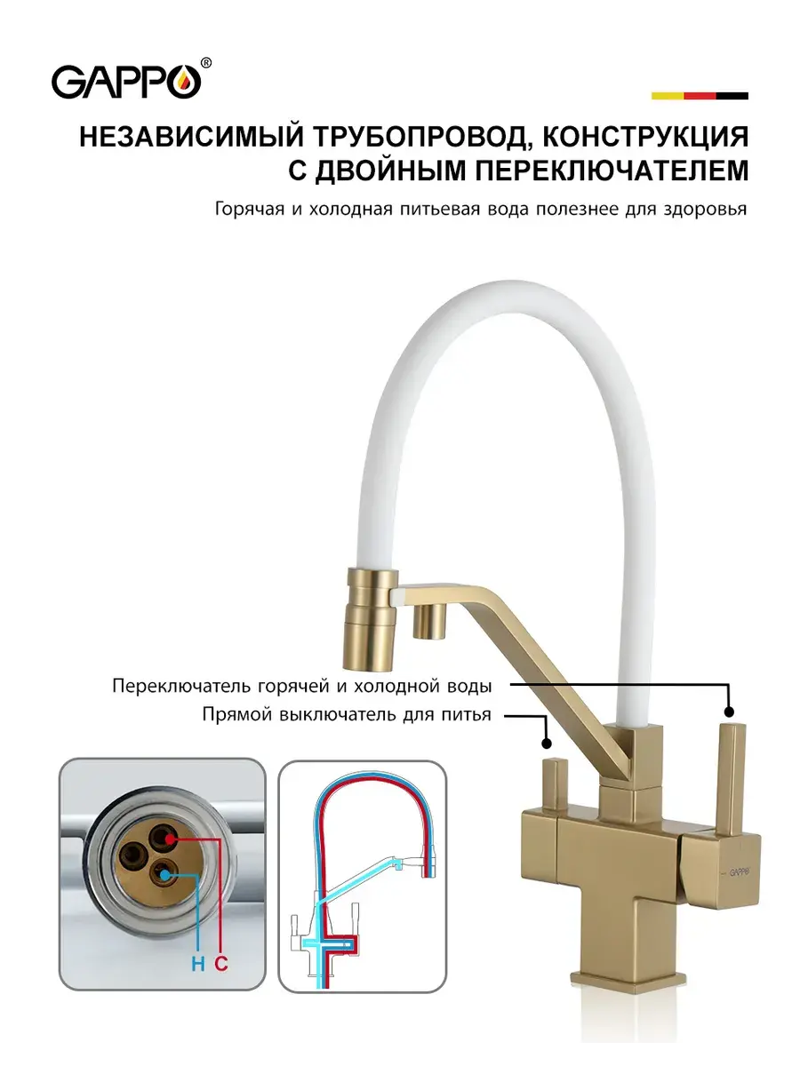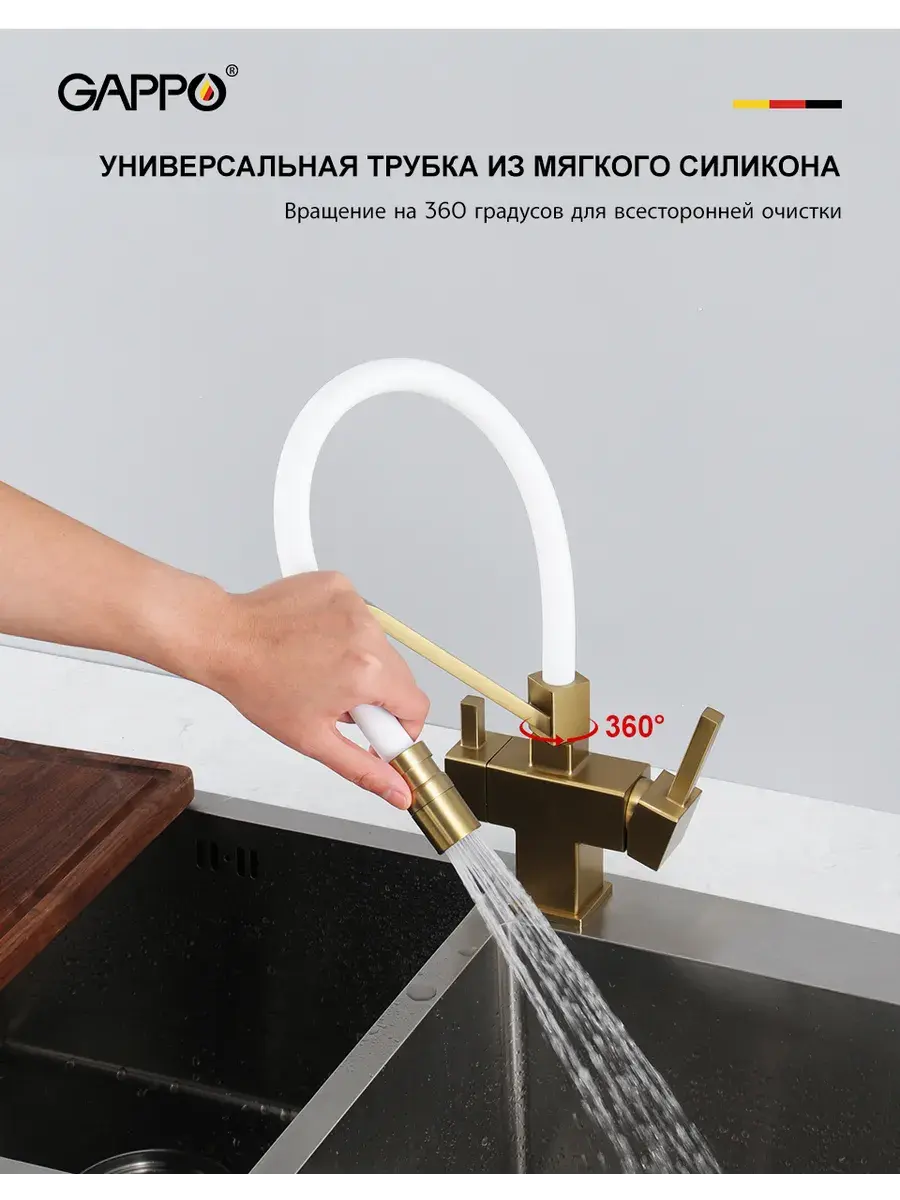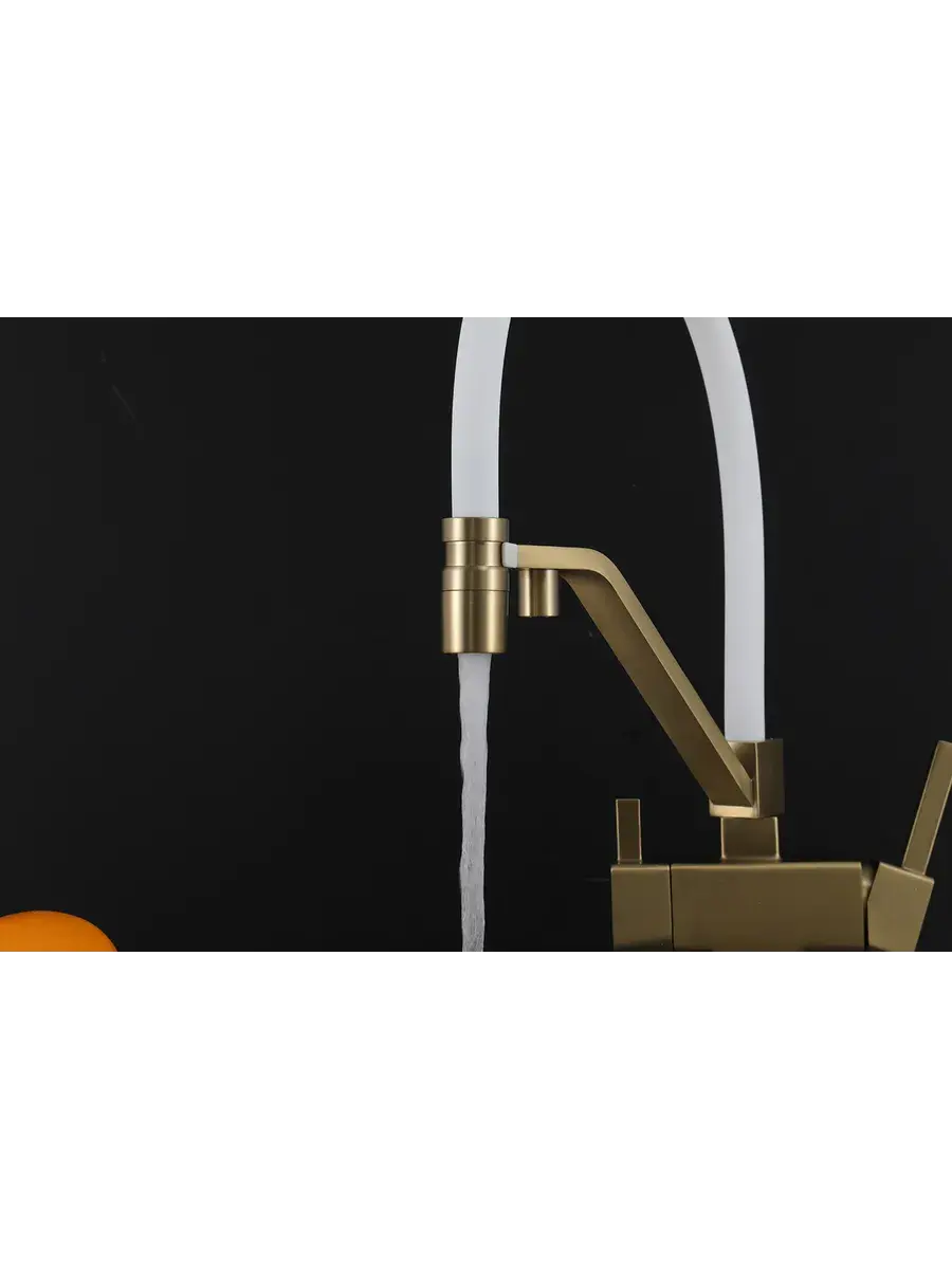Смеситель для кухни с гибким изливом и подключением к фильтру Gappo G4395-63 в цвете матовое золото – стильное и функциональное решение для вашей кухни. Модель оснащена гибким поворотным изливом высотой 42 см и длиной 23 см, что обеспечивает удобство использования при мытье посуды и заполнении емкостей. Встроенный фильтр и аэратор гарантируют чистую воду и экономию ее расхода. Двухрычажный механизм управления позволяет легко регулировать температуру и напор воды. Смеситель выполнен из латуни и силикона, что обеспечивает его прочность и долговечность.