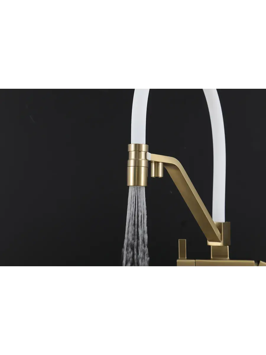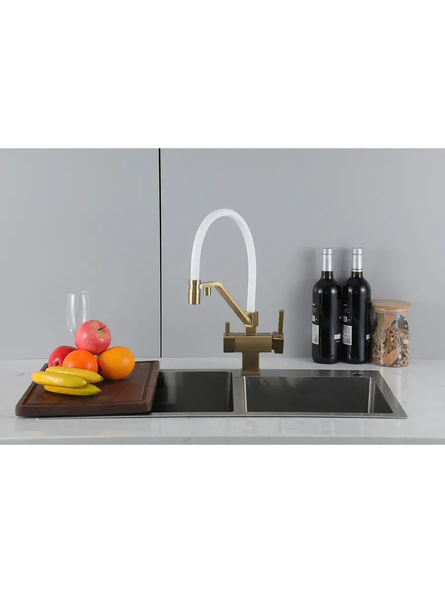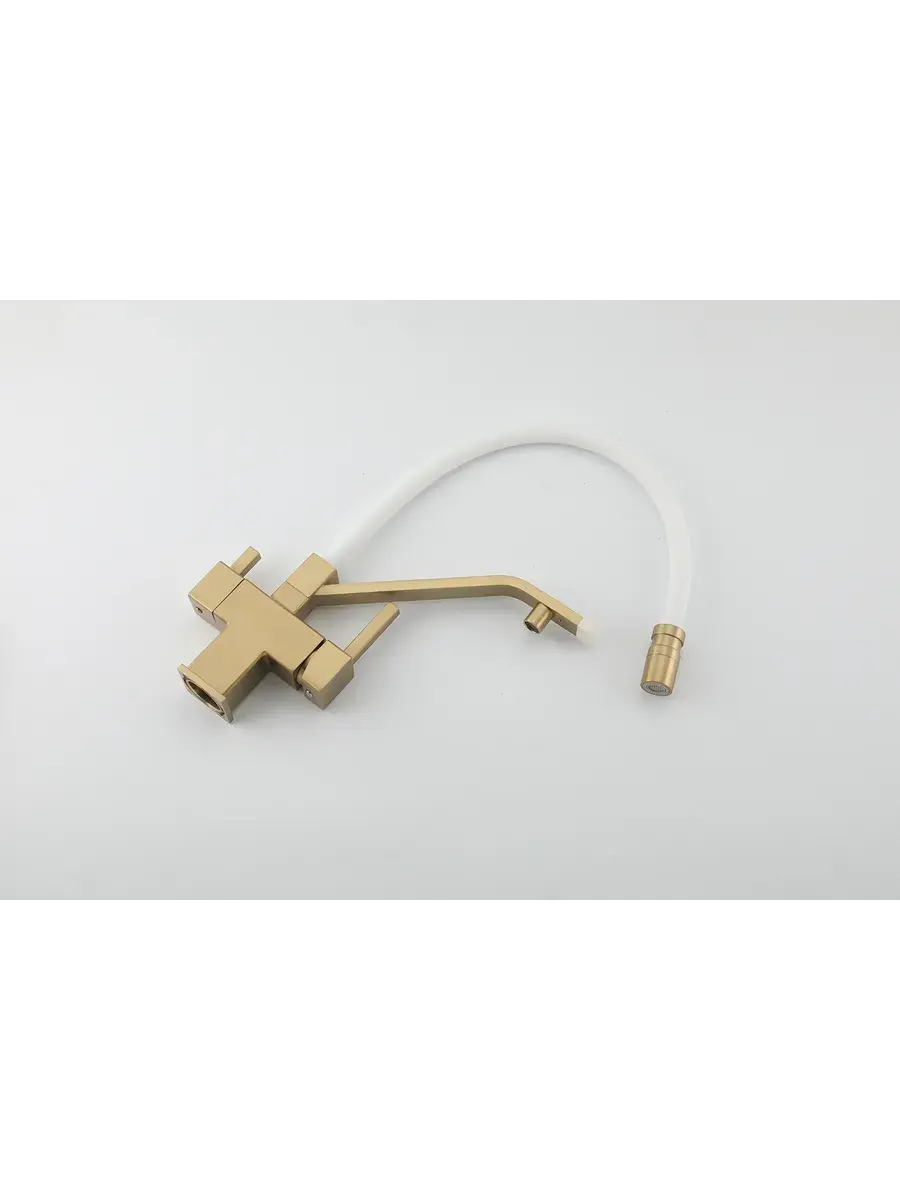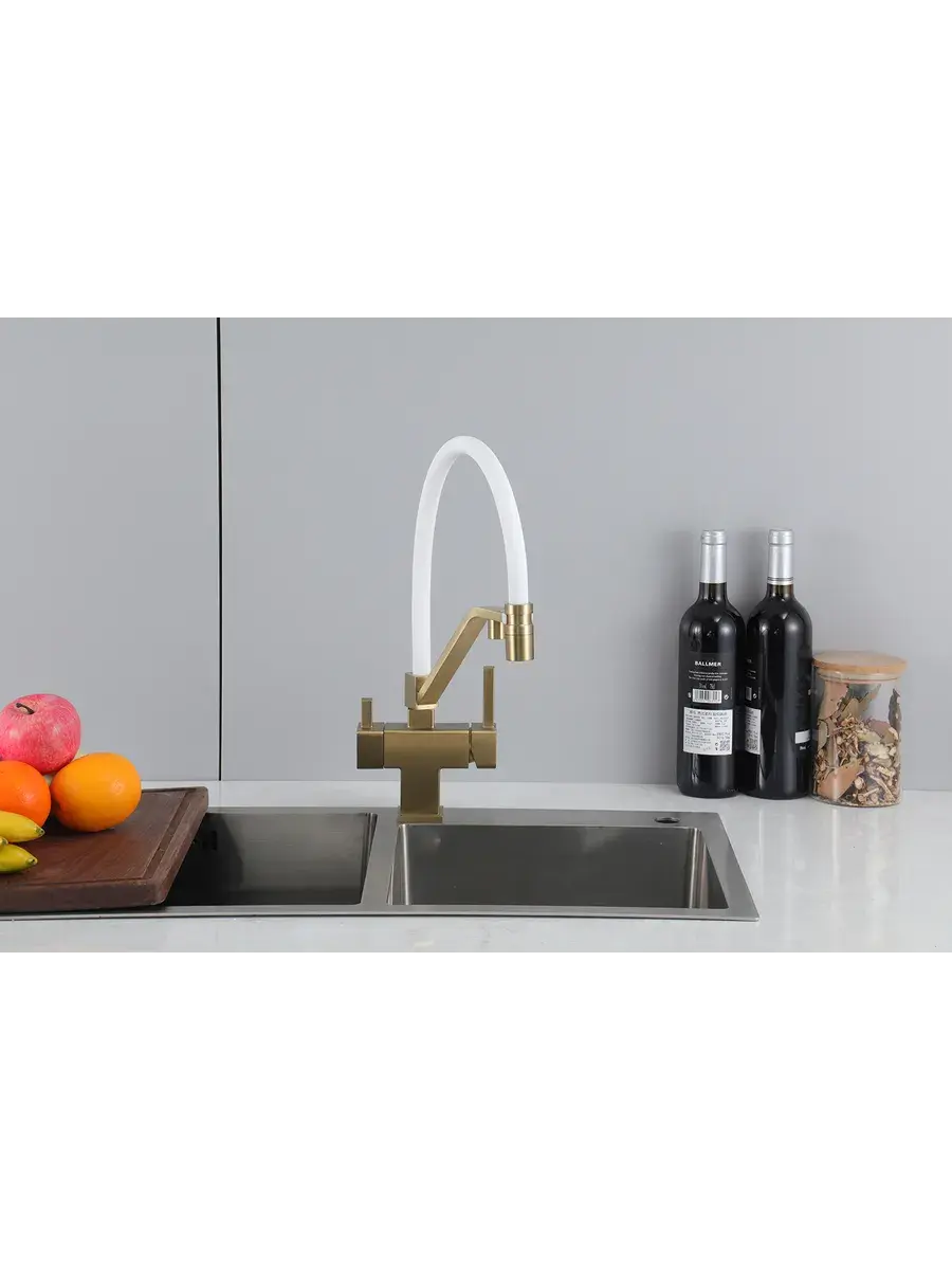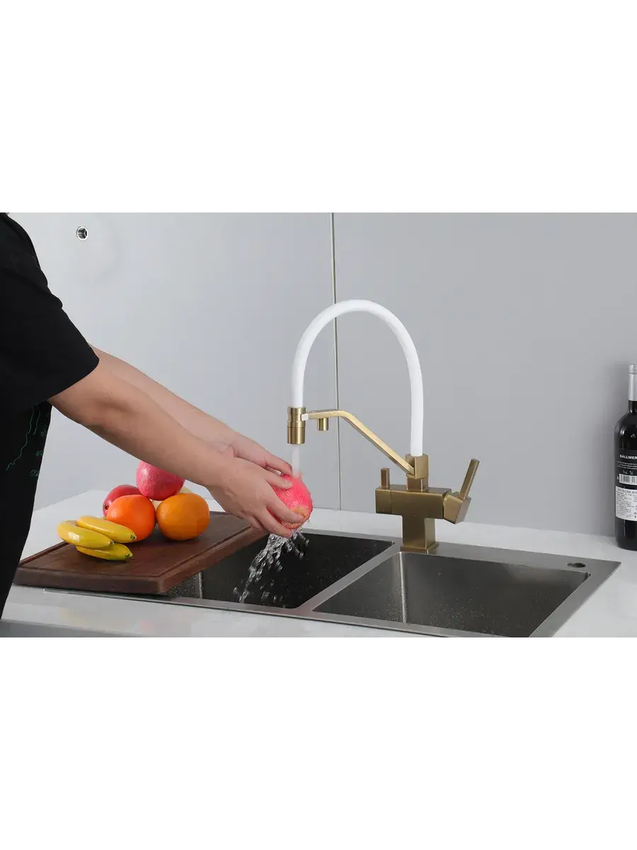 Смеситель для кухни с гибким изливом и подключением к фильтру Gappo G4395-63 в цвете матовое золото – стильное и функциональное решение для вашей кухни. Модель оснащена гибким поворотным изливом высотой 42 см и длиной 23 см, что обеспечивает удобство использования при мытье посуды и заполнении емкостей. Встроенный фильтр и аэратор гарантируют чистую воду и экономию ее расхода. Двухрычажный механизм управления позволяет легко регулировать температуру и напор воды. Смеситель выполнен из латуни и силикона, что обеспечивает его прочность и долговечность.