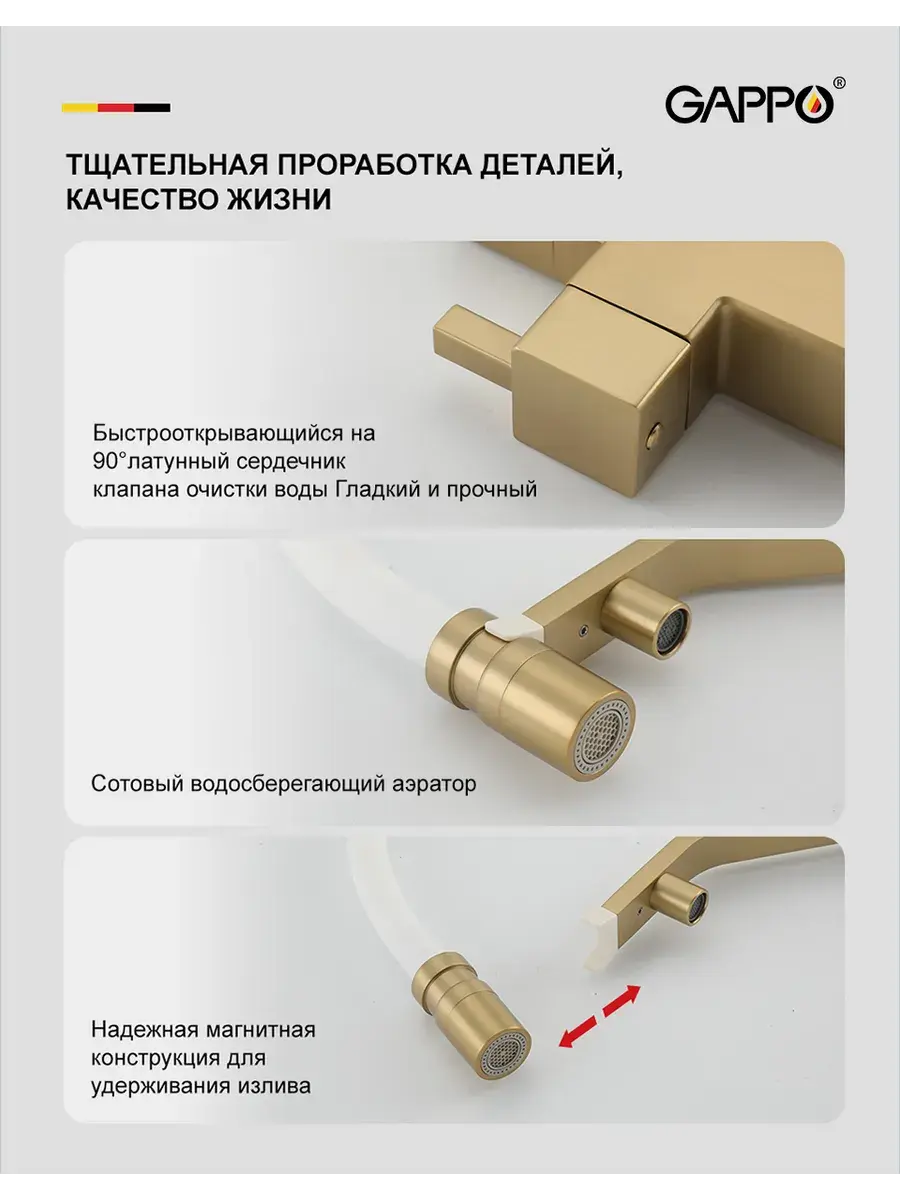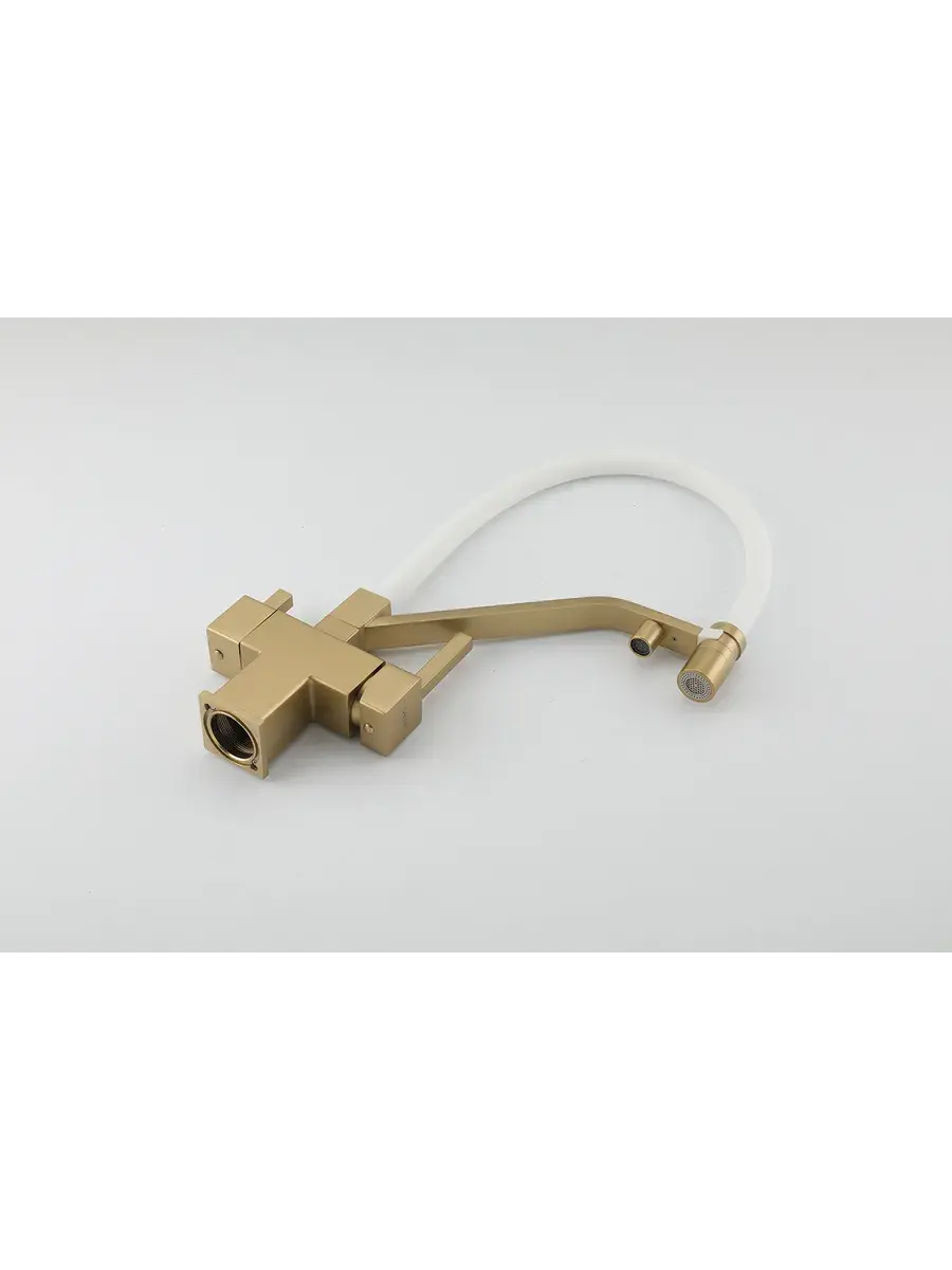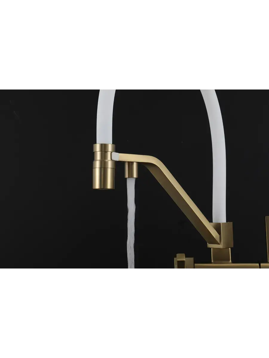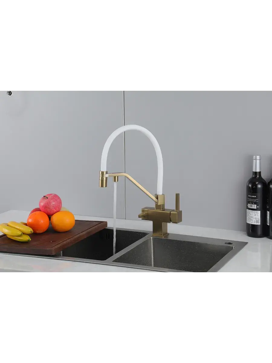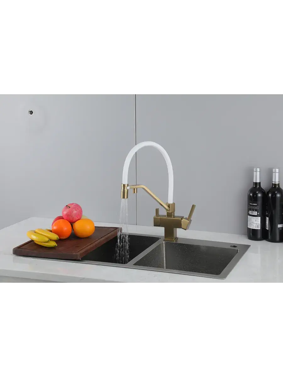 Смеситель для кухни с гибким изливом и подключением к фильтру Gappo G4395-63 в цвете матовое золото – стильное и функциональное решение для вашей кухни. Модель оснащена гибким поворотным изливом высотой 42 см и длиной 23 см, что обеспечивает удобство использования при мытье посуды и заполнении емкостей. Встроенный фильтр и аэратор гарантируют чистую воду и экономию ее расхода. Двухрычажный механизм управления позволяет легко регулировать температуру и напор воды. Смеситель выполнен из латуни и силикона, что обеспечивает его прочность и долговечность.