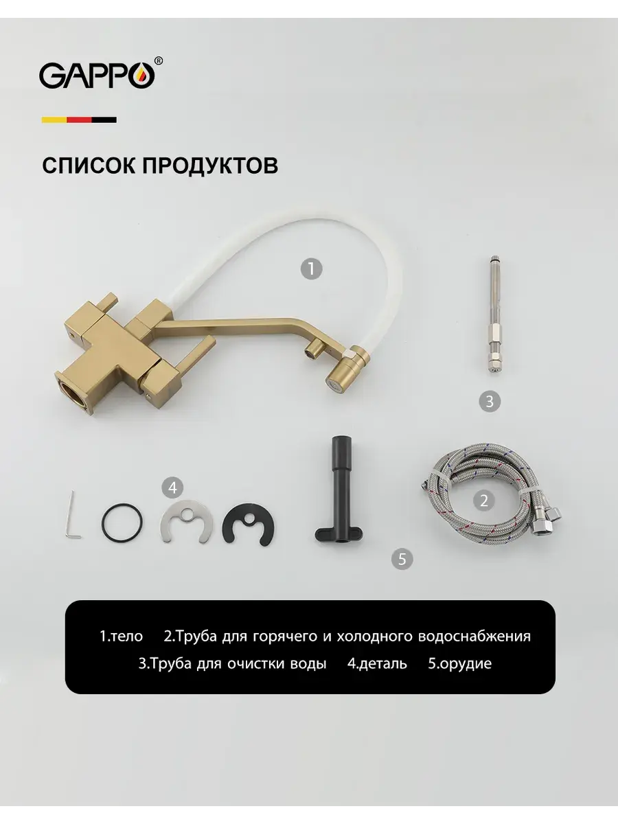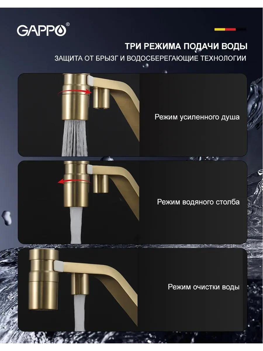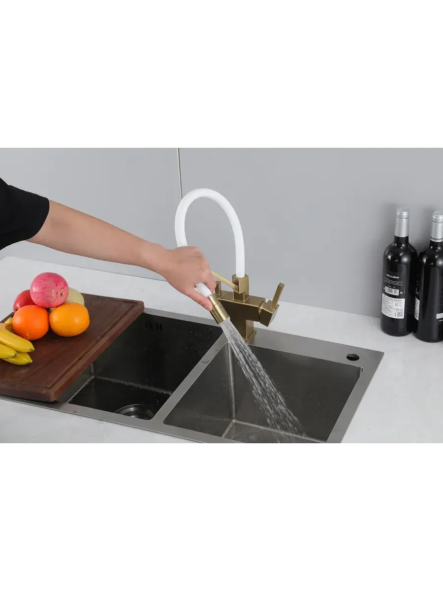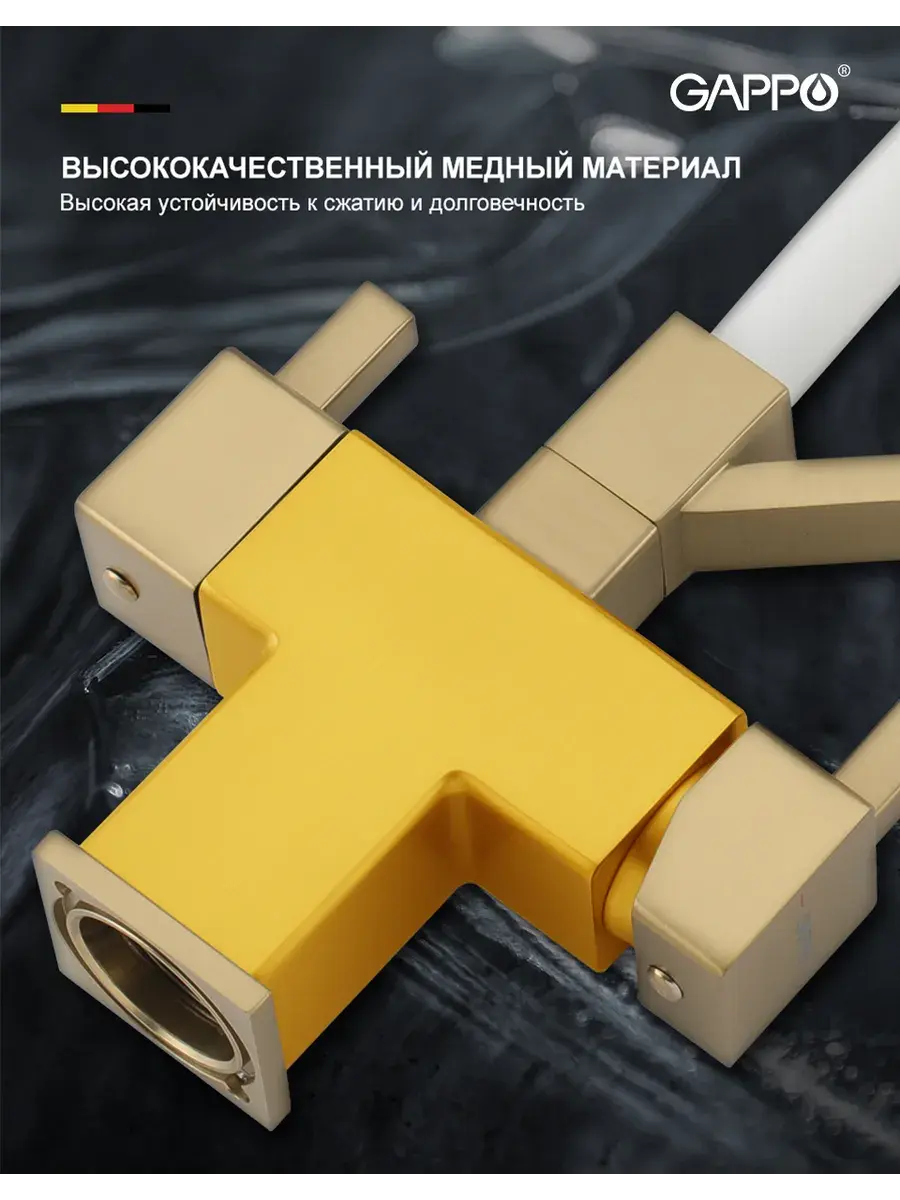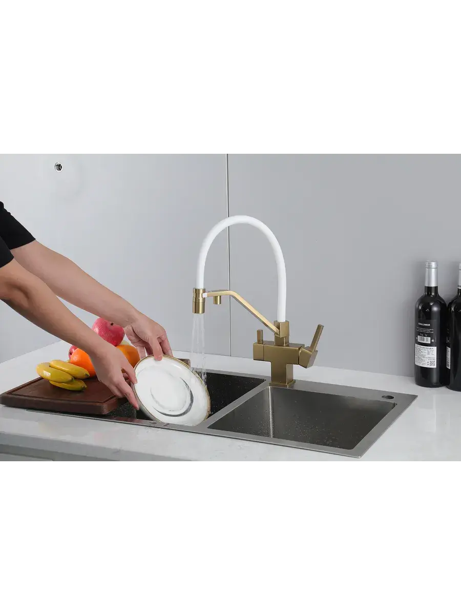 Смеситель для кухни с гибким изливом и подключением к фильтру Gappo G4395-63 в цвете матовое золото – стильное и функциональное решение для вашей кухни. Модель оснащена гибким поворотным изливом высотой 42 см и длиной 23 см, что обеспечивает удобство использования при мытье посуды и заполнении емкостей. Встроенный фильтр и аэратор гарантируют чистую воду и экономию ее расхода. Двухрычажный механизм управления позволяет легко регулировать температуру и напор воды. Смеситель выполнен из латуни и силикона, что обеспечивает его прочность и долговечность.