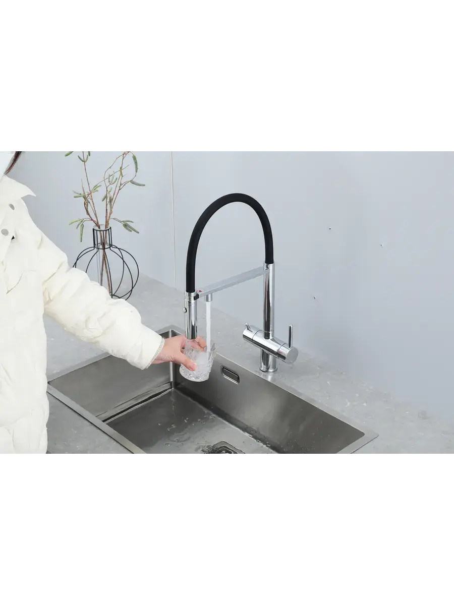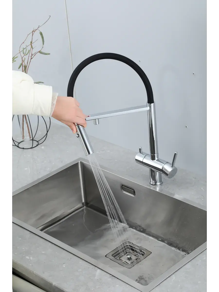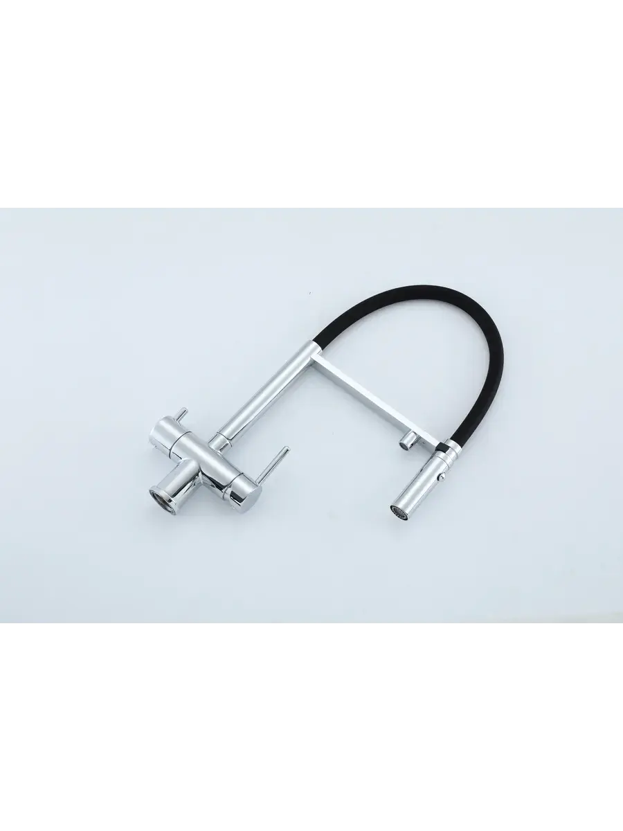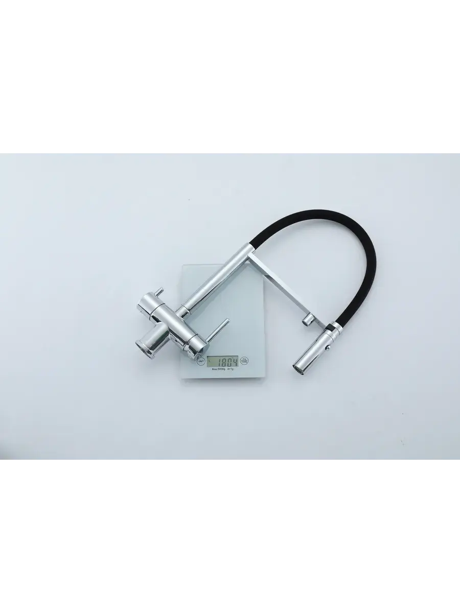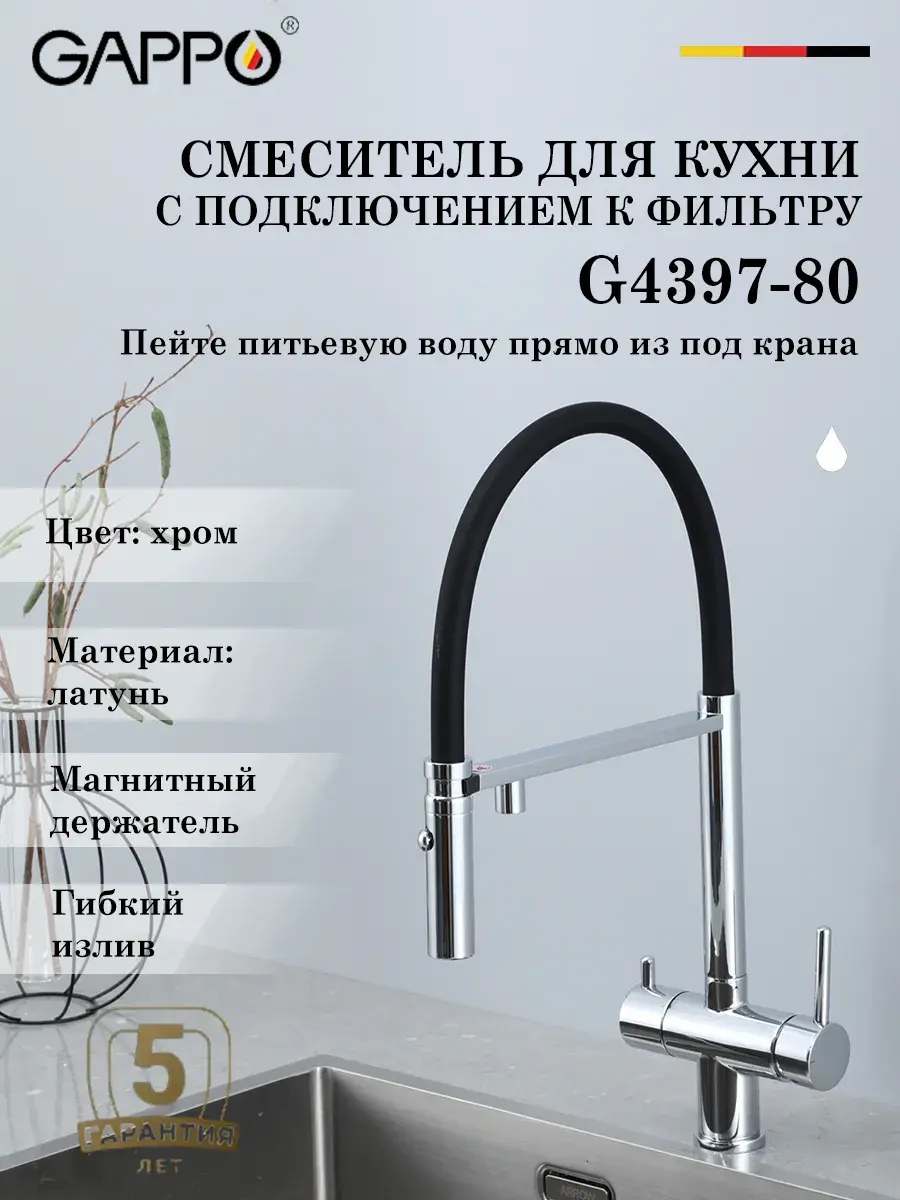 Смеситель для кухни с гибким изливом и подключением к фильтру Gappo G4397-80 в цвете хром – стильное и функциональное решение для вашей кухни. Модель оснащена гибким поворотным изливом высотой 49 см и длиной 23 см, что обеспечивает удобство использования при мытье посуды и заполнении емкостей. Встроенный фильтр и аэратор гарантируют чистую воду и экономию ее расхода. Двухрычажный механизм управления позволяет легко регулировать температуру и напор воды. Смеситель выполнен из латуни и силикона, что обеспечивает его прочность и долговечность.
