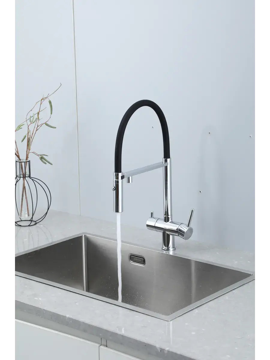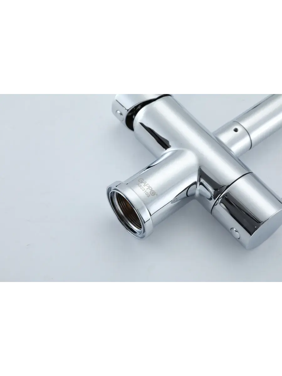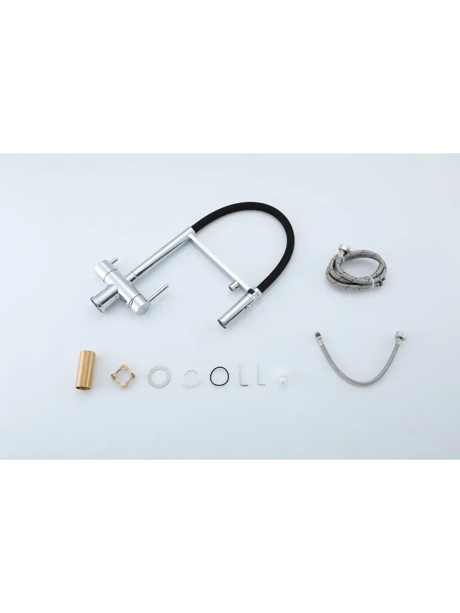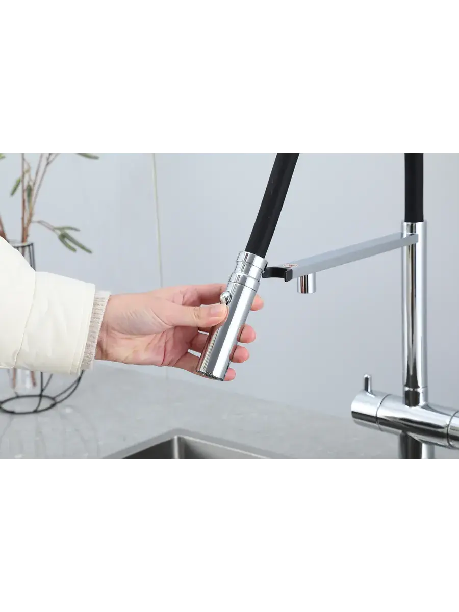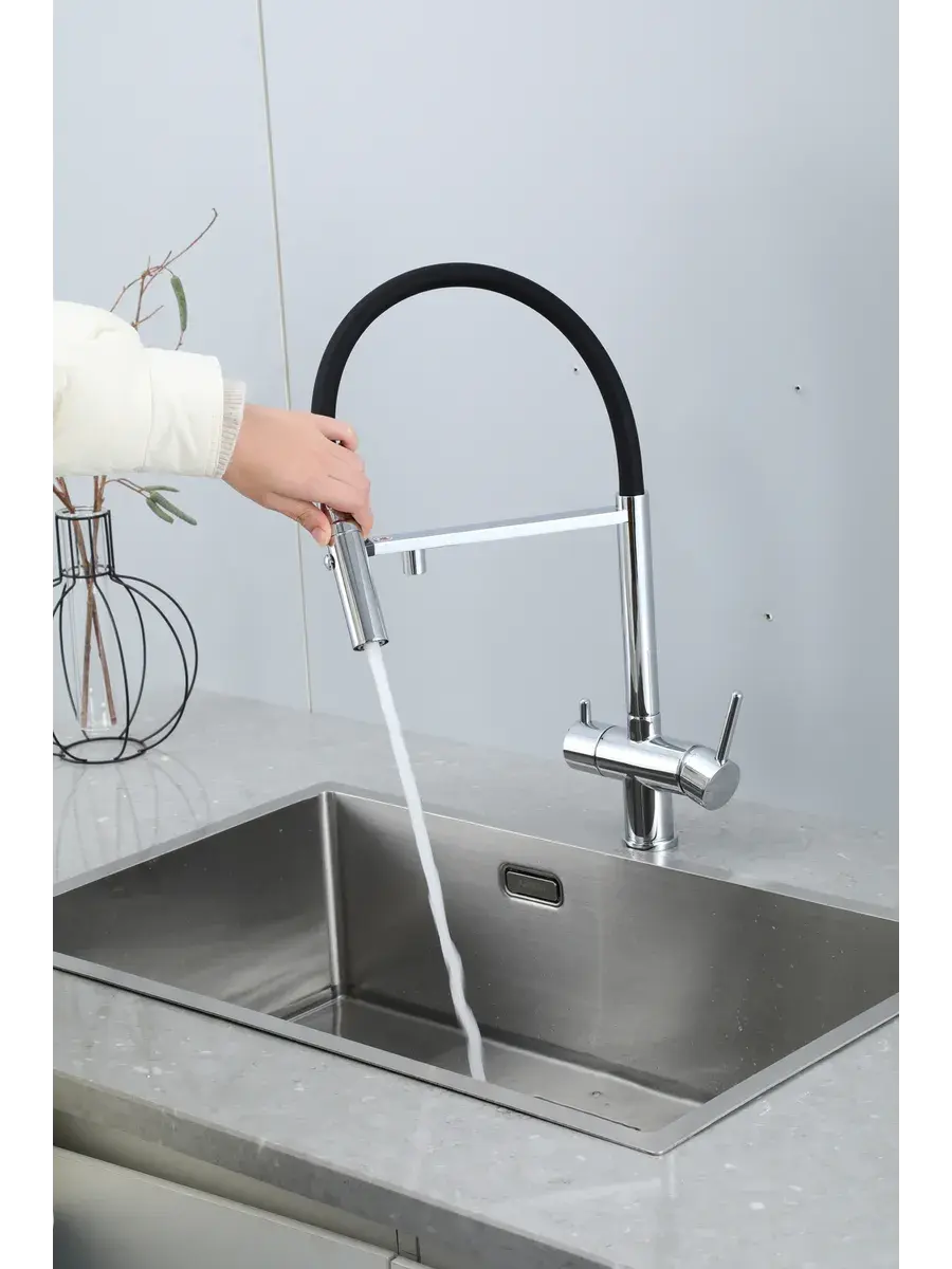 Смеситель для кухни с гибким изливом и подключением к фильтру Gappo G4397-80 в цвете хром – стильное и функциональное решение для вашей кухни. Модель оснащена гибким поворотным изливом высотой 49 см и длиной 23 см, что обеспечивает удобство использования при мытье посуды и заполнении емкостей. Встроенный фильтр и аэратор гарантируют чистую воду и экономию ее расхода. Двухрычажный механизм управления позволяет легко регулировать температуру и напор воды. Смеситель выполнен из латуни и силикона, что обеспечивает его прочность и долговечность.