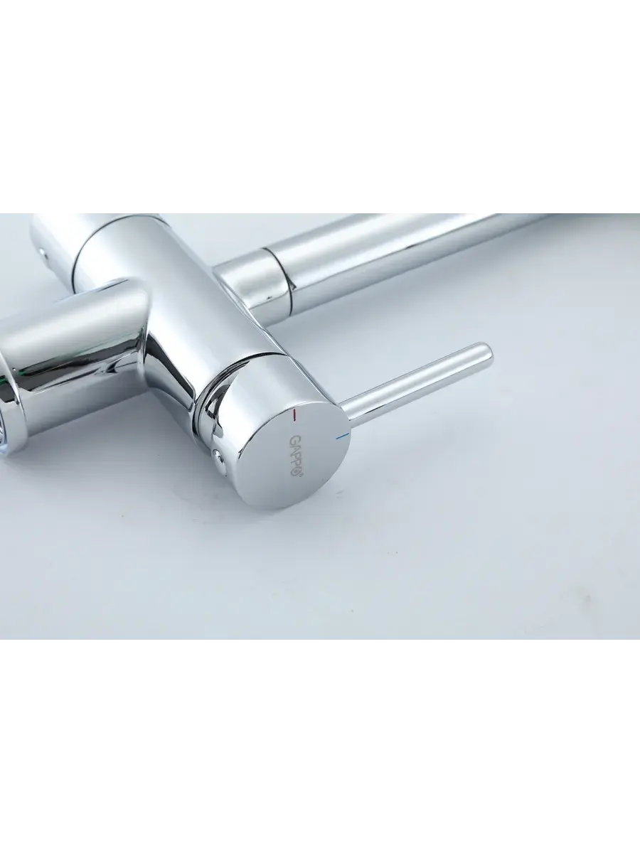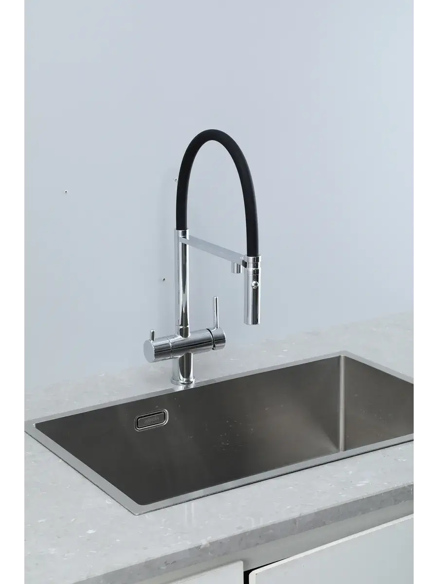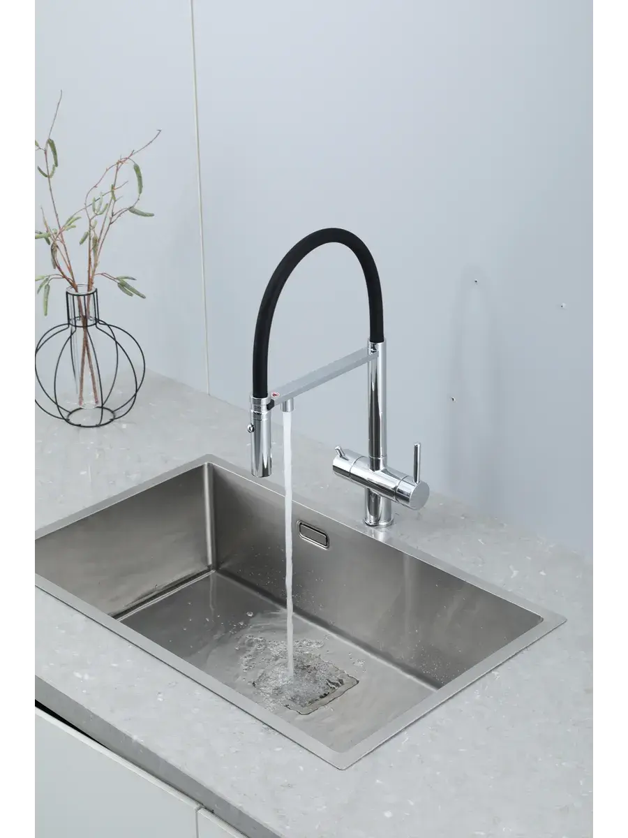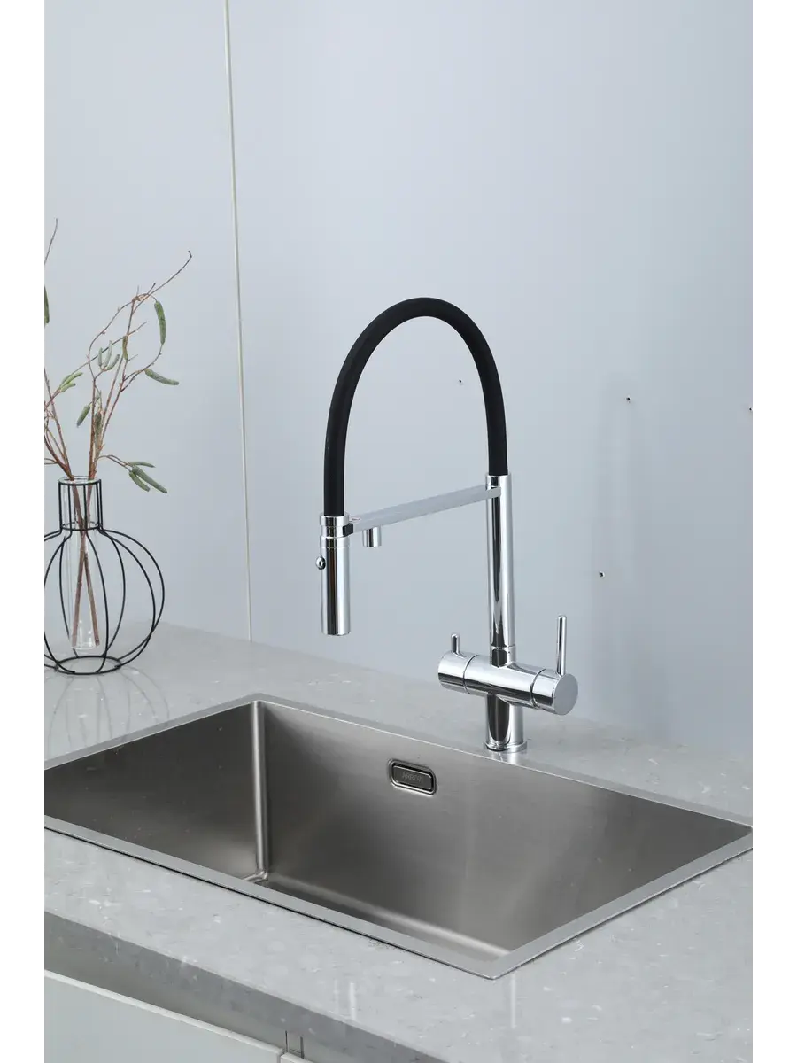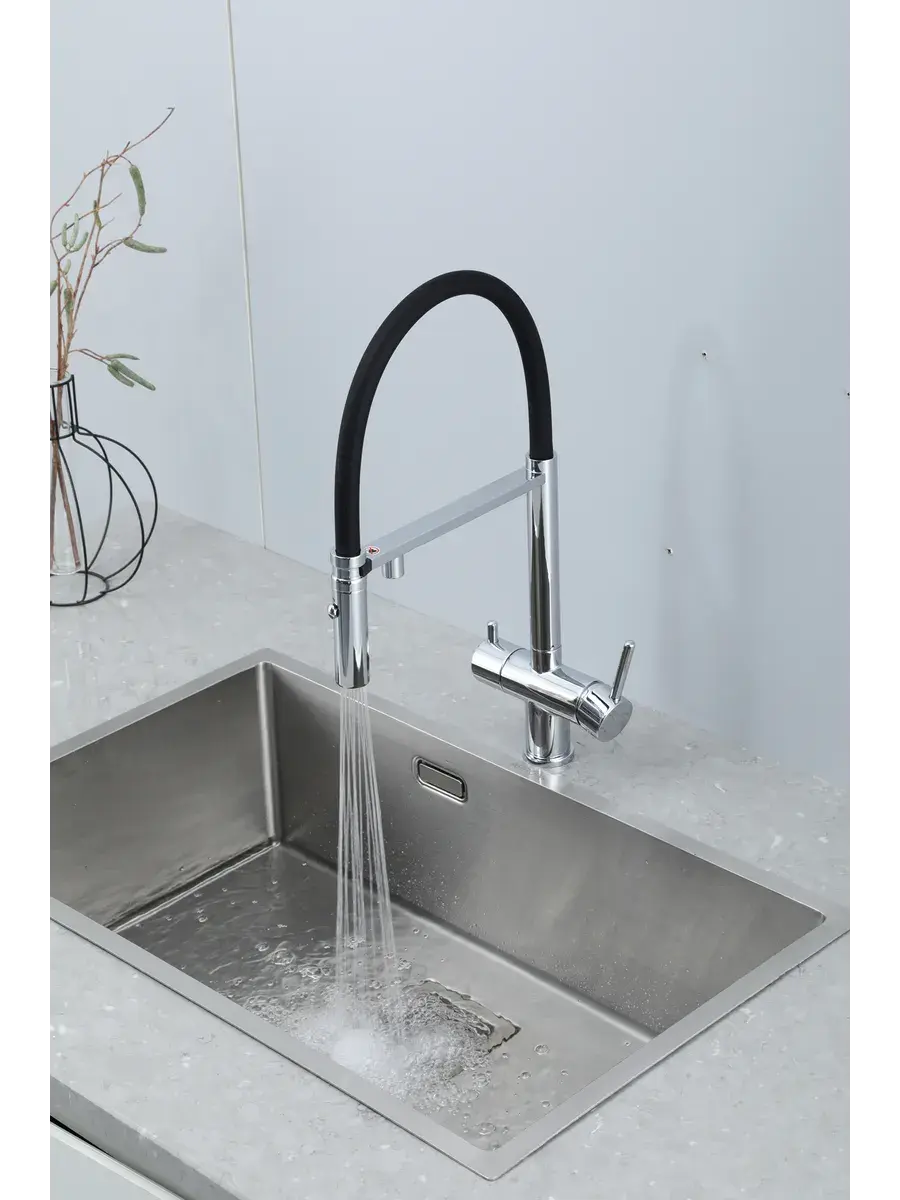 Смеситель для кухни с гибким изливом и подключением к фильтру Gappo G4397-80 в цвете хром – стильное и функциональное решение для вашей кухни. Модель оснащена гибким поворотным изливом высотой 49 см и длиной 23 см, что обеспечивает удобство использования при мытье посуды и заполнении емкостей. Встроенный фильтр и аэратор гарантируют чистую воду и экономию ее расхода. Двухрычажный механизм управления позволяет легко регулировать температуру и напор воды. Смеситель выполнен из латуни и силикона, что обеспечивает его прочность и долговечность.