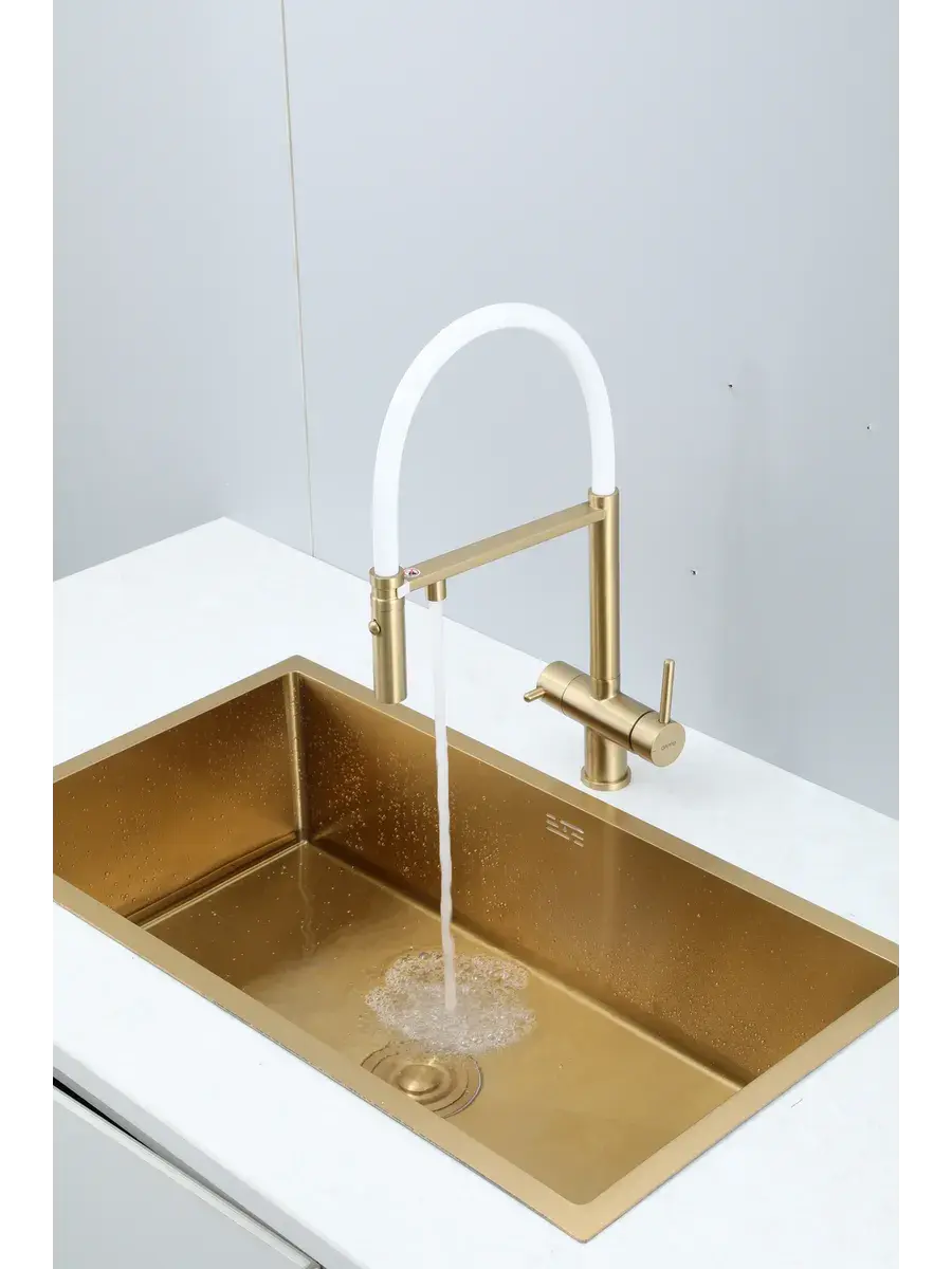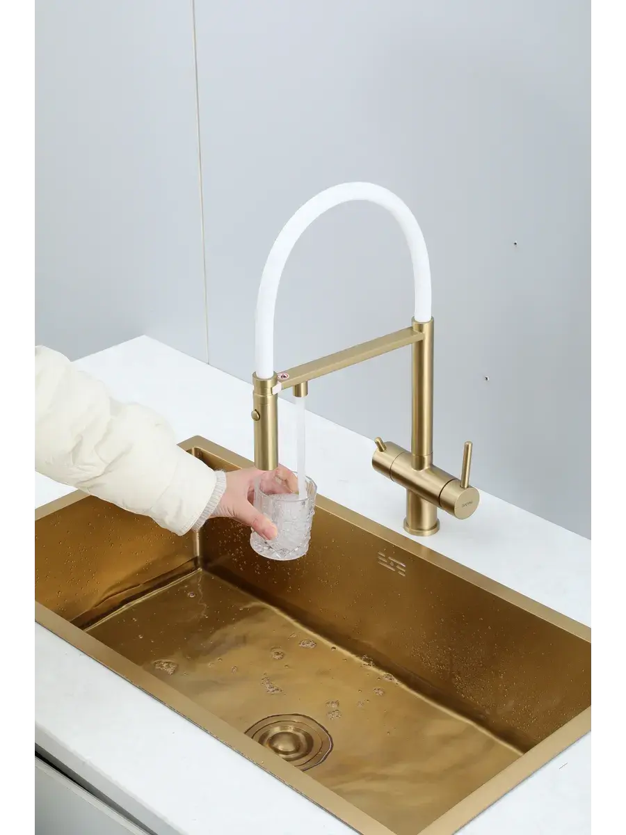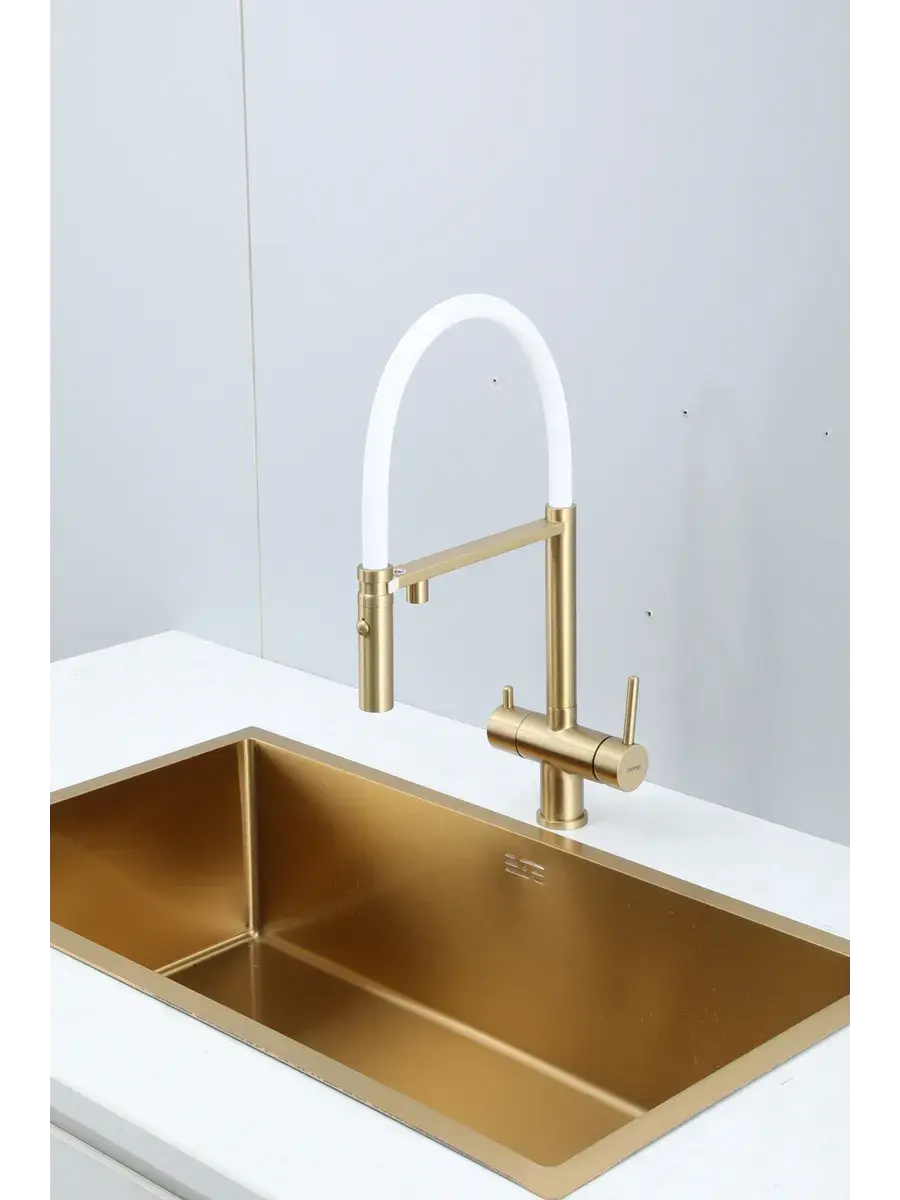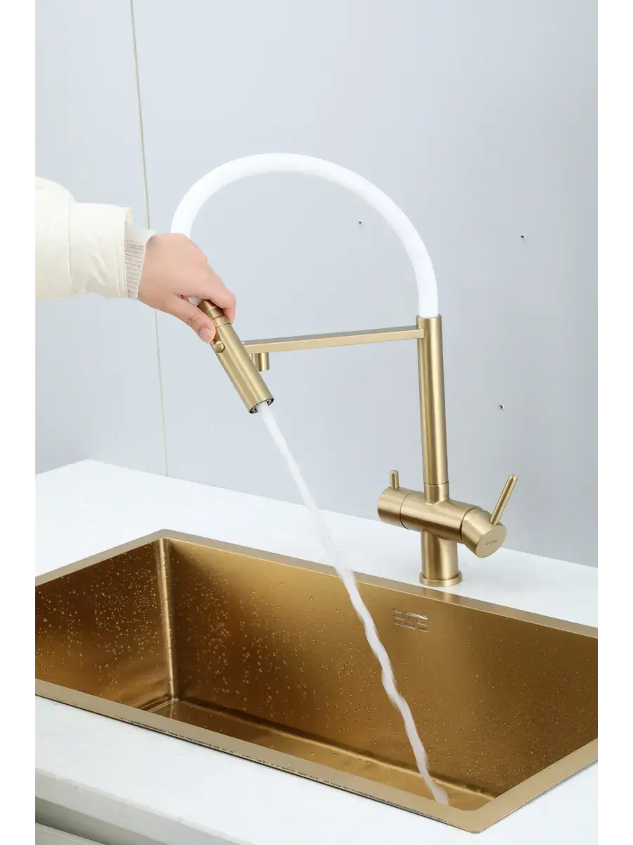 Смеситель для кухни с гибким изливом и подключением к фильтру Gappo G4397-83 в цвете матовое золото – стильное и функциональное решение для вашей кухни. Модель оснащена гибким поворотным изливом высотой 49 см и длиной 23 см, что обеспечивает удобство использования при мытье посуды и заполнении емкостей. Встроенный фильтр и аэратор гарантируют чистую воду и экономию ее расхода. Двухрычажный механизм управления позволяет легко регулировать температуру и напор воды. Смеситель выполнен из латуни и силикона, что обеспечивает его прочность и долговечность.