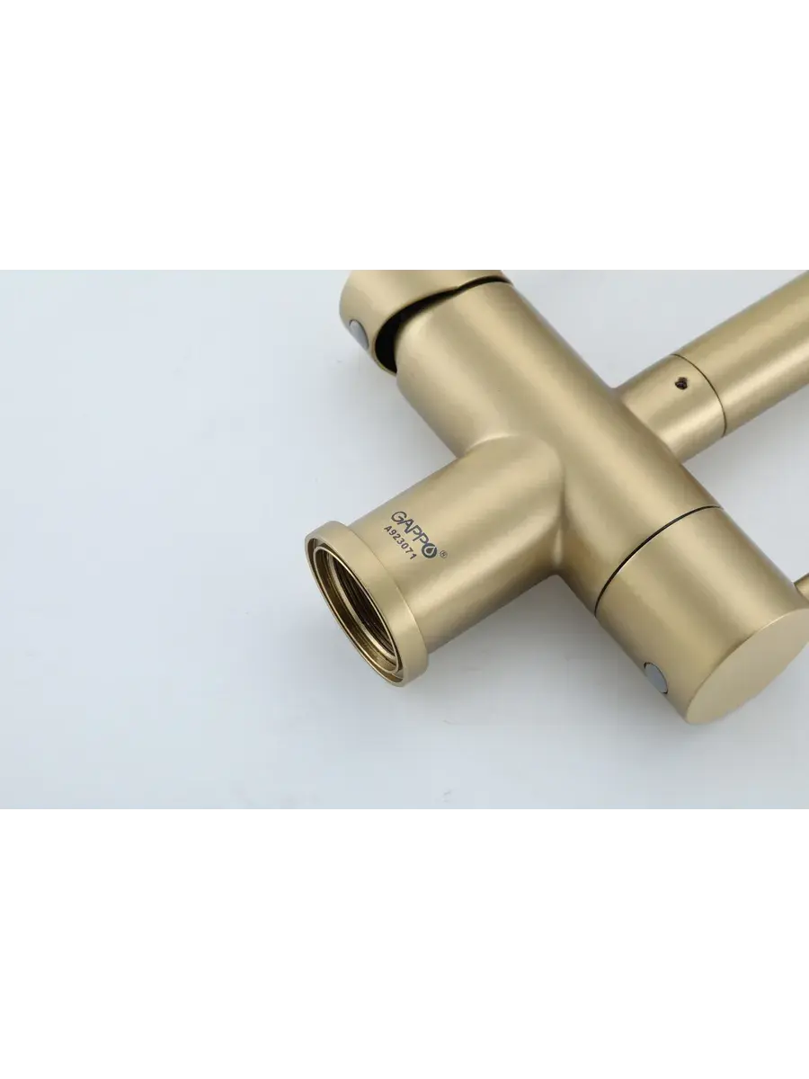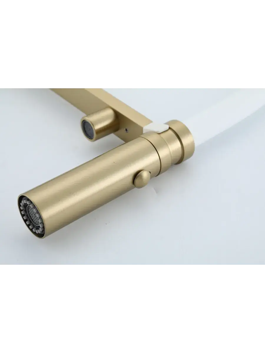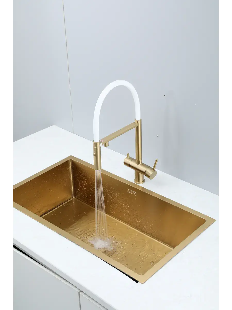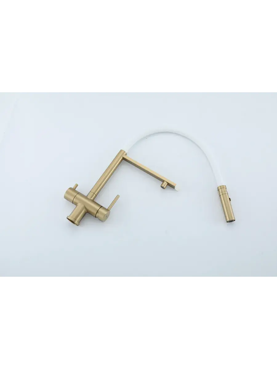 Смеситель для кухни с гибким изливом и подключением к фильтру Gappo G4397-83 в цвете матовое золото – стильное и функциональное решение для вашей кухни. Модель оснащена гибким поворотным изливом высотой 49 см и длиной 23 см, что обеспечивает удобство использования при мытье посуды и заполнении емкостей. Встроенный фильтр и аэратор гарантируют чистую воду и экономию ее расхода. Двухрычажный механизм управления позволяет легко регулировать температуру и напор воды. Смеситель выполнен из латуни и силикона, что обеспечивает его прочность и долговечность.