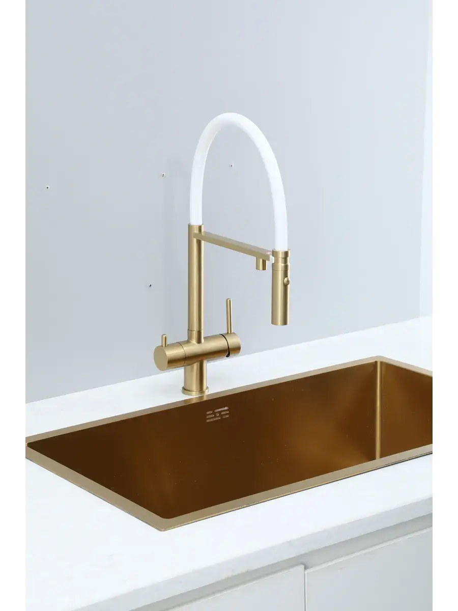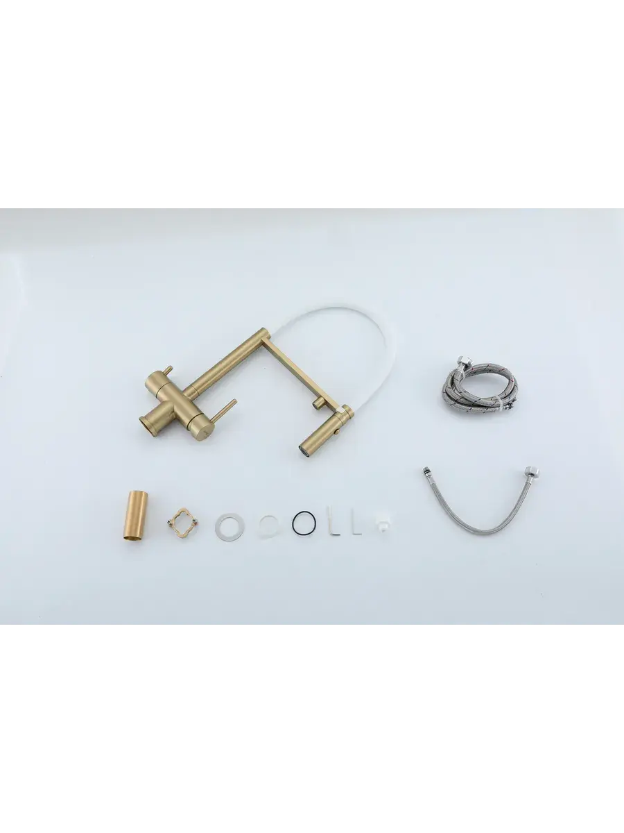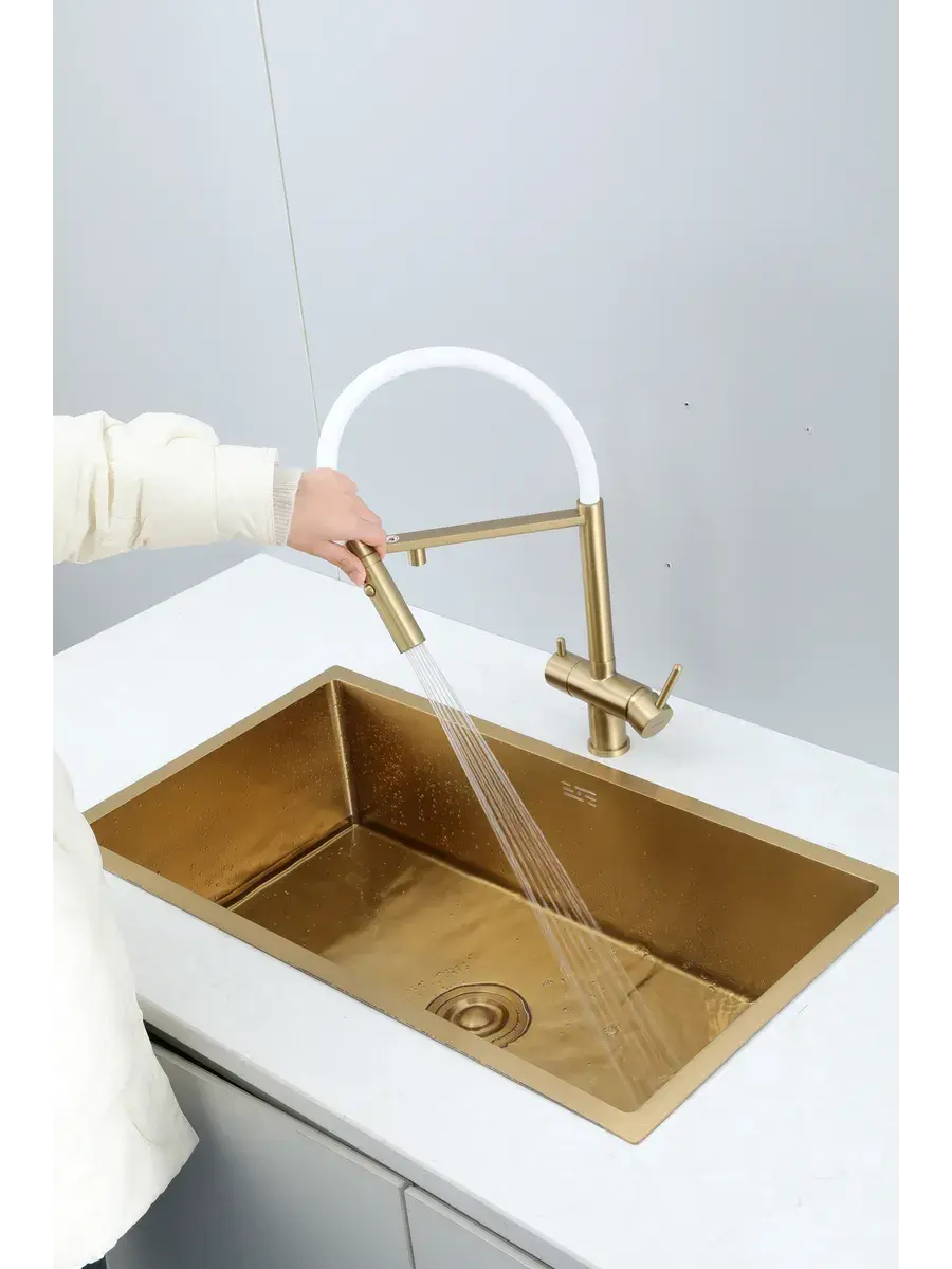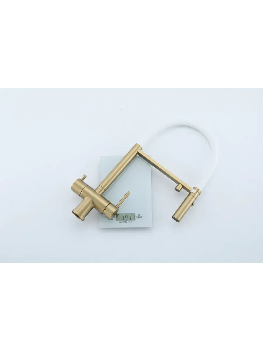 Смеситель для кухни с гибким изливом и подключением к фильтру Gappo G4397-83 в цвете матовое золото – стильное и функциональное решение для вашей кухни. Модель оснащена гибким поворотным изливом высотой 49 см и длиной 23 см, что обеспечивает удобство использования при мытье посуды и заполнении емкостей. Встроенный фильтр и аэратор гарантируют чистую воду и экономию ее расхода. Двухрычажный механизм управления позволяет легко регулировать температуру и напор воды. Смеситель выполнен из латуни и силикона, что обеспечивает его прочность и долговечность.