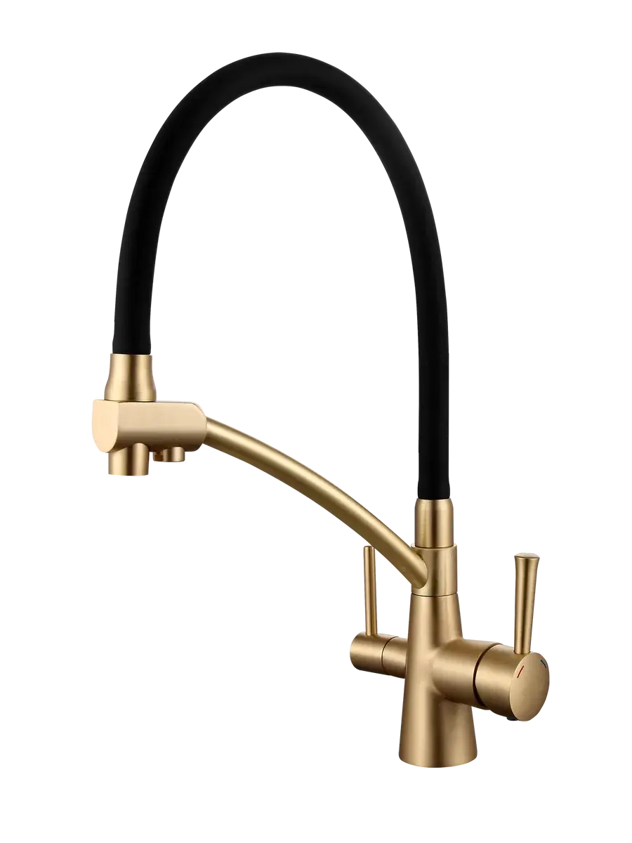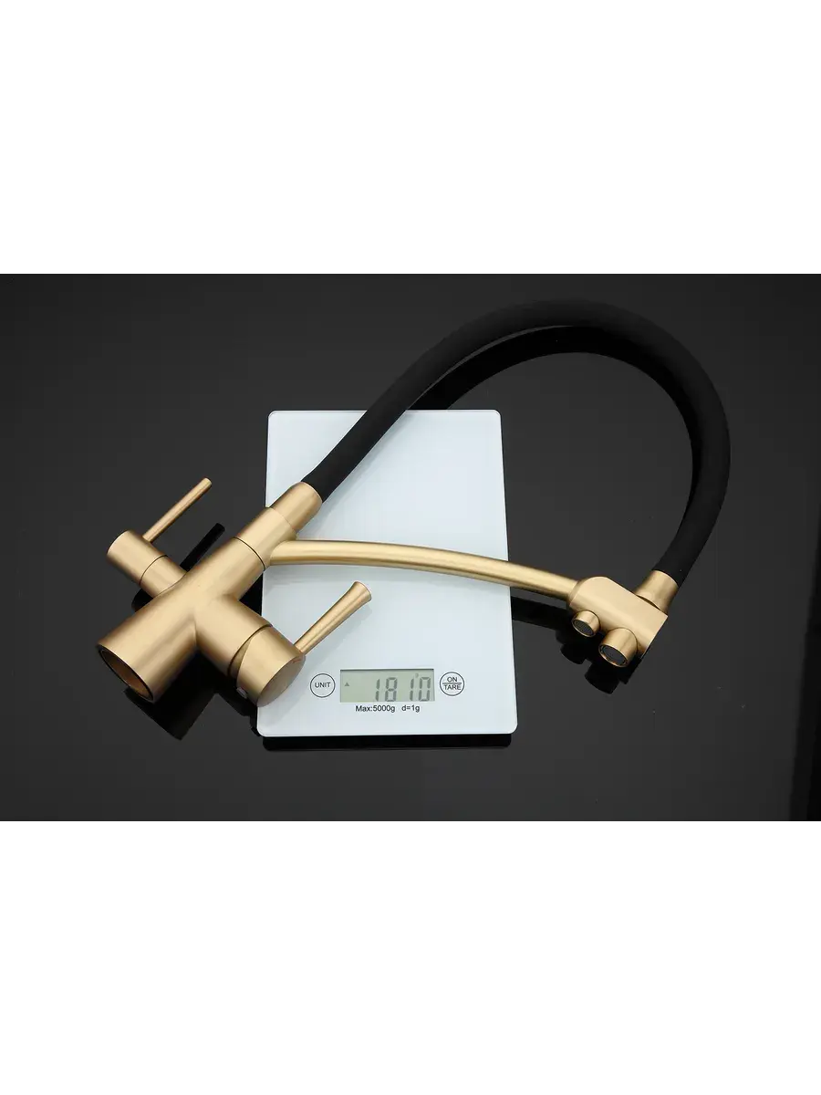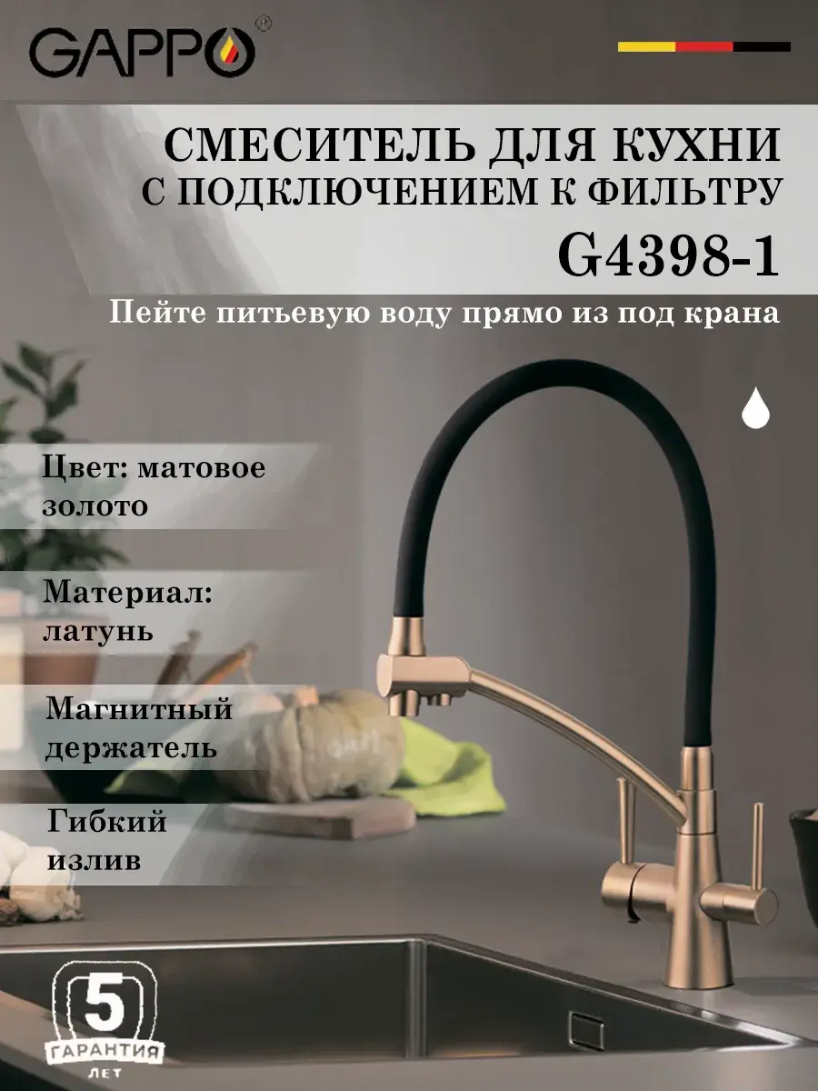 Смеситель для кухни с гибким изливом и подключением к фильтру Gappo G4398 в цвете сатин – стильное и функциональное решение для вашей кухни. Модель оснащена гибким поворотным изливом высотой 43 см и длиной 23 см, что обеспечивает удобство использования при мытье посуды и заполнении емкостей. Встроенный фильтр и аэратор гарантируют чистую воду и экономию ее расхода. Двухрычажный механизм управления позволяет легко регулировать температуру и напор воды. Смеситель выполнен из латуни и силикона, что обеспечивает его прочность и долговечность.