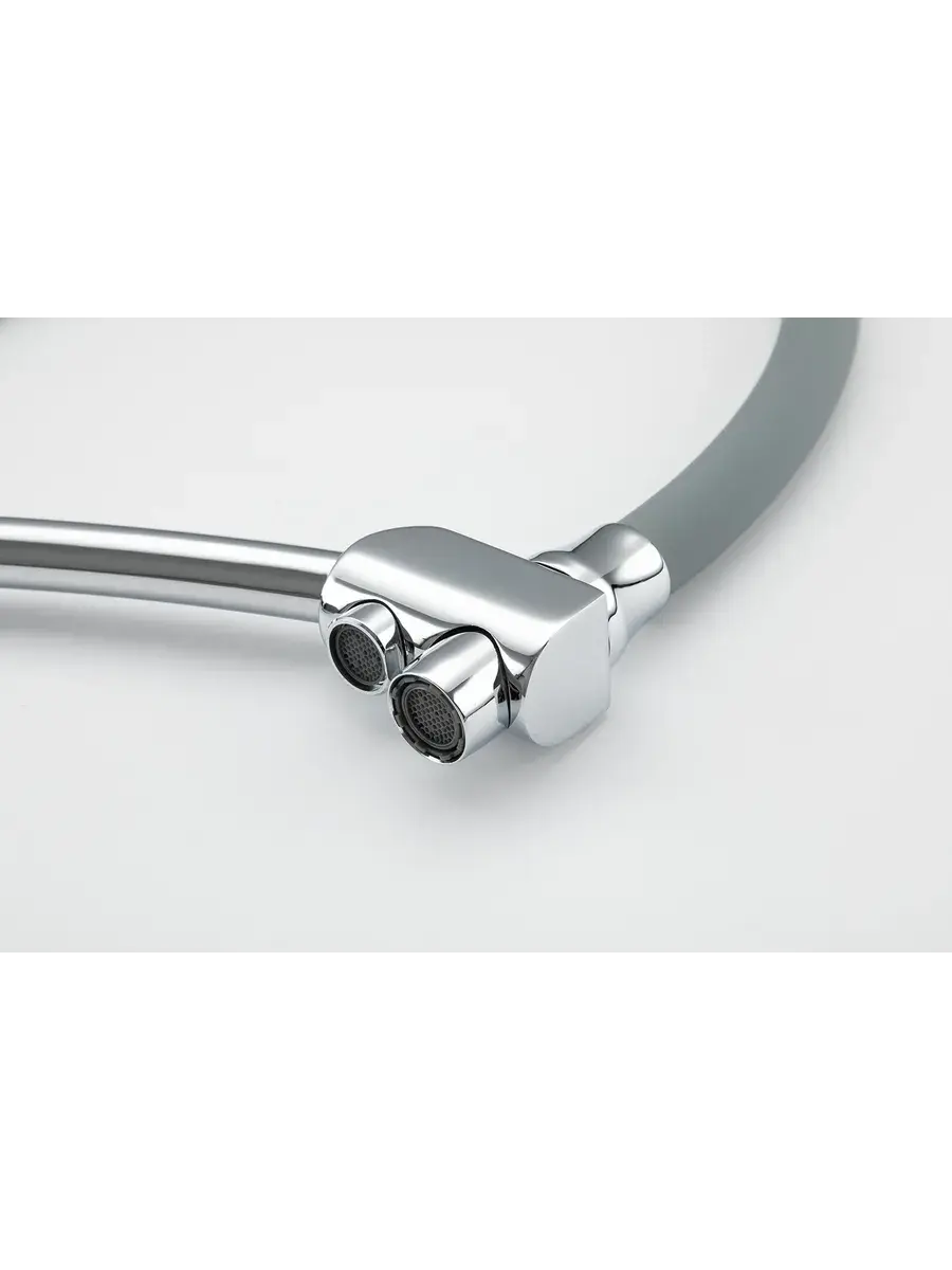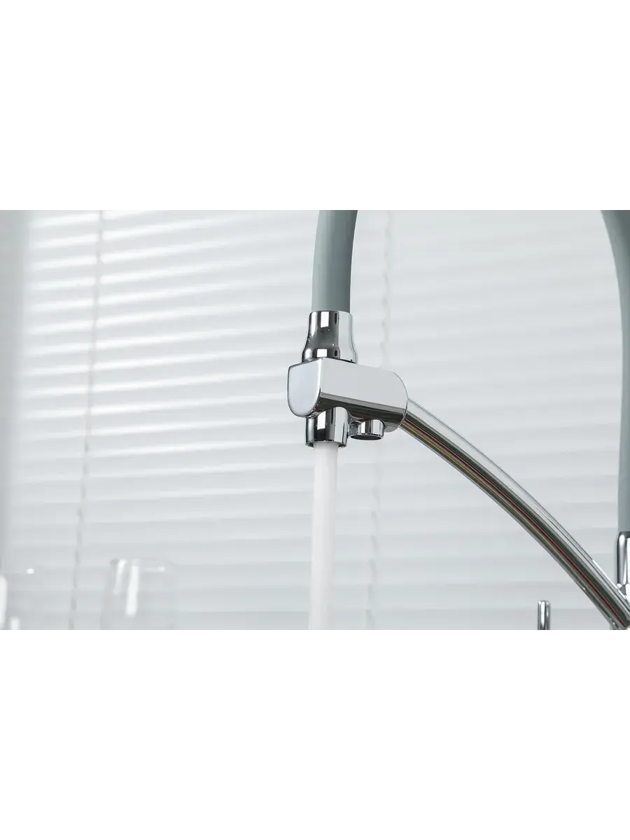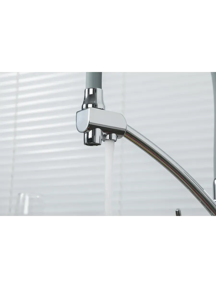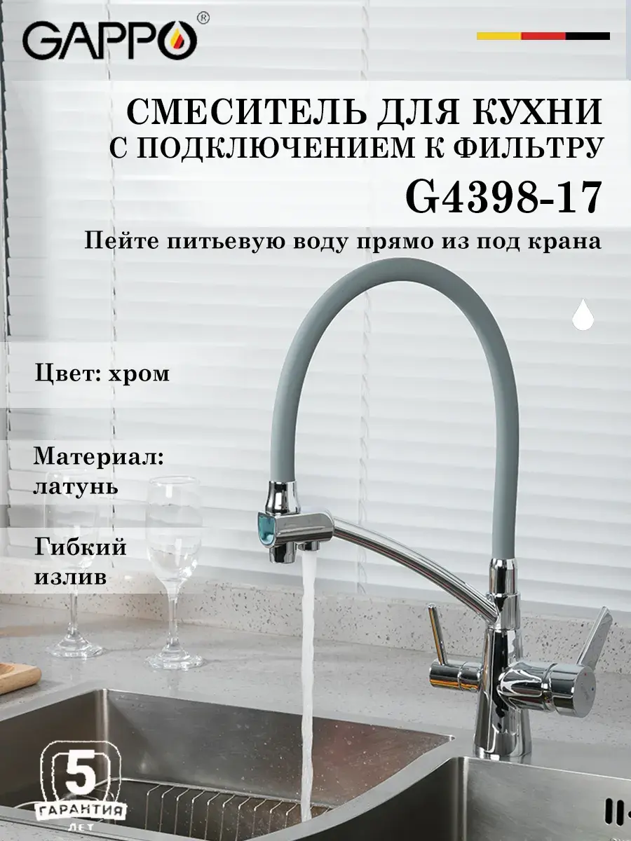 Смеситель для кухни с гибким изливом и подключением к фильтру Gappo G4398-17 в цвете хром – стильное и функциональное решение для вашей кухни. Модель оснащена гибким поворотным изливом высотой 43 см и длиной 23 см, что обеспечивает удобство использования при мытье посуды и заполнении емкостей. Встроенный фильтр и аэратор гарантируют чистую воду и экономию ее расхода. Двухрычажный механизм управления позволяет легко регулировать температуру и напор воды. Смеситель выполнен из латуни и силикона, что обеспечивает его прочность и долговечность.