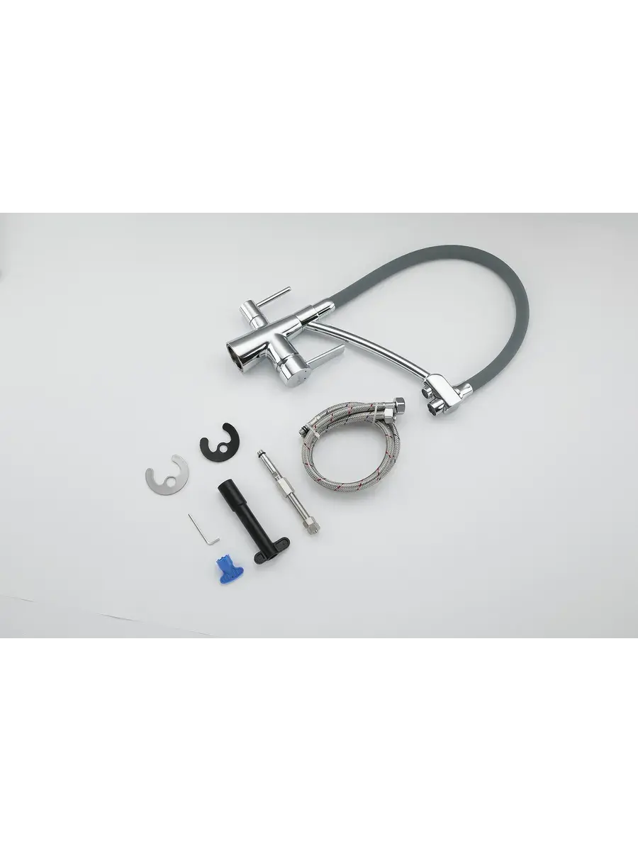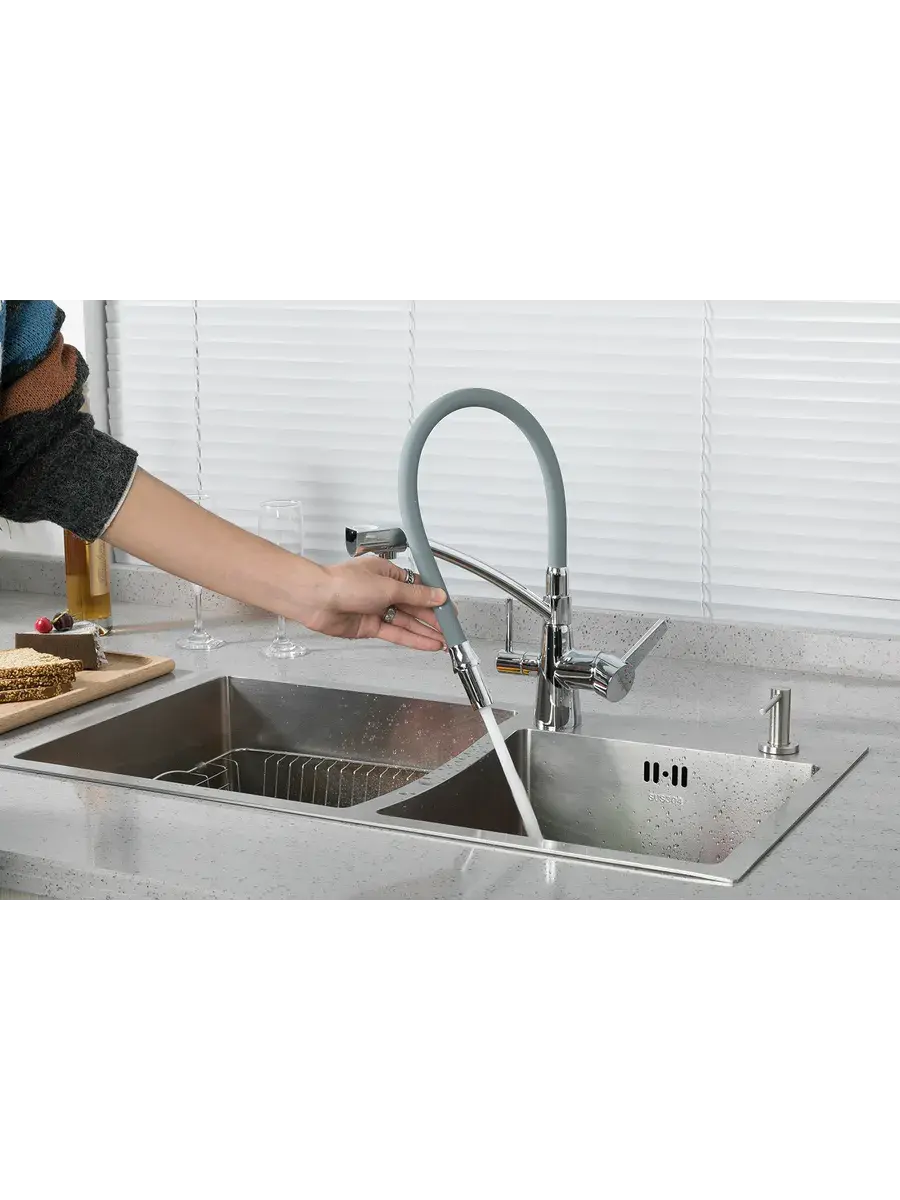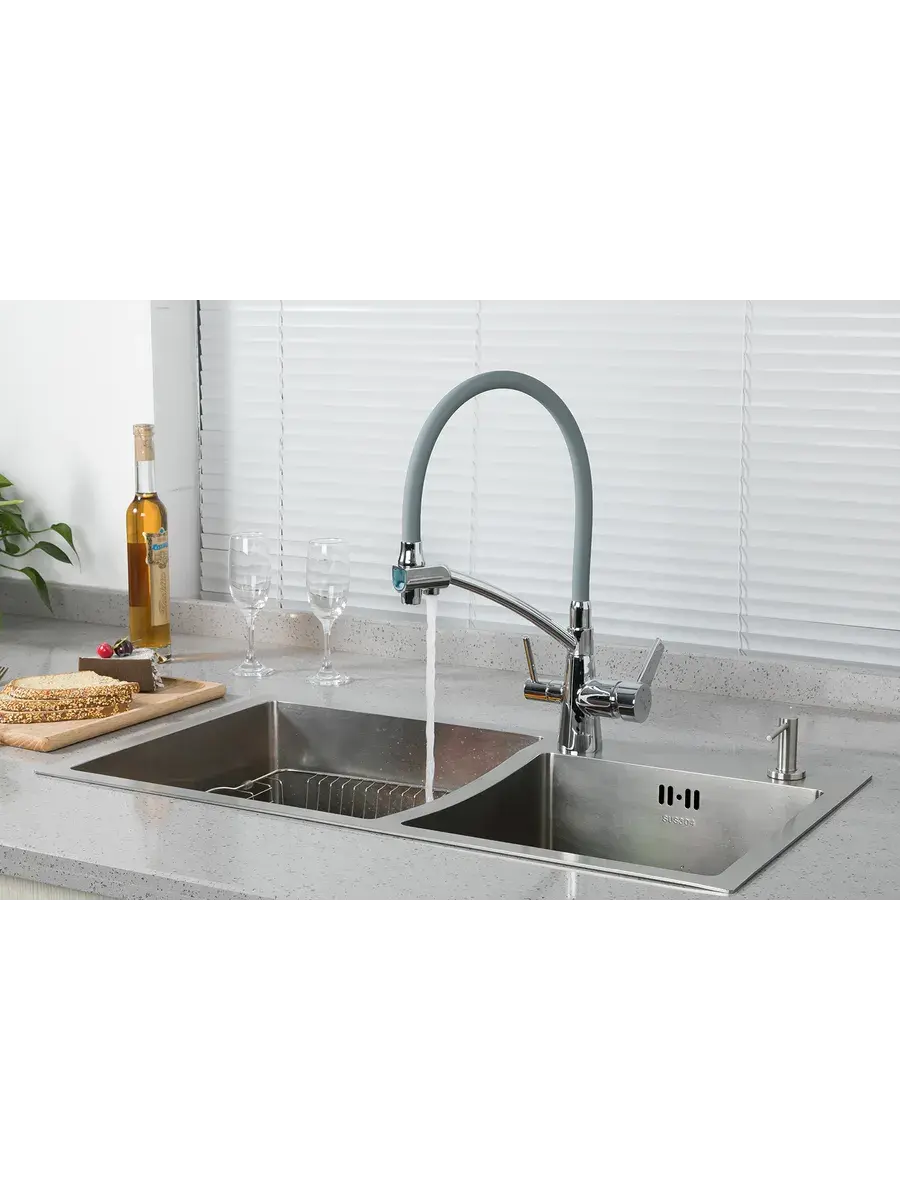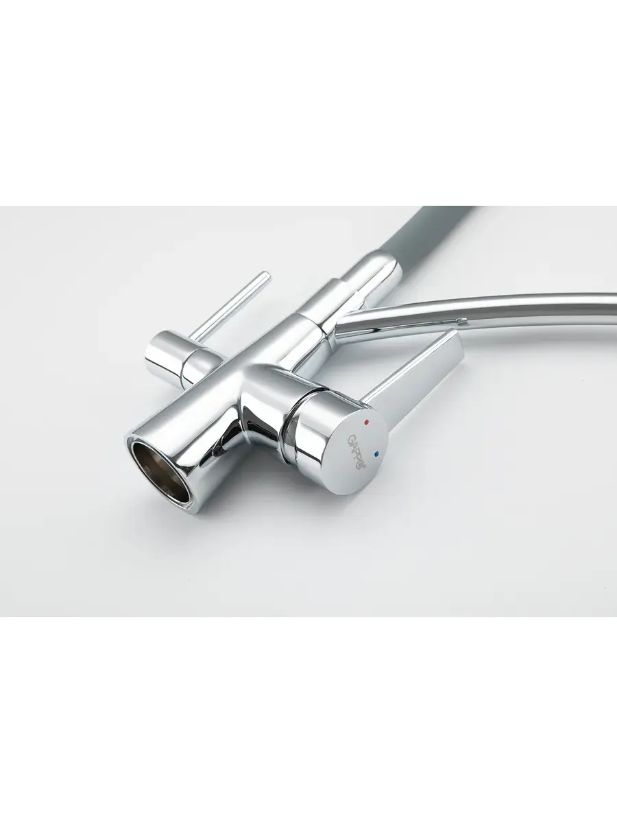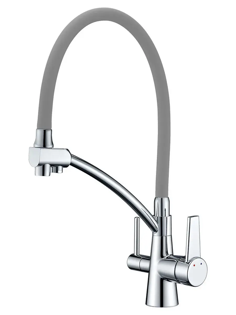 Смеситель для кухни с гибким изливом и подключением к фильтру Gappo G4398-17 в цвете хром – стильное и функциональное решение для вашей кухни. Модель оснащена гибким поворотным изливом высотой 43 см и длиной 23 см, что обеспечивает удобство использования при мытье посуды и заполнении емкостей. Встроенный фильтр и аэратор гарантируют чистую воду и экономию ее расхода. Двухрычажный механизм управления позволяет легко регулировать температуру и напор воды. Смеситель выполнен из латуни и силикона, что обеспечивает его прочность и долговечность.