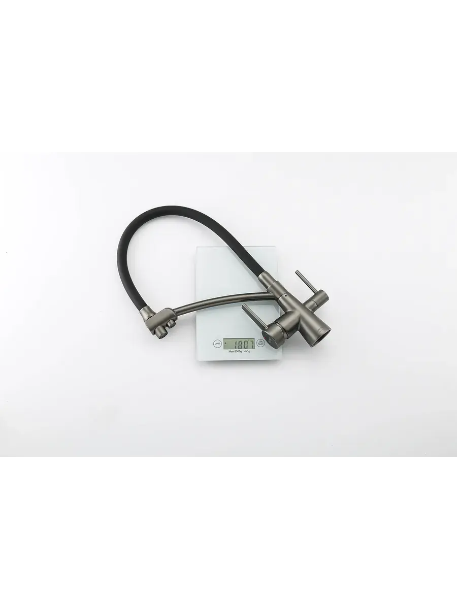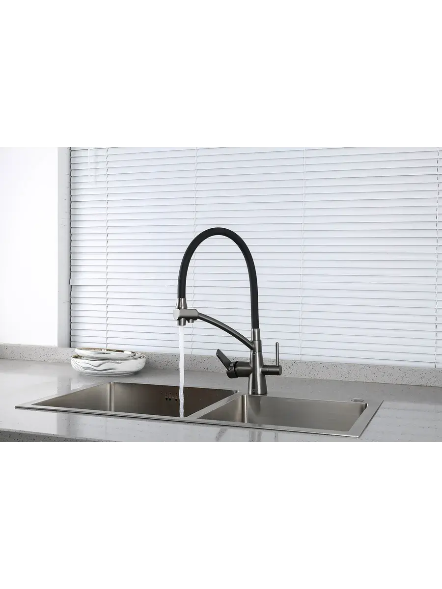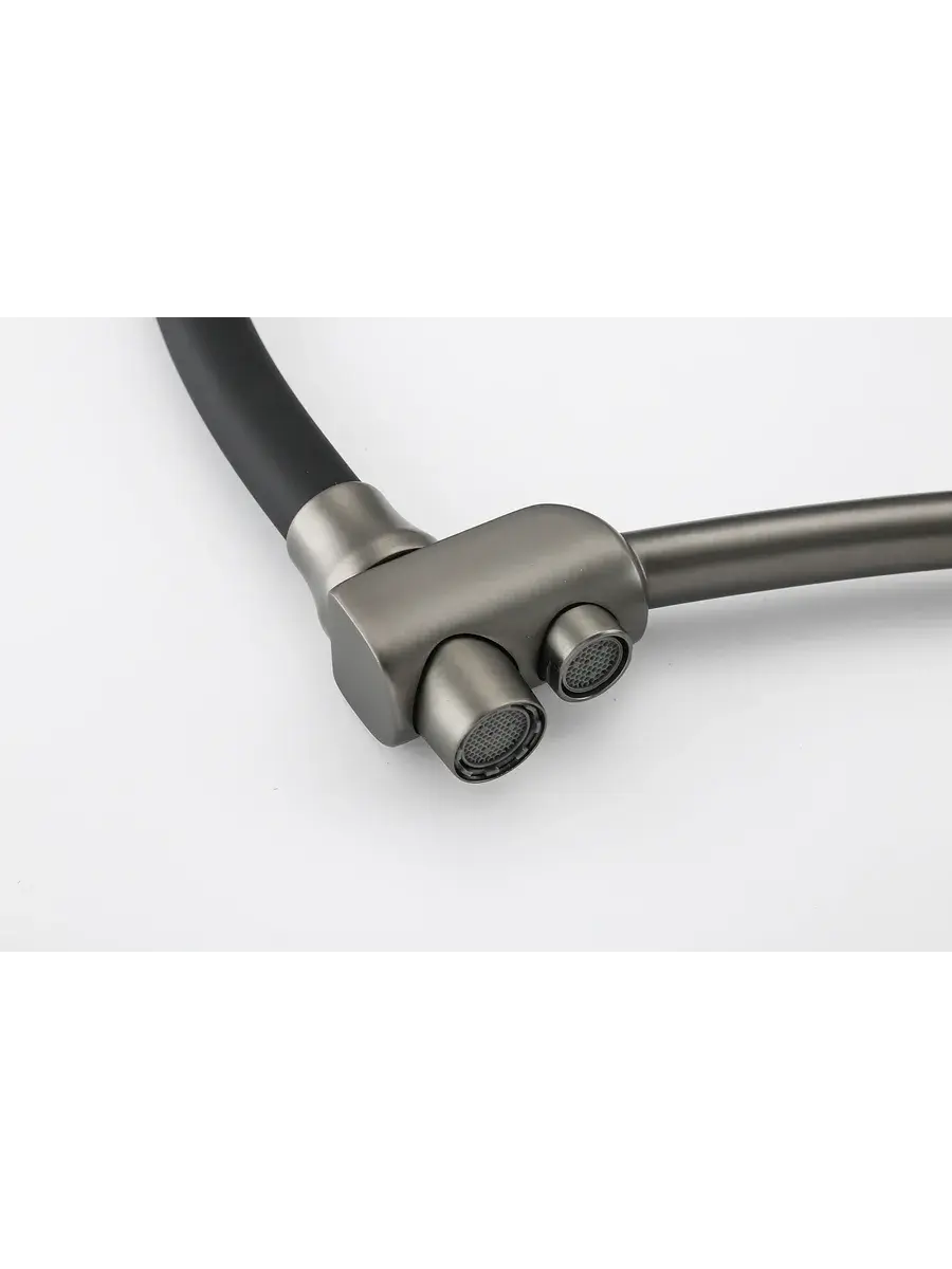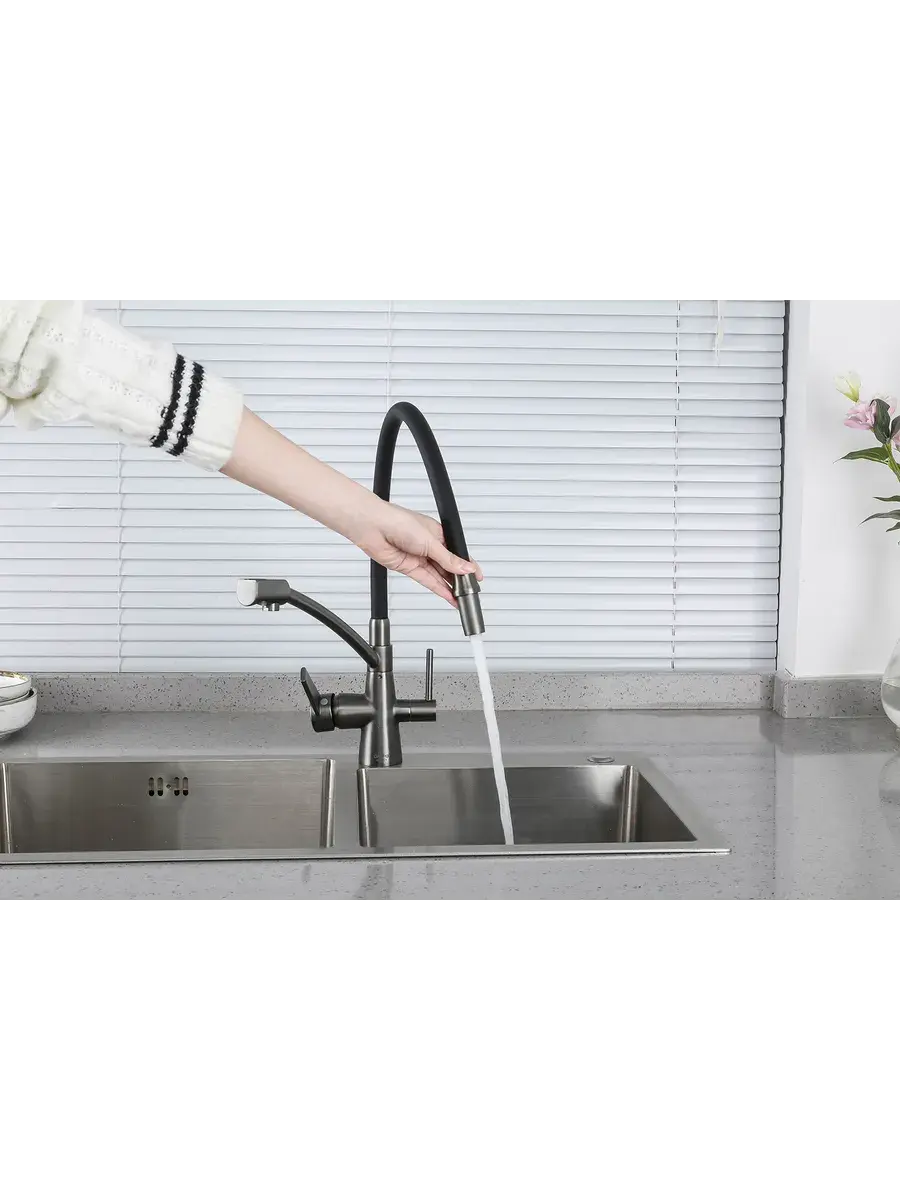 Смеситель для кухни с гибким изливом и подключением к фильтру Gappo G4398-19 в цвете оружейная сталь – стильное и функциональное решение для вашей кухни. Модель оснащена гибким поворотным изливом высотой 43 см и длиной 23 см, что обеспечивает удобство использования при мытье посуды и заполнении емкостей. Встроенный фильтр и аэратор гарантируют чистую воду и экономию ее расхода. Двухрычажный механизм управления позволяет легко регулировать температуру и напор воды. Смеситель выполнен из латуни и силикона, что обеспечивает его прочность и долговечность.