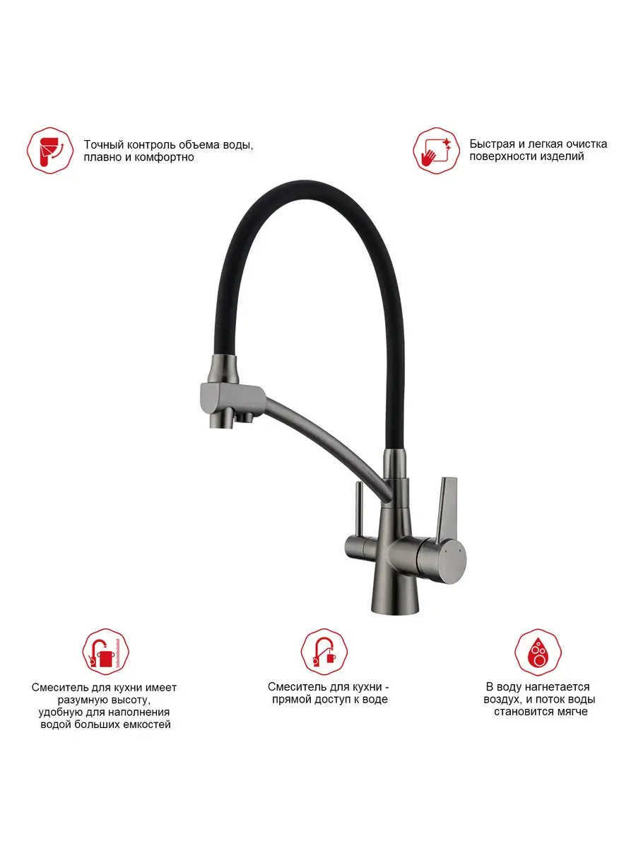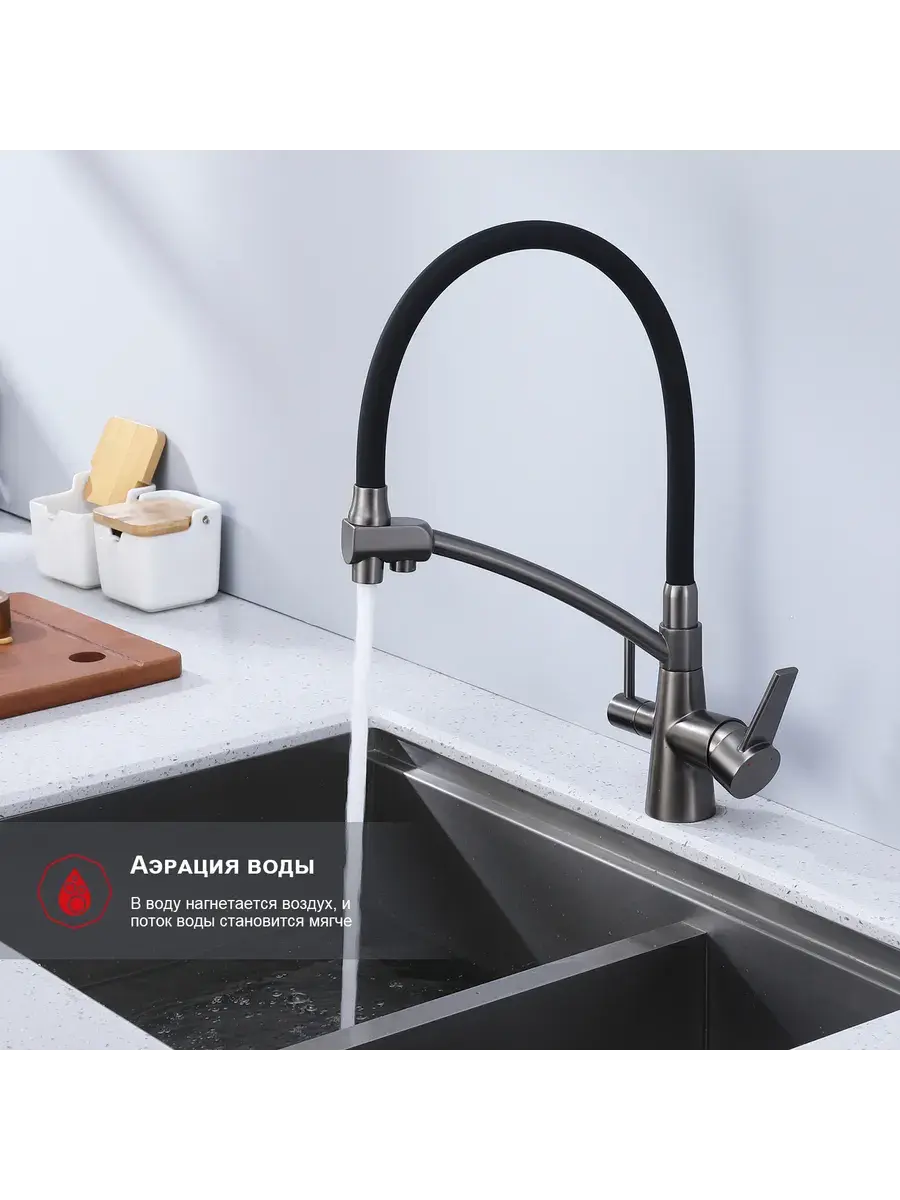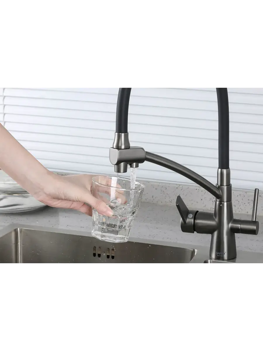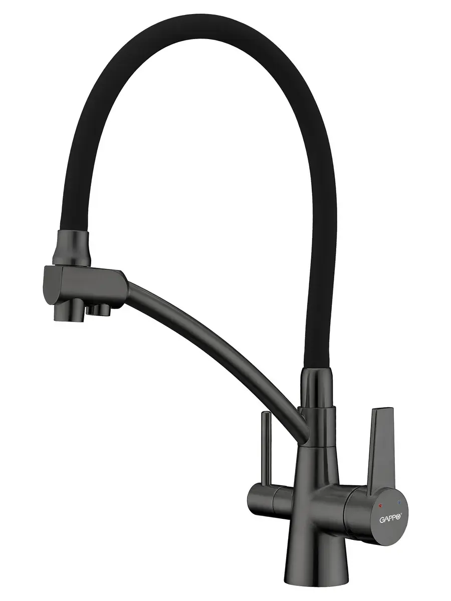 Смеситель для кухни с гибким изливом и подключением к фильтру Gappo G4398-19 в цвете оружейная сталь – стильное и функциональное решение для вашей кухни. Модель оснащена гибким поворотным изливом высотой 43 см и длиной 23 см, что обеспечивает удобство использования при мытье посуды и заполнении емкостей. Встроенный фильтр и аэратор гарантируют чистую воду и экономию ее расхода. Двухрычажный механизм управления позволяет легко регулировать температуру и напор воды. Смеситель выполнен из латуни и силикона, что обеспечивает его прочность и долговечность.