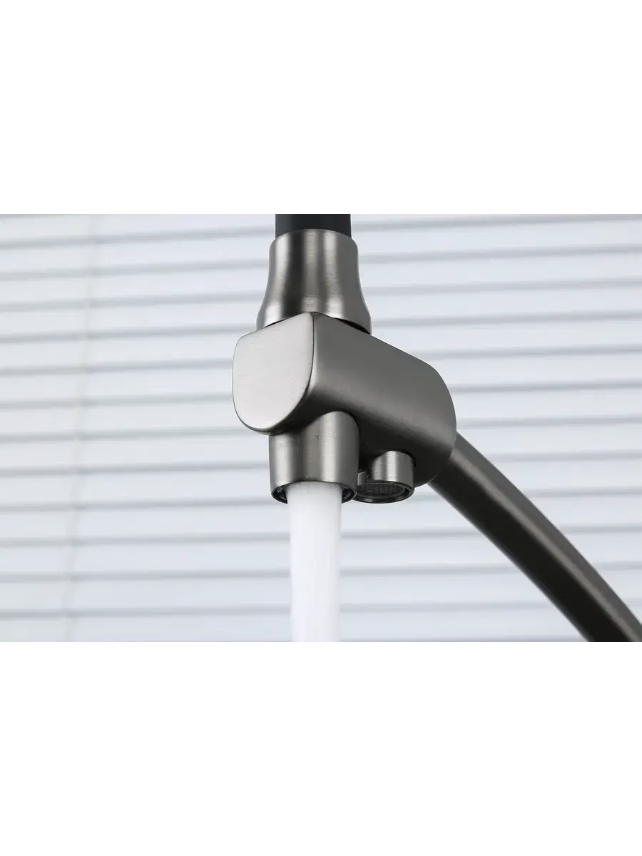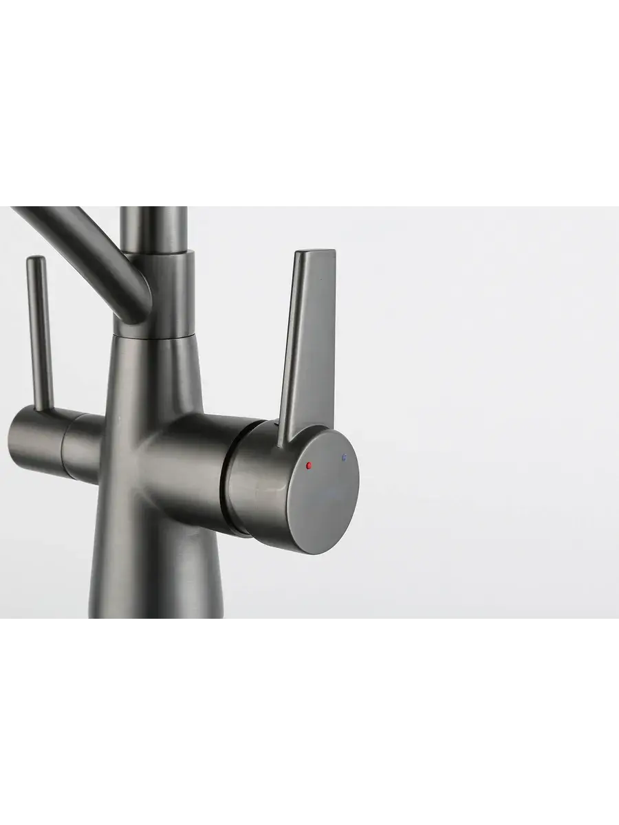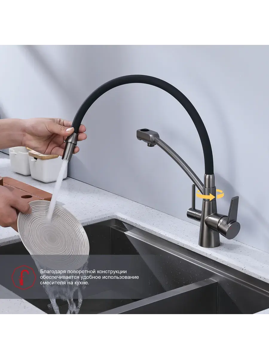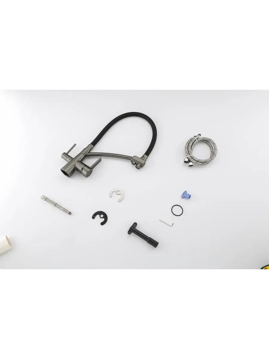 Смеситель для кухни с гибким изливом и подключением к фильтру Gappo G4398-19 в цвете оружейная сталь – стильное и функциональное решение для вашей кухни. Модель оснащена гибким поворотным изливом высотой 43 см и длиной 23 см, что обеспечивает удобство использования при мытье посуды и заполнении емкостей. Встроенный фильтр и аэратор гарантируют чистую воду и экономию ее расхода. Двухрычажный механизм управления позволяет легко регулировать температуру и напор воды. Смеситель выполнен из латуни и силикона, что обеспечивает его прочность и долговечность.