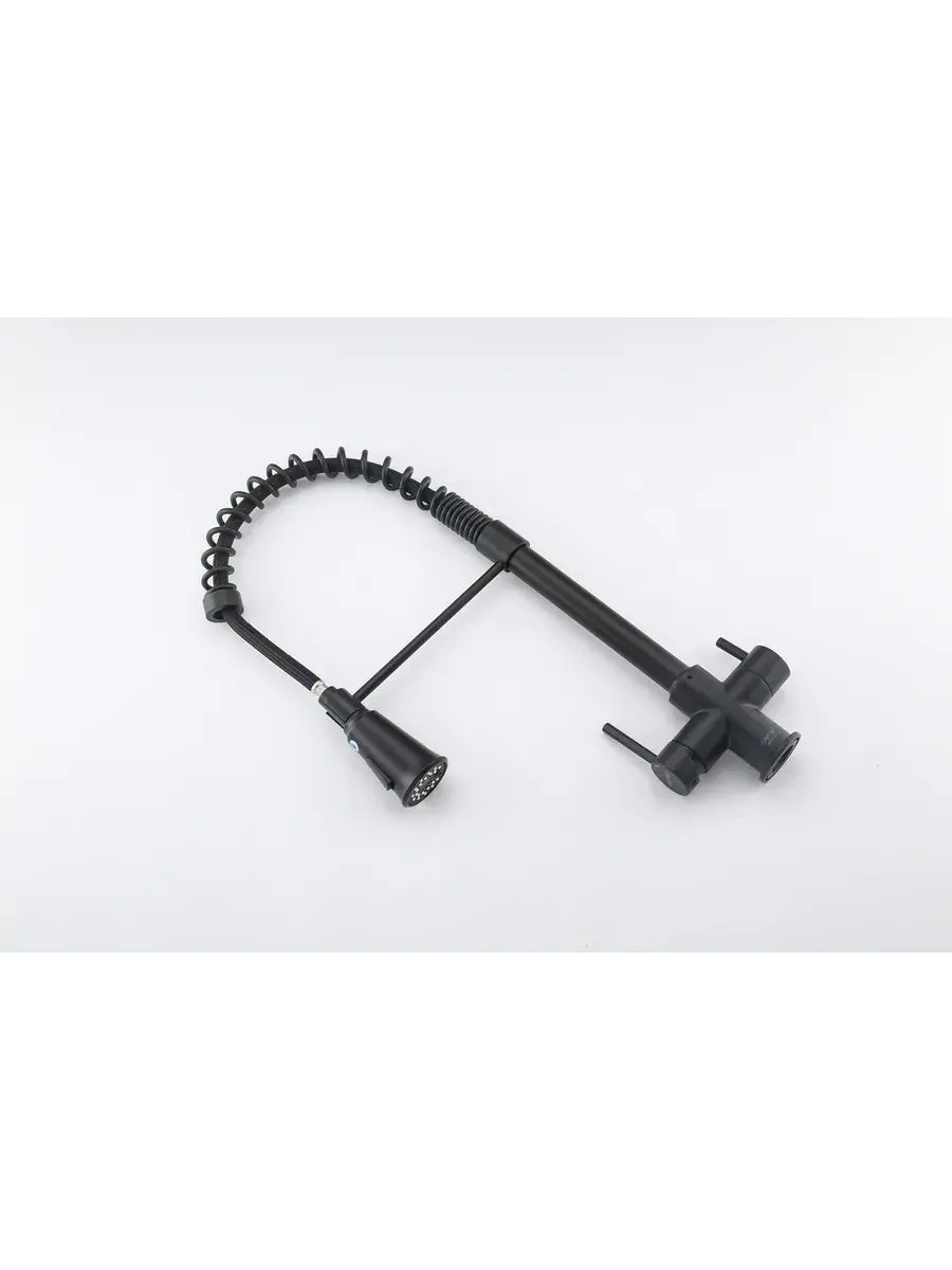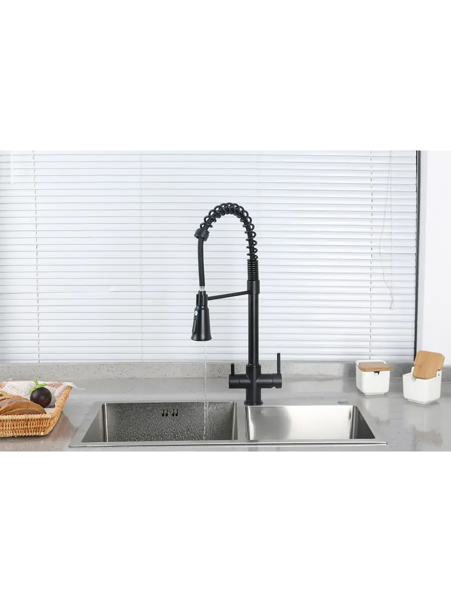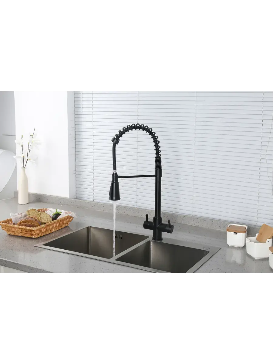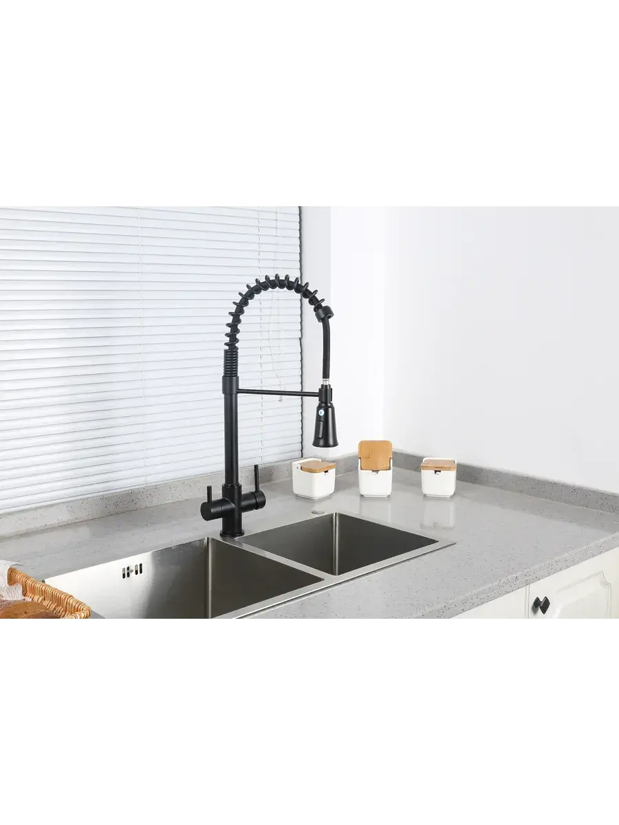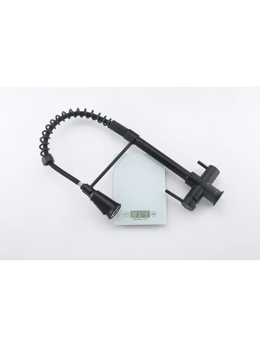 Смеситель для кухни с гибким изливом и подключением к фильтру Gappo G4398-66 в черном цвете – стильное и функциональное решение для вашей кухни. Модель оснащена гибким поворотным изливом высотой 58 см и длиной 23 см, что обеспечивает удобство использования при мытье посуды и заполнении емкостей. Встроенный фильтр и аэратор гарантируют чистую воду и экономию ее расхода. Двухрычажный механизм управления позволяет легко регулировать температуру и напор воды. Смеситель выполнен из латуни и силикона, что обеспечивает его прочность и долговечность.