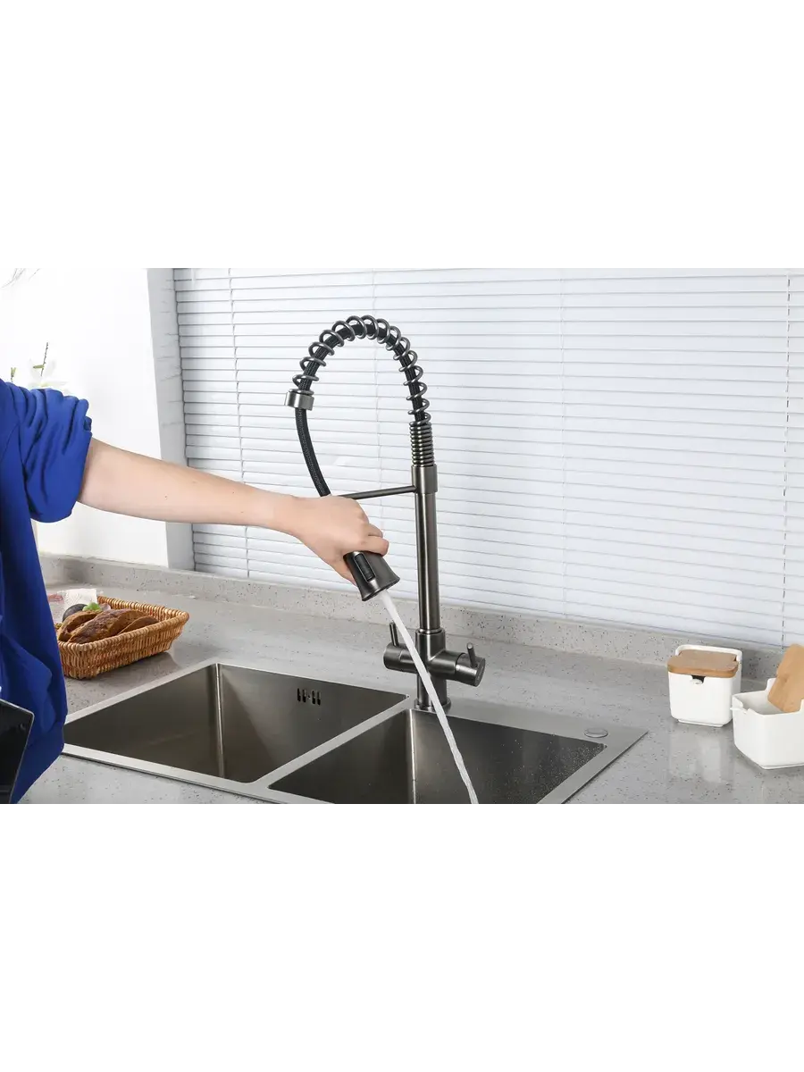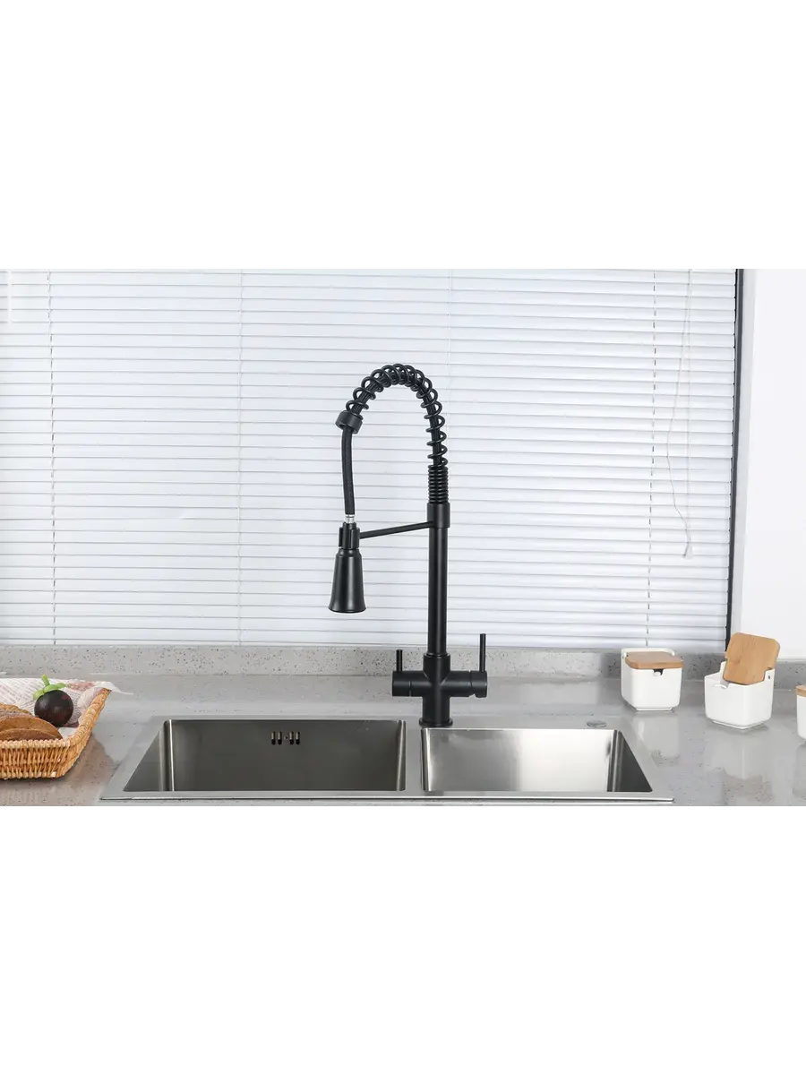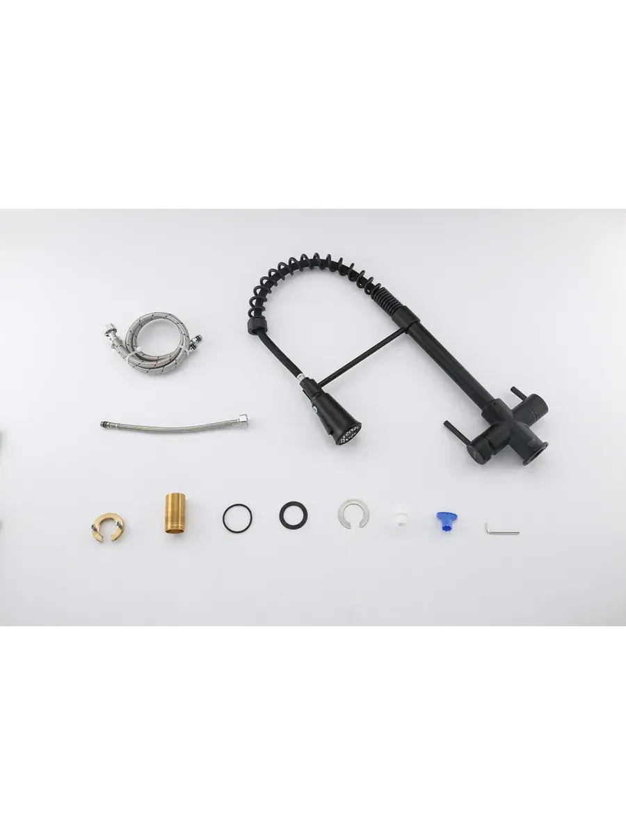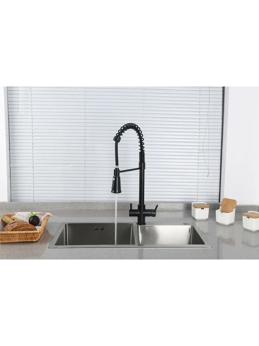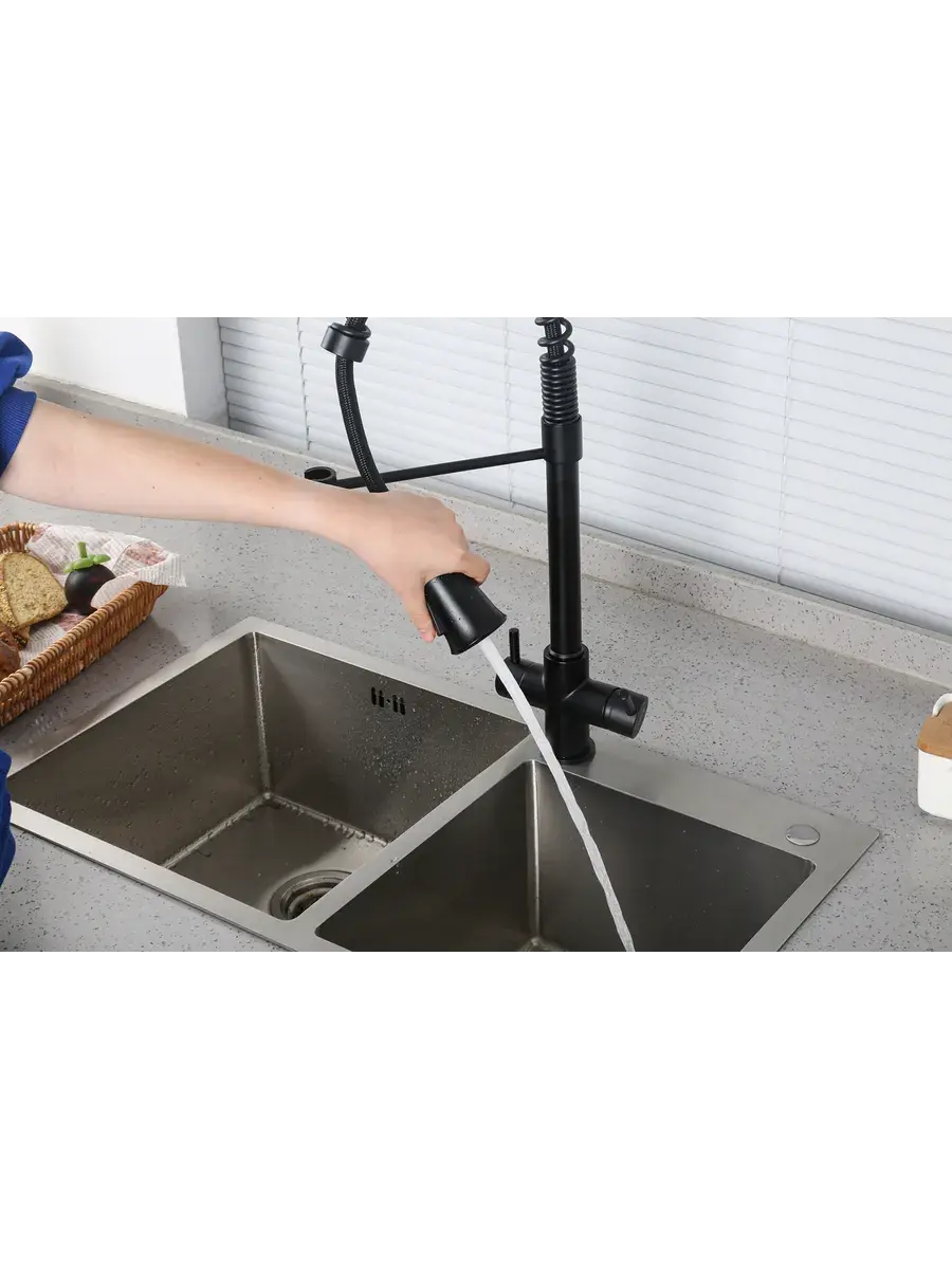 Смеситель для кухни с гибким изливом и подключением к фильтру Gappo G4398-66 в черном цвете – стильное и функциональное решение для вашей кухни. Модель оснащена гибким поворотным изливом высотой 58 см и длиной 23 см, что обеспечивает удобство использования при мытье посуды и заполнении емкостей. Встроенный фильтр и аэратор гарантируют чистую воду и экономию ее расхода. Двухрычажный механизм управления позволяет легко регулировать температуру и напор воды. Смеситель выполнен из латуни и силикона, что обеспечивает его прочность и долговечность.