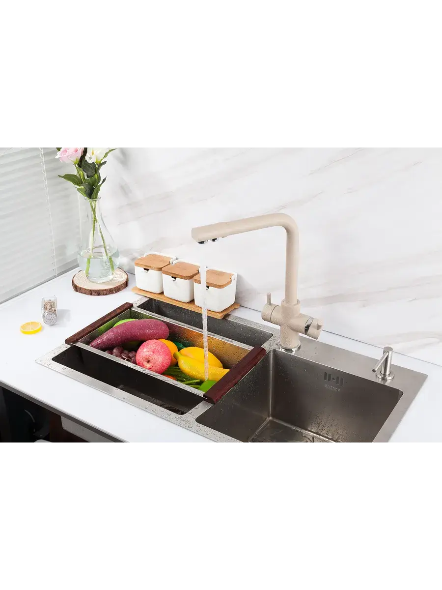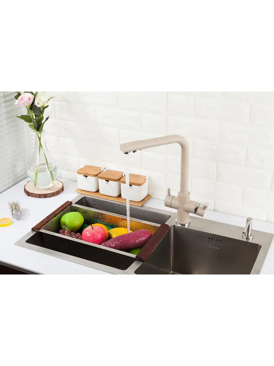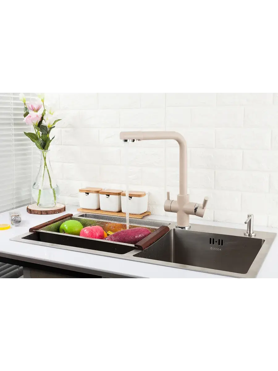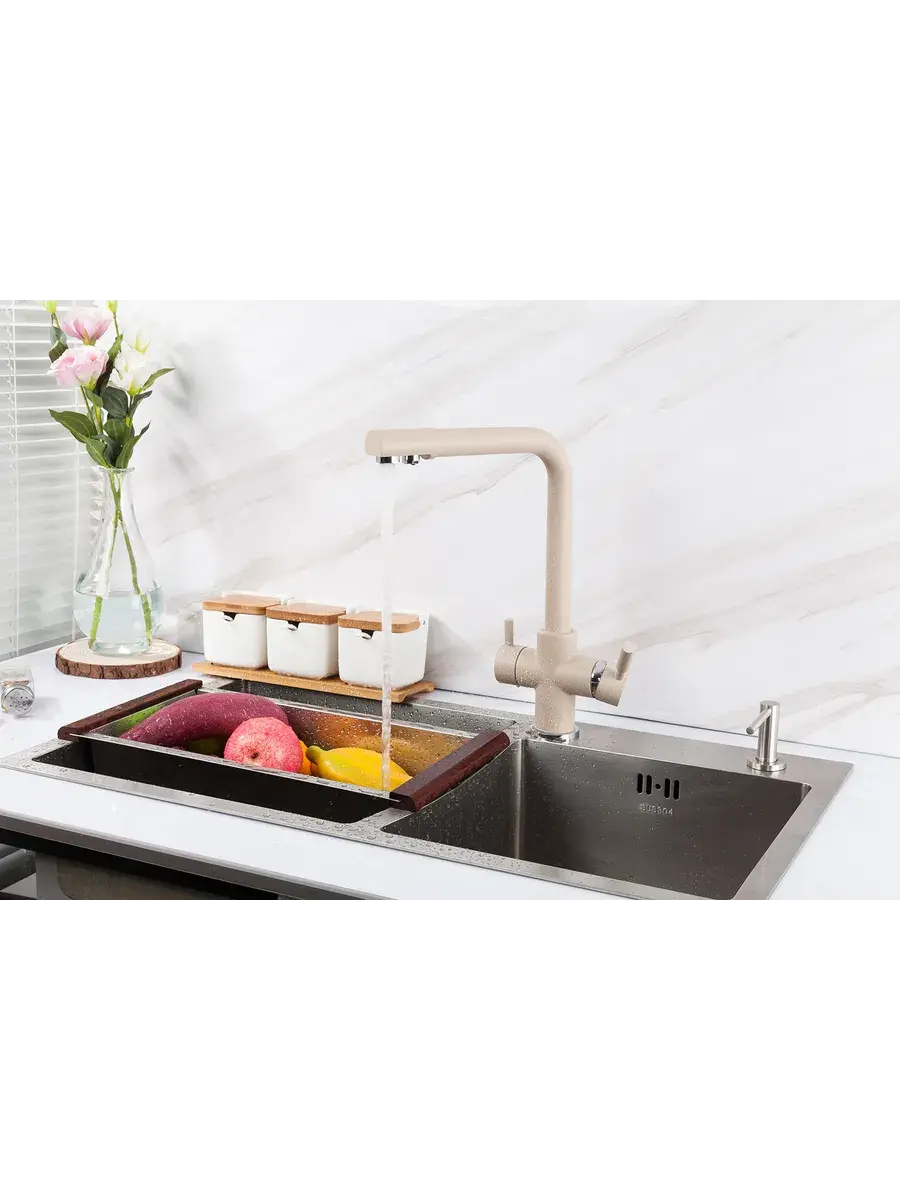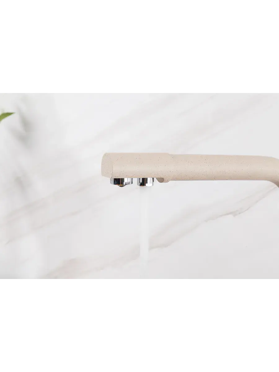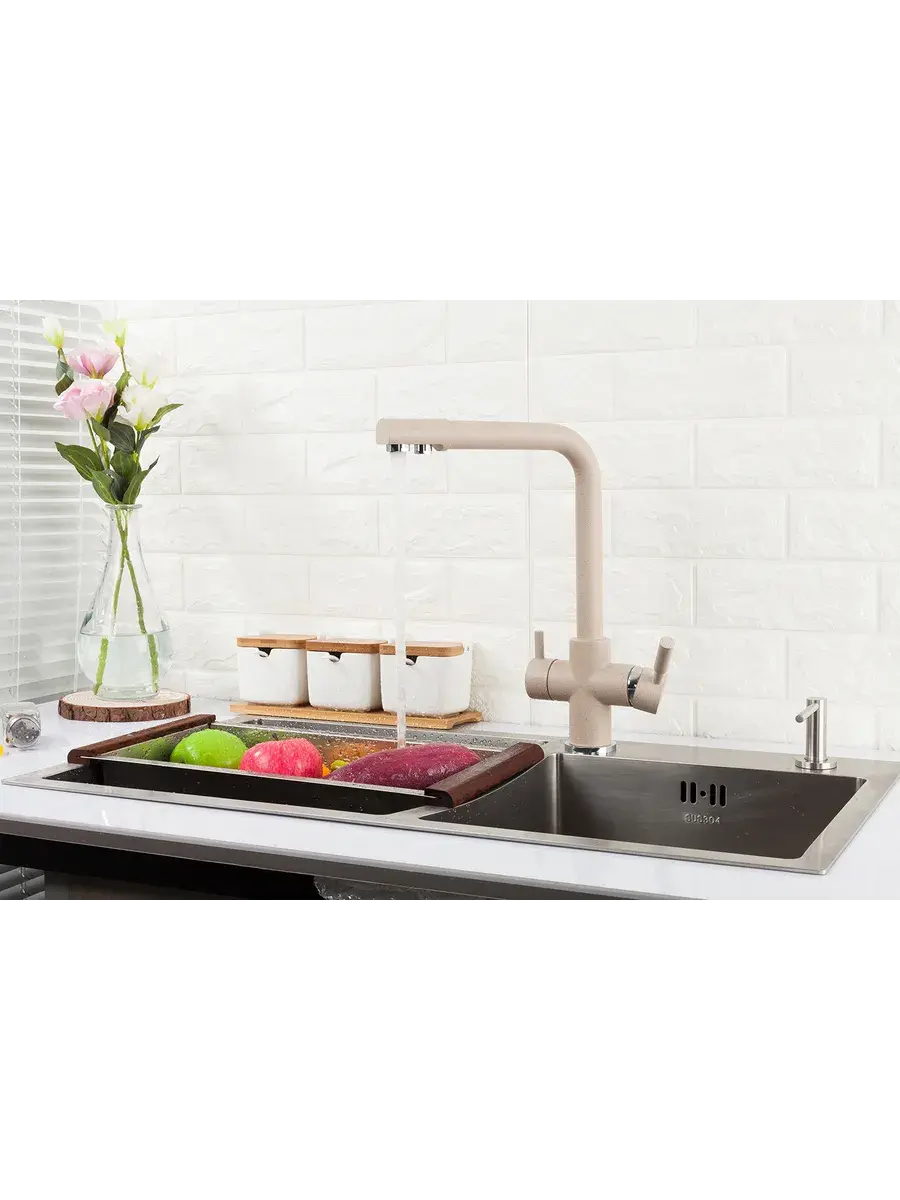 Если вы задумали ремонт на кухне, советуем обратить внимание на наш новый кухонный смеситель F4352-23 в светло-бежевом цвете . Он разработан немецким брендом по новейшей технологии. Наш магазин - официальный дилер FRAP в России. Мы поставляем только оригинальную продукцию и даем 3 года гарантии на изделия. Frap представляет новый смеситель для кухни с фильтром, который станет незаменимой частью на вашей кухни. Этот смеситель сделан из латуни высокого качества, что обеспечивает прочность, надежность и долговечность устройства. Оснащен высоким универсальным изливом, который идеально подходит для моек кухонных и позволяет заполнять большие емкости, чтобы ускорить процесс приготовление пищи, облегчить мытье противней, кастрюль. Кроме того, кран оснащен изливом, который легко поворачивается на 360 градусов, что делает его более удобным в использовании. Имеет керамический картридж, что позволяет точно регулировать температуру и напор воды. Аэратор обеспечивает более мягкий и экономный поток воды, что помогает сэкономить воду и снизить счета за электричество. Имеет гибкий тип подводки, что позволяет упростить процесс установки. Он является идеальным выбором для тех, кто ищет качественный, удобный и надежный смеситель для своей кухни. Отлично сочетается с любым дизайном.