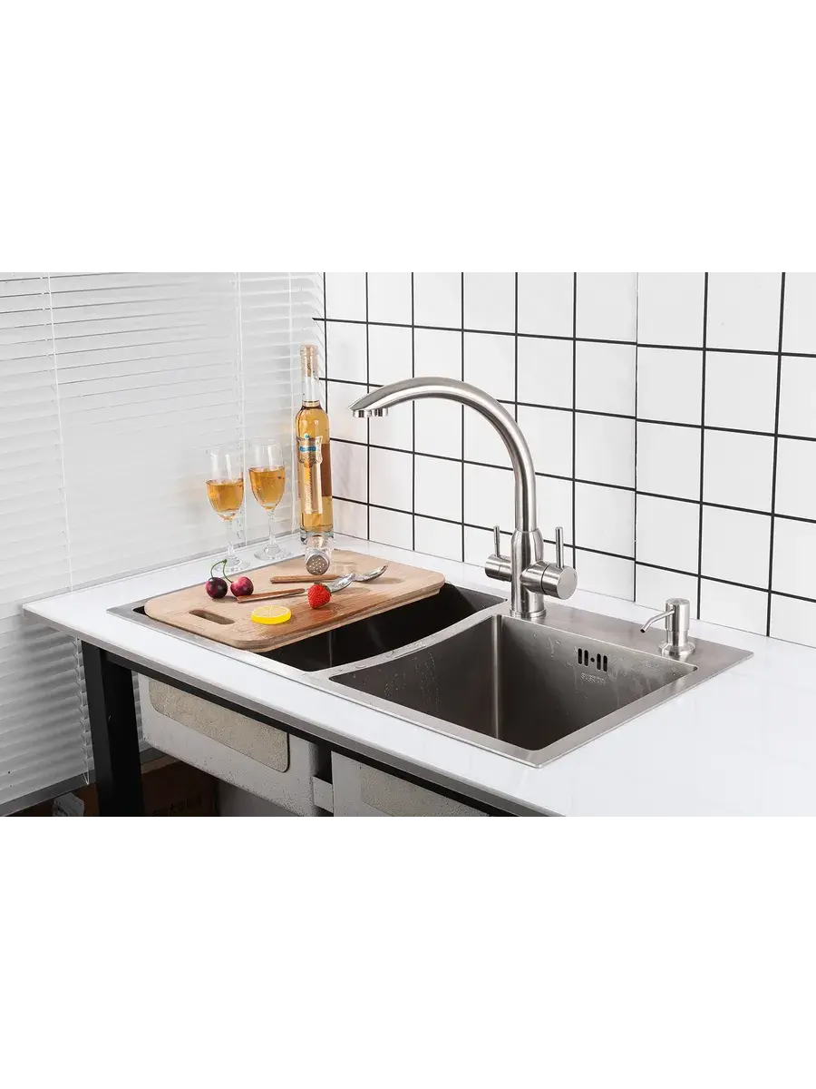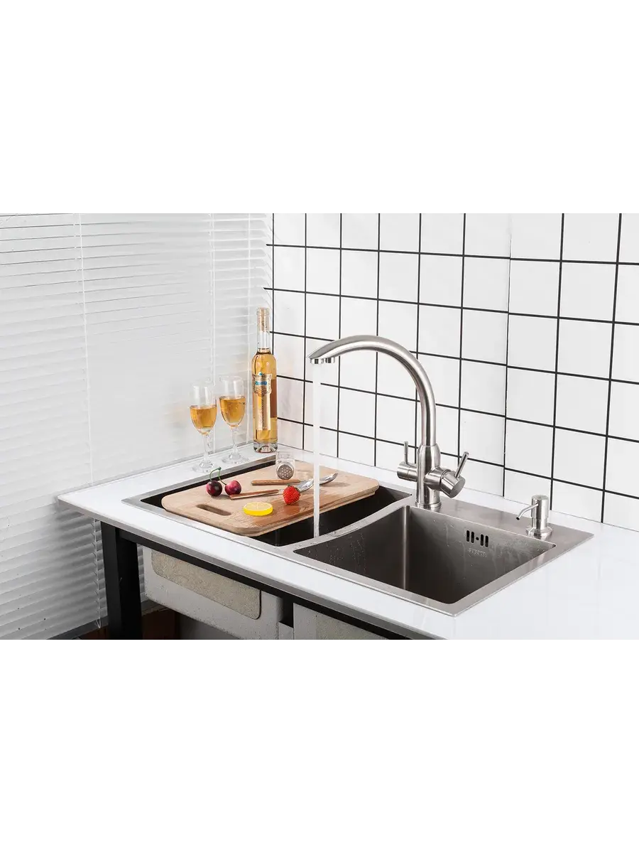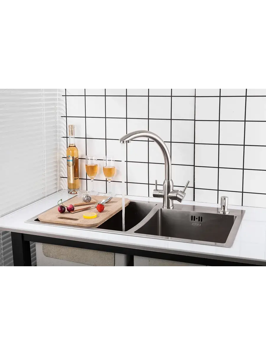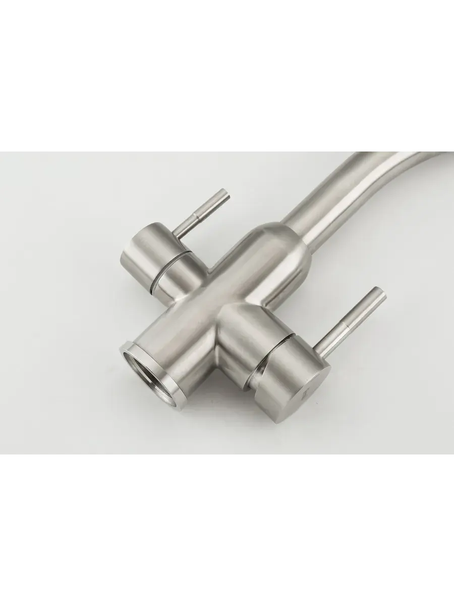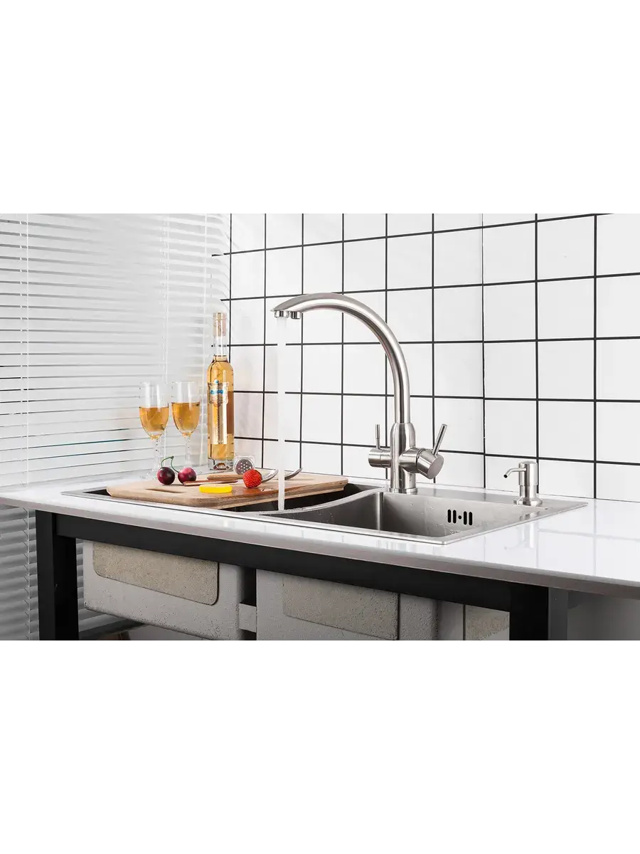 Смеситель для кухни с подключением к фильтру и выдвижным изливом FRAP F43899 в цвете хром станет стильным и функциональным дополнением к вашей кухне. Модель оснащена выдвижным изливом с поворотным механизмом, что обеспечивает удобство использования и максимальный радиус действия. Высота излива составляет 34 см, а длина - 20.4 см, что позволяет комфортно мыть даже габаритную посуду. Смеситель FRAP F4396-30 оборудован встроенным фильтром для чистой питьевой воды, а также аэратором для экономии воды. Двухрычажный механизм управления и керамический картридж гарантируют плавную регулировку температуры и напора воды.