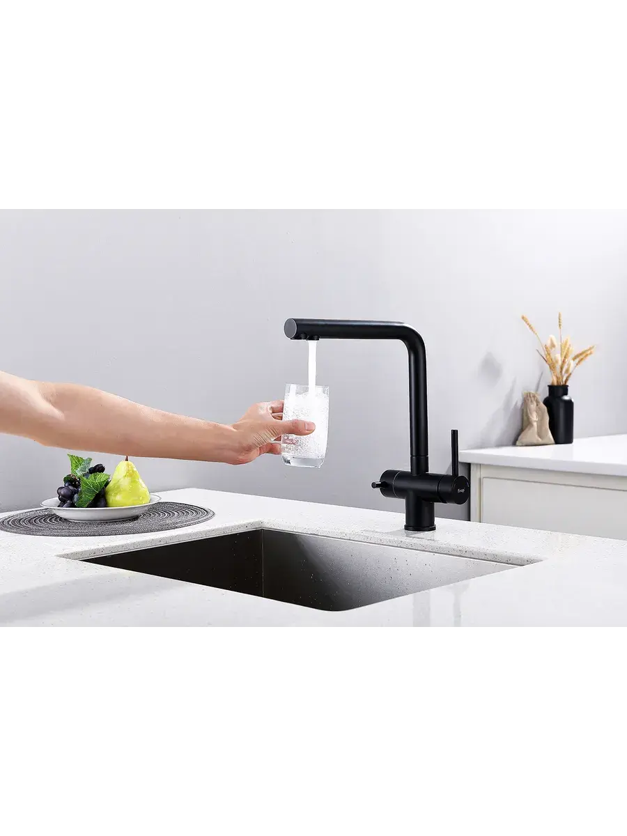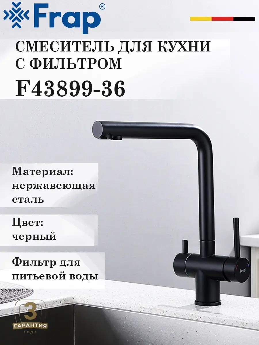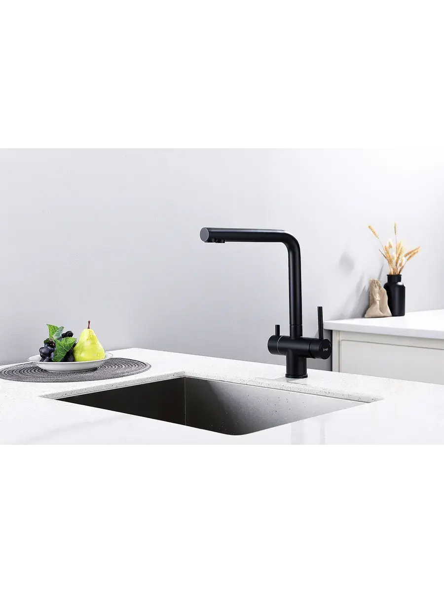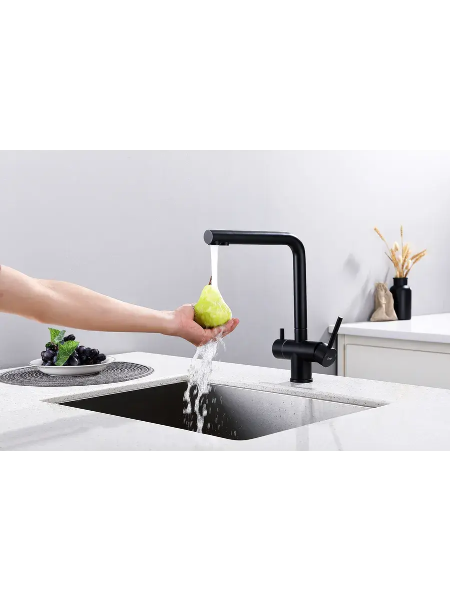 Смеситель для кухни с подключением к фильтру и выдвижным изливом FRAP F43899-36 в черном цвете станет стильным и функциональным дополнением к вашей кухне. Модель оснащена выдвижным изливом с поворотным механизмом, что обеспечивает удобство использования и максимальный радиус действия. Высота излива составляет 32,7 см, а длина - 23,5 см, что позволяет комфортно мыть даже габаритную посуду. Смеситель FRAP F43899-36 оборудован встроенным фильтром для чистой питьевой воды, а также аэратором для экономии воды. Двухрычажный механизм управления и керамический картридж гарантируют плавную регулировку температуры и напора воды.
