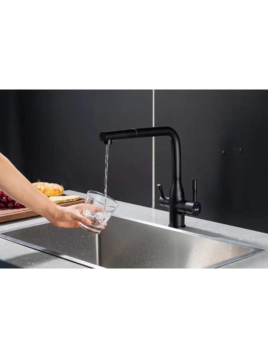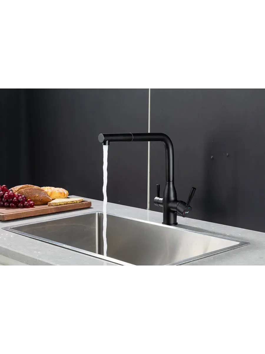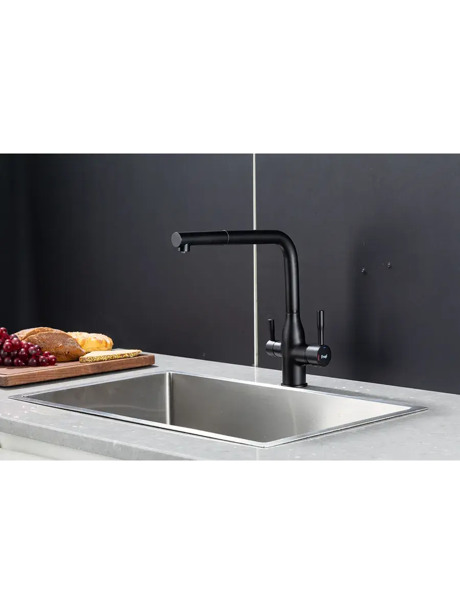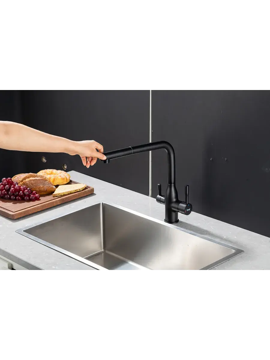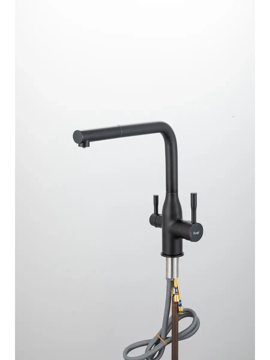Смеситель для кухни с подключением к фильтру и выдвижным изливом FRAP F4396-36 в черном цвете станет стильным и функциональным дополнением к вашей кухне. Модель оснащена выдвижным изливом с поворотным механизмом, что обеспечивает удобство использования и максимальный радиус действия. Высота излива составляет 32.5 см, а длина - 28.6 см, что позволяет комфортно мыть даже габаритную посуду. Смеситель FRAP F4396-36 оборудован встроенным фильтром для чистой питьевой воды, а также аэратором для экономии воды. Двухрычажный механизм управления и керамический картридж гарантируют плавную регулировку температуры и напора воды.