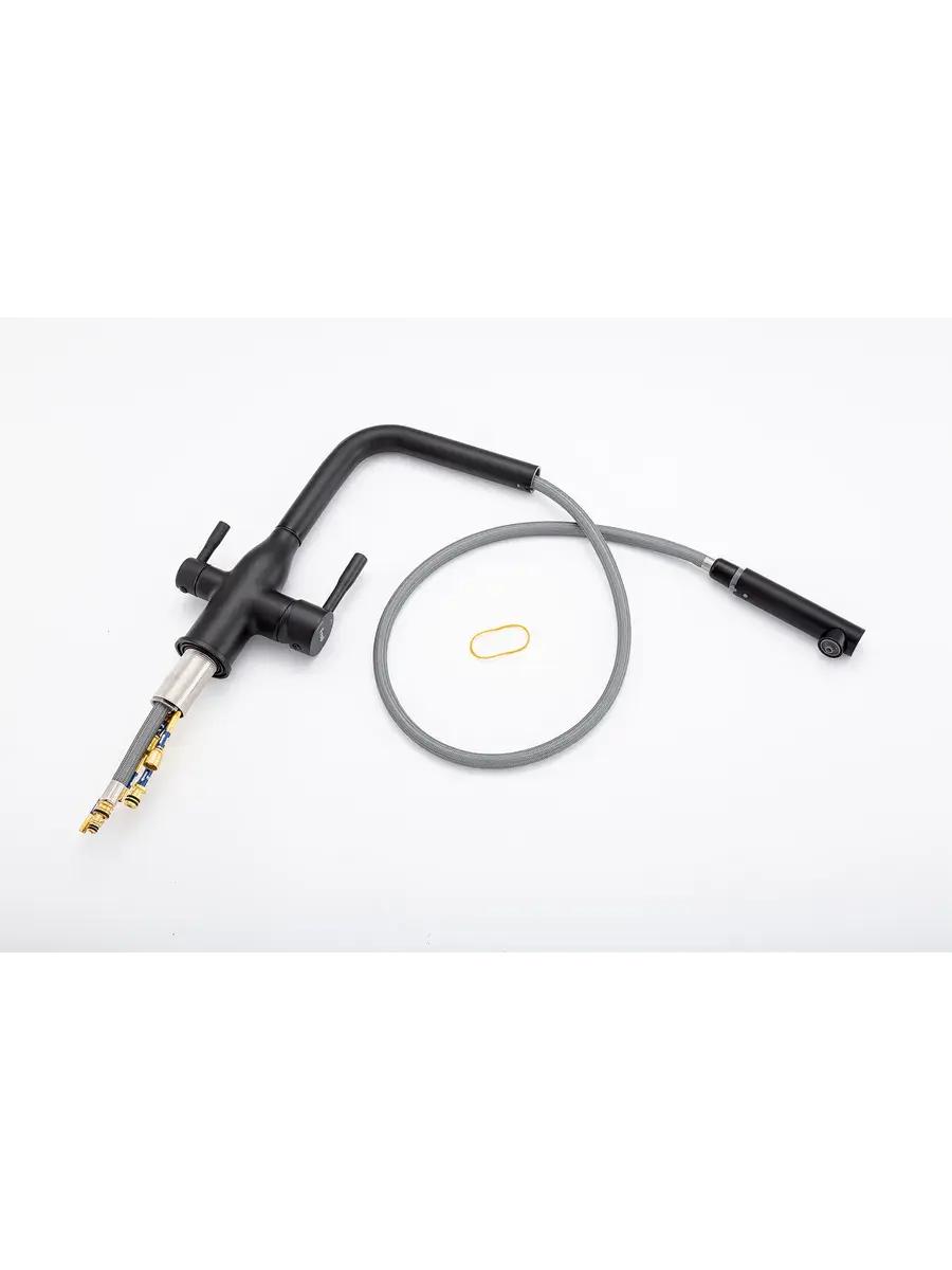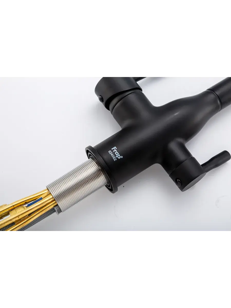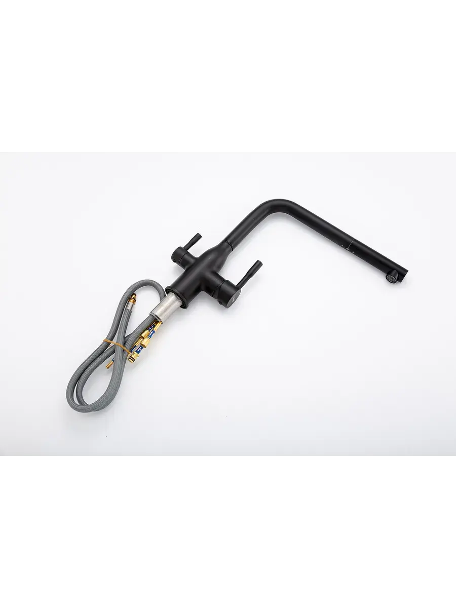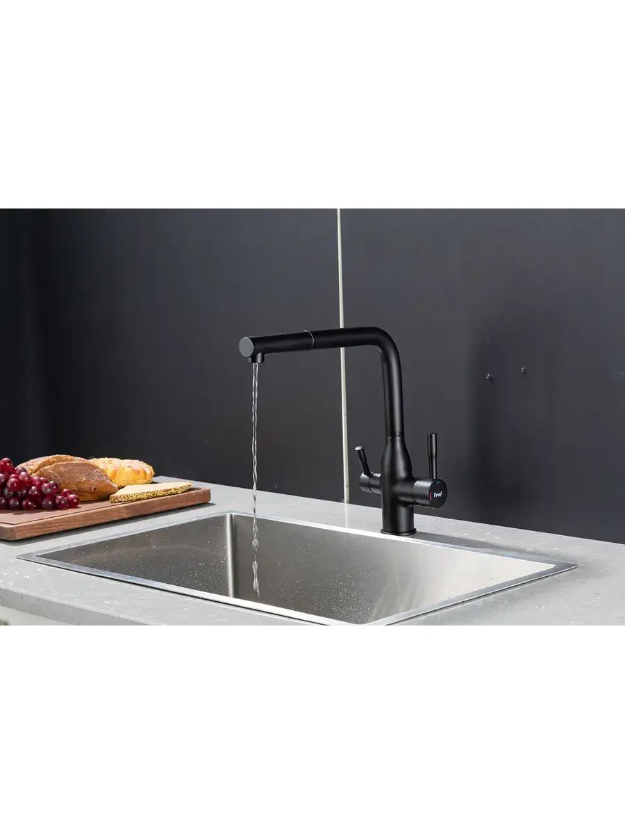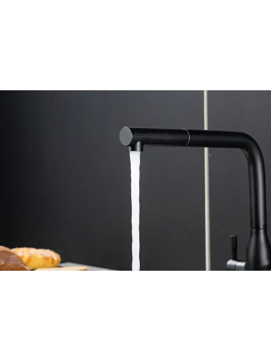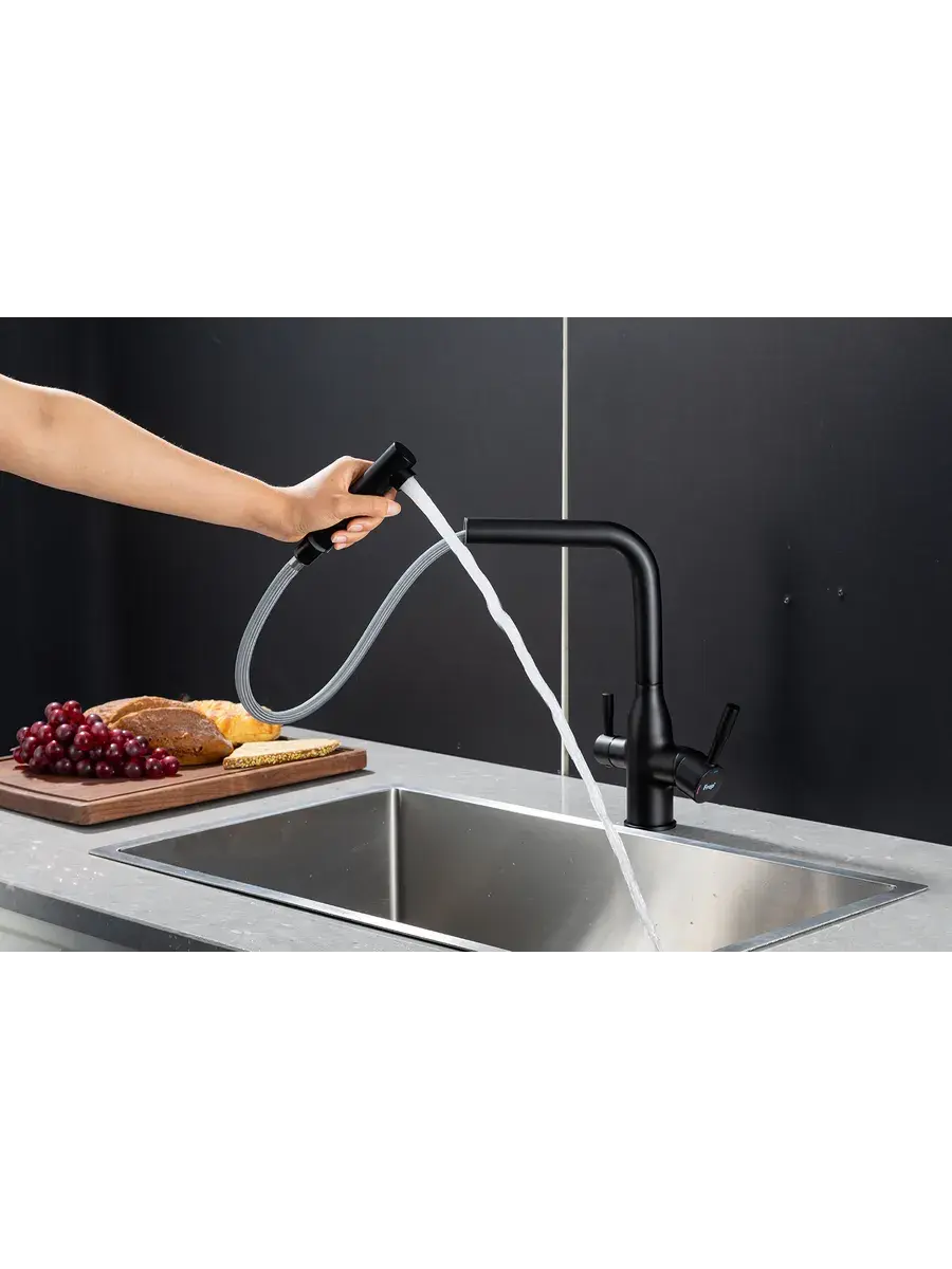 Смеситель для кухни с подключением к фильтру и выдвижным изливом FRAP F4396-36 в черном цвете станет стильным и функциональным дополнением к вашей кухне. Модель оснащена выдвижным изливом с поворотным механизмом, что обеспечивает удобство использования и максимальный радиус действия. Высота излива составляет 32.5 см, а длина - 28.6 см, что позволяет комфортно мыть даже габаритную посуду. Смеситель FRAP F4396-36 оборудован встроенным фильтром для чистой питьевой воды, а также аэратором для экономии воды. Двухрычажный механизм управления и керамический картридж гарантируют плавную регулировку температуры и напора воды.