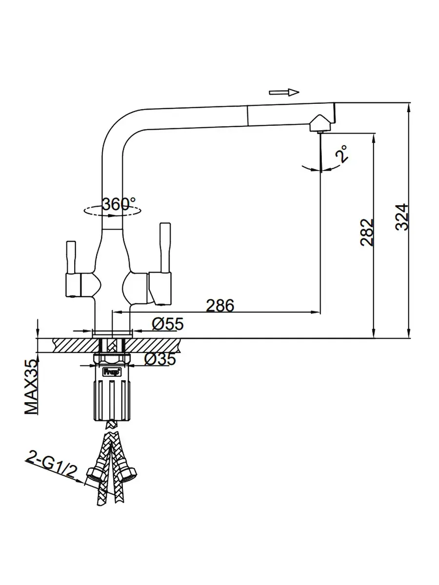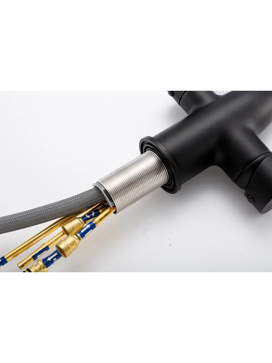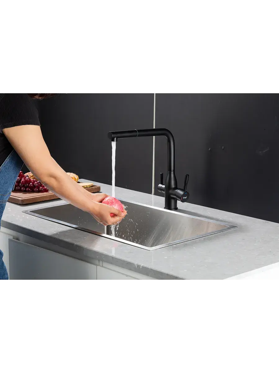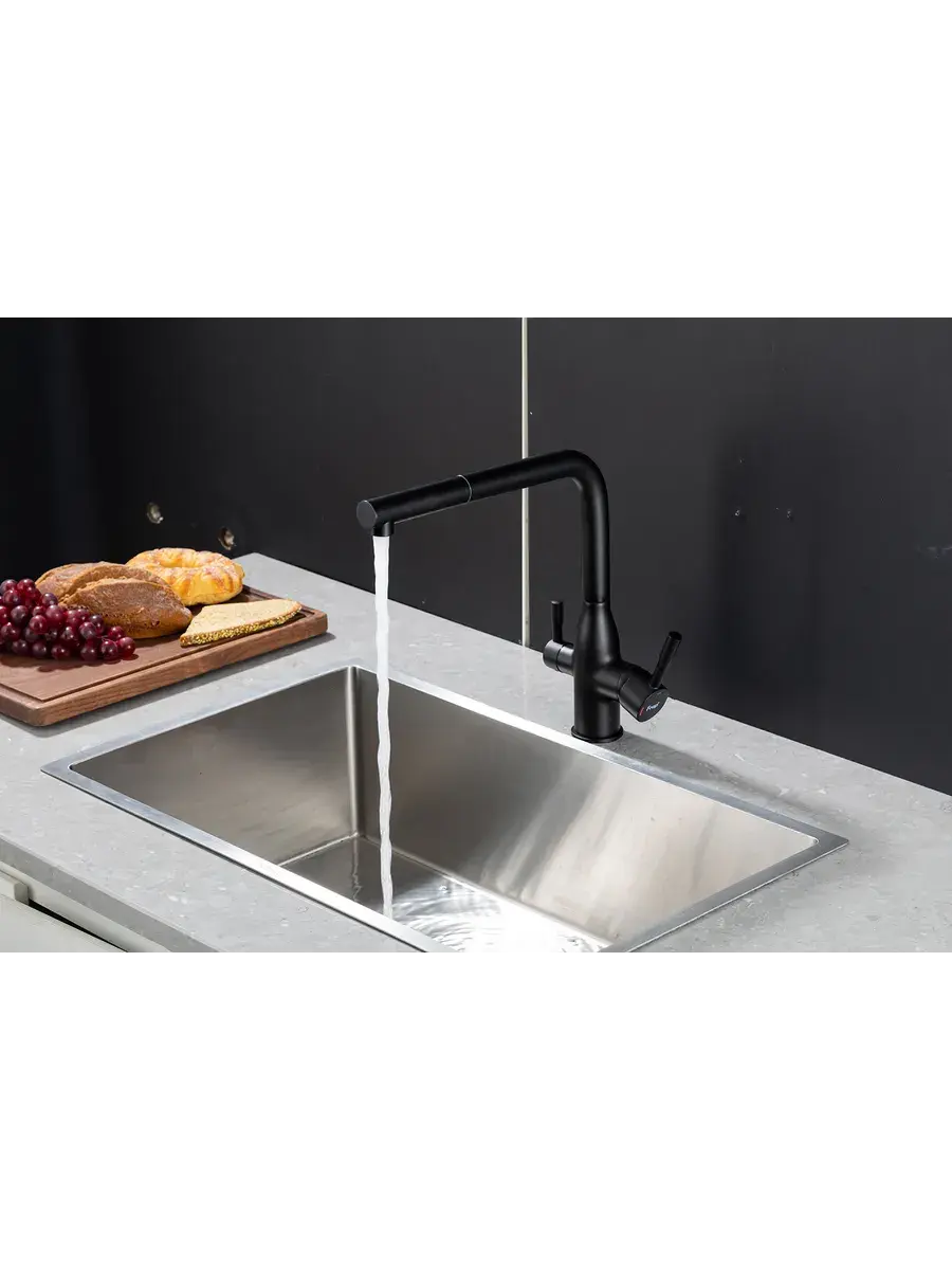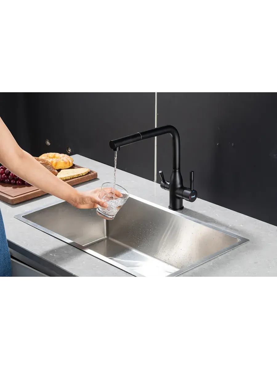 Смеситель для кухни с подключением к фильтру и выдвижным изливом FRAP F4396-36 в черном цвете станет стильным и функциональным дополнением к вашей кухне. Модель оснащена выдвижным изливом с поворотным механизмом, что обеспечивает удобство использования и максимальный радиус действия. Высота излива составляет 32.5 см, а длина - 28.6 см, что позволяет комфортно мыть даже габаритную посуду. Смеситель FRAP F4396-36 оборудован встроенным фильтром для чистой питьевой воды, а также аэратором для экономии воды. Двухрычажный механизм управления и керамический картридж гарантируют плавную регулировку температуры и напора воды.