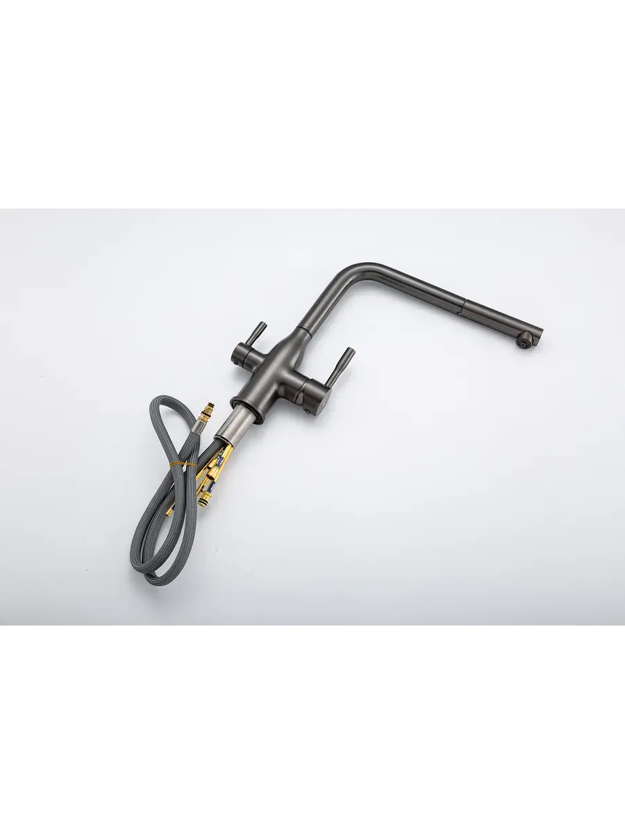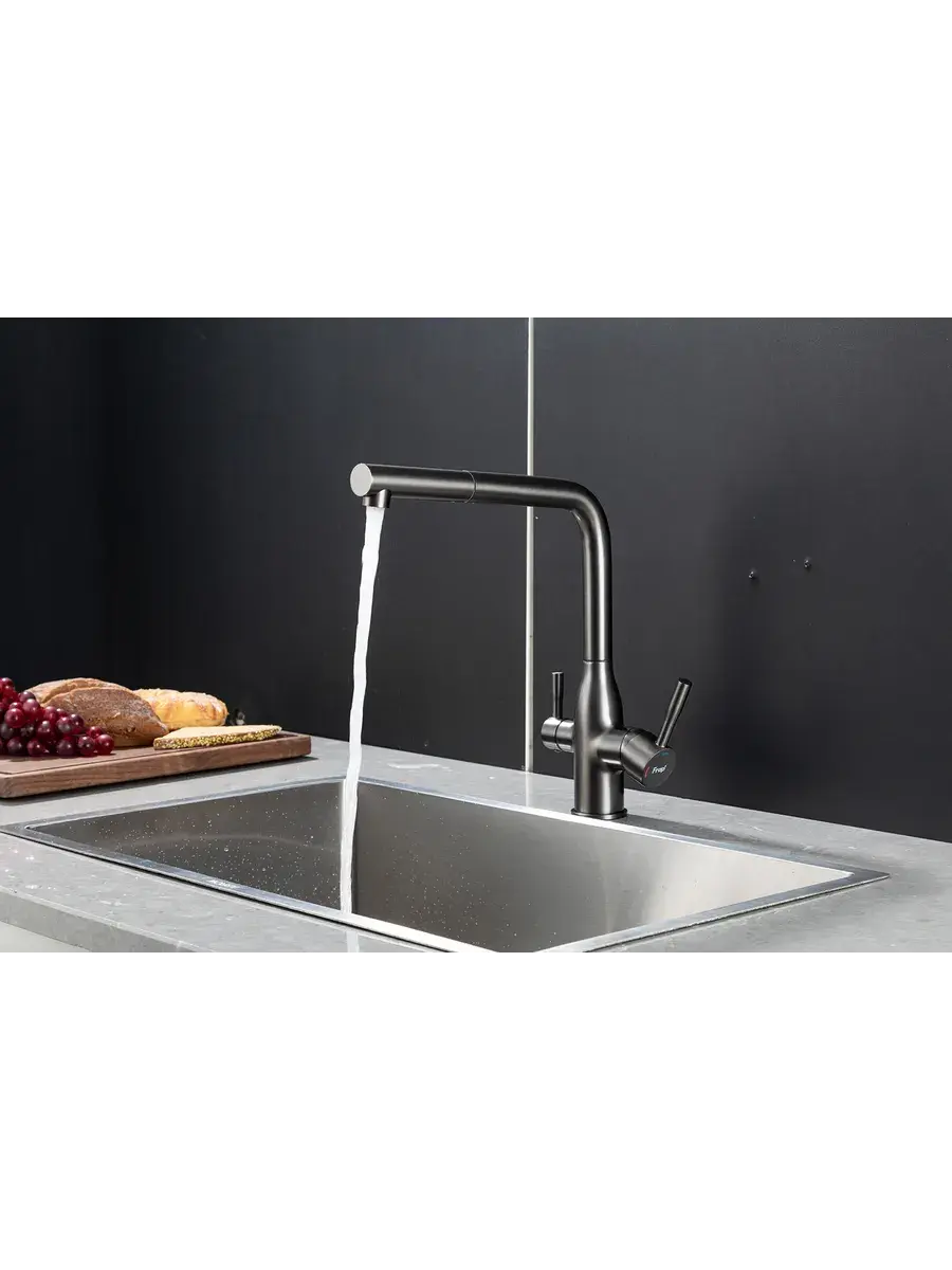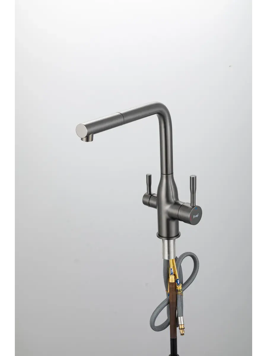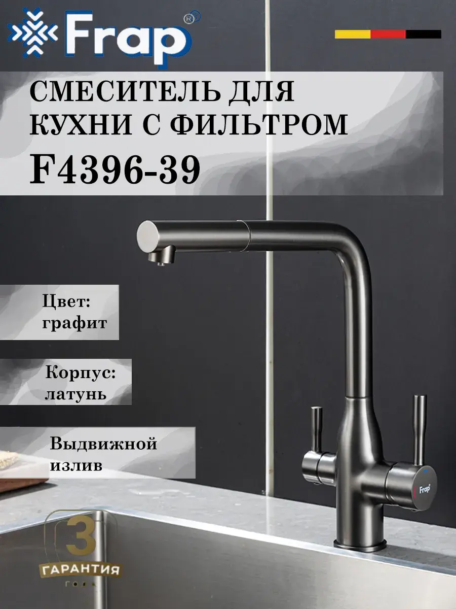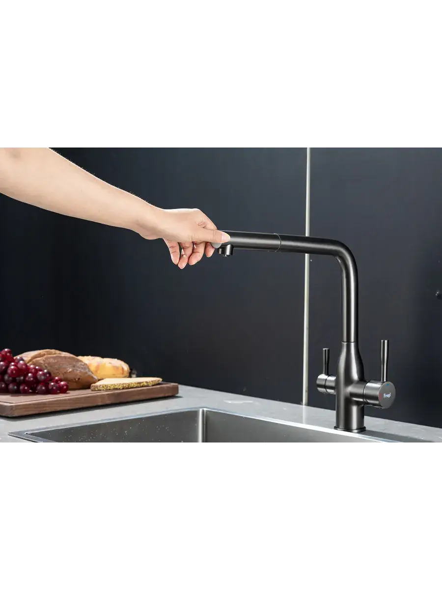 Смеситель для кухни с подключением к фильтру и выдвижным изливом FRAP F4396-39 в цвете оружейная сталь станет стильным и функциональным дополнением к вашей кухне. Модель оснащена выдвижным изливом с поворотным механизмом, что обеспечивает удобство использования и максимальный радиус действия. Высота излива составляет 32.5 см, а длина - 28.6 см, что позволяет комфортно мыть даже габаритную посуду. Смеситель FRAP F4396-39 оборудован встроенным фильтром для чистой питьевой воды, а также аэратором для экономии воды. Двухрычажный механизм управления и керамический картридж гарантируют плавную регулировку температуры и напора воды.