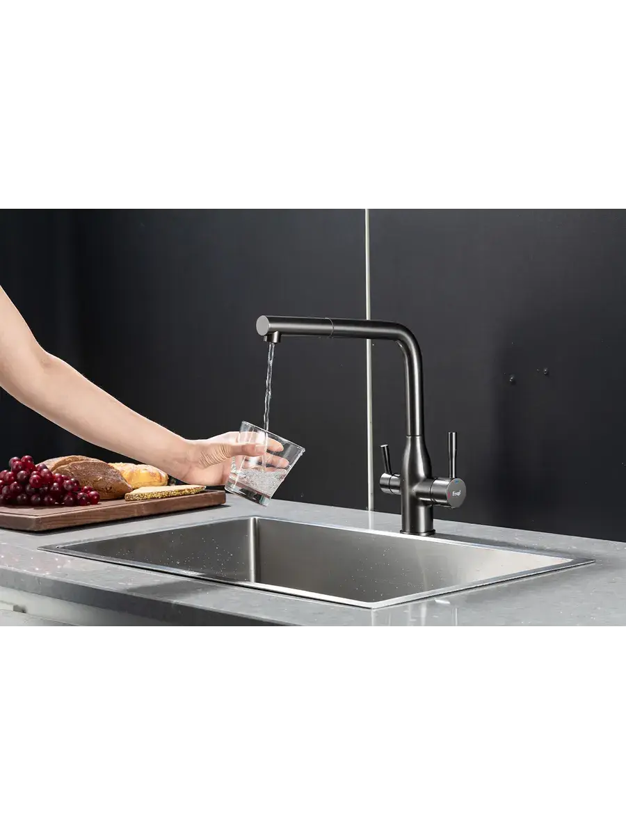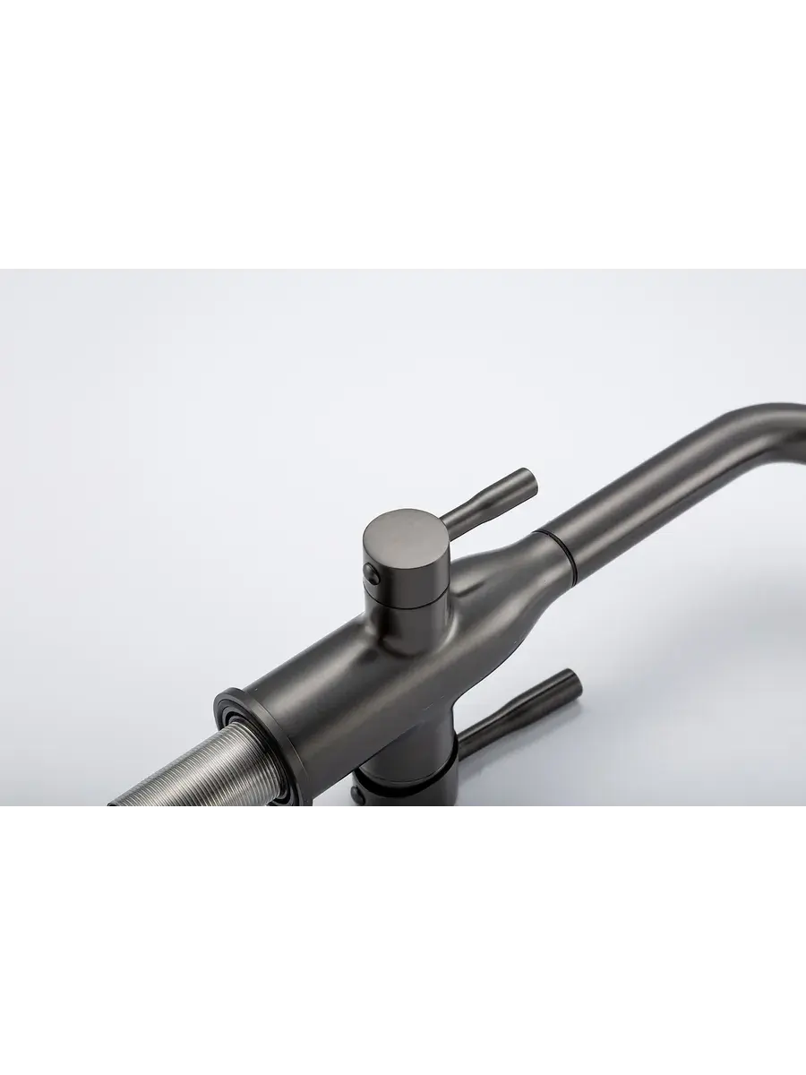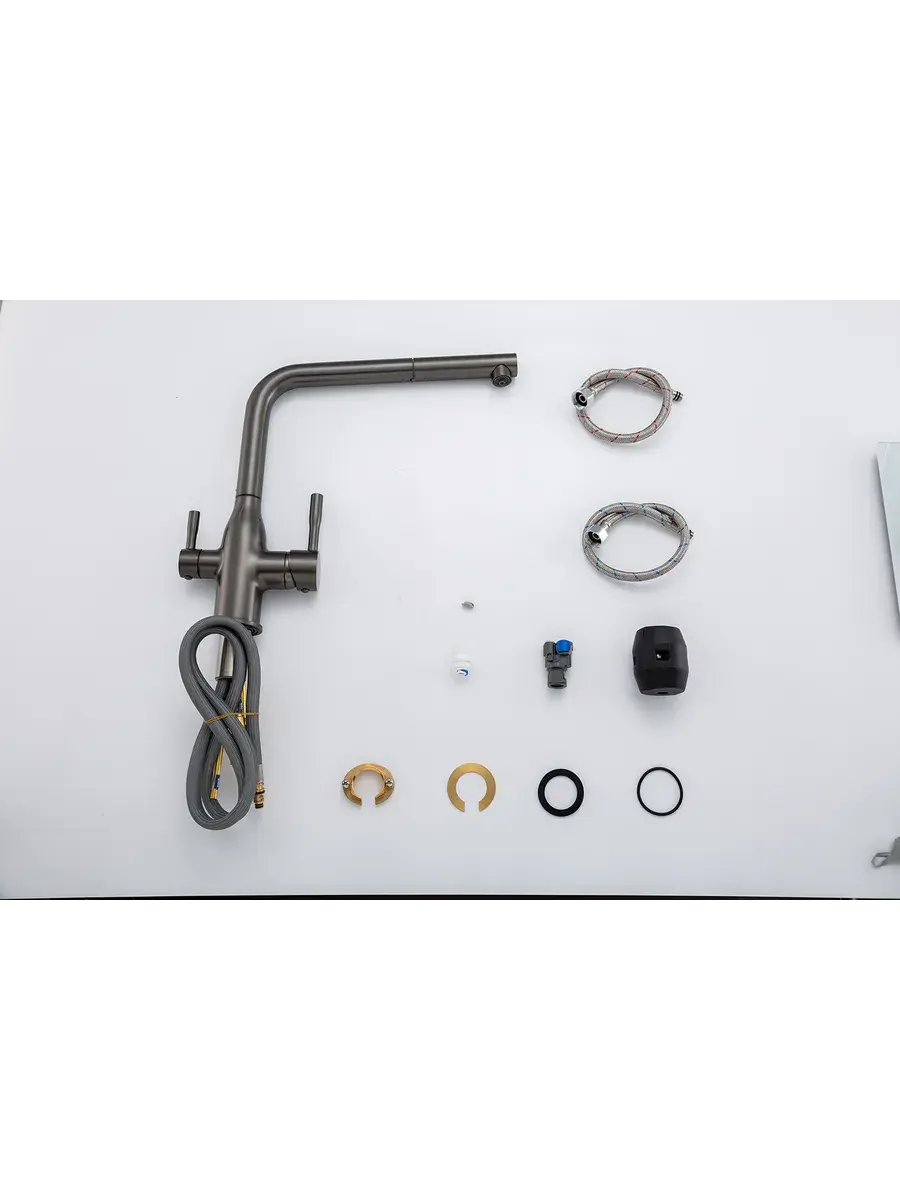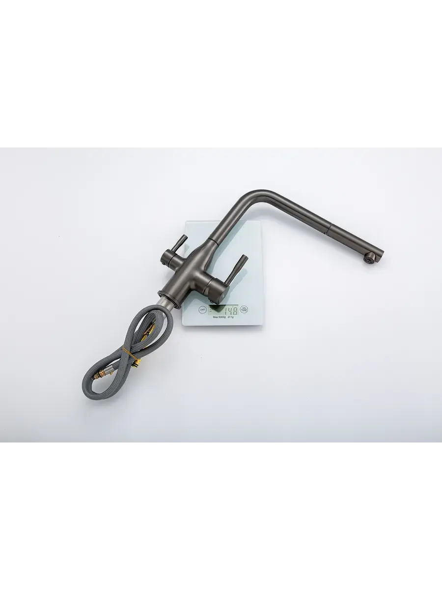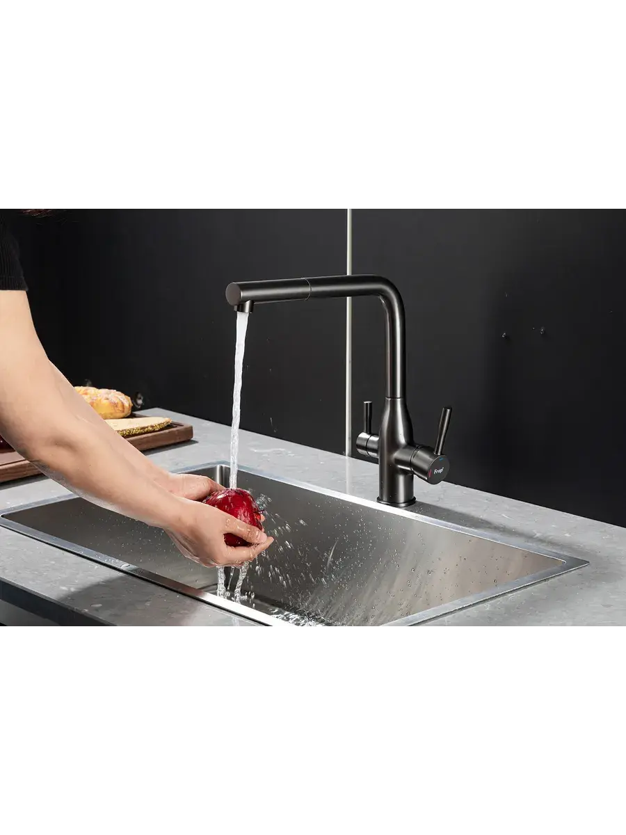 Смеситель для кухни с подключением к фильтру и выдвижным изливом FRAP F4396-39 в цвете оружейная сталь станет стильным и функциональным дополнением к вашей кухне. Модель оснащена выдвижным изливом с поворотным механизмом, что обеспечивает удобство использования и максимальный радиус действия. Высота излива составляет 32.5 см, а длина - 28.6 см, что позволяет комфортно мыть даже габаритную посуду. Смеситель FRAP F4396-39 оборудован встроенным фильтром для чистой питьевой воды, а также аэратором для экономии воды. Двухрычажный механизм управления и керамический картридж гарантируют плавную регулировку температуры и напора воды.