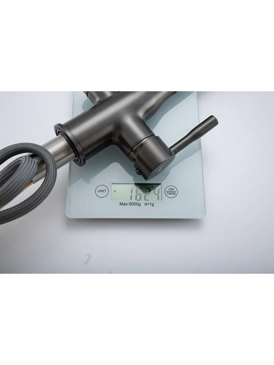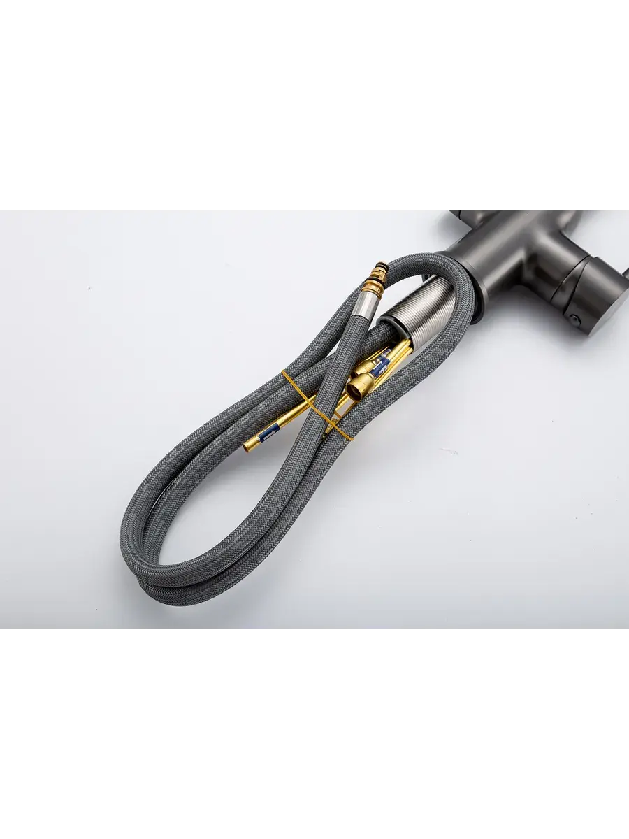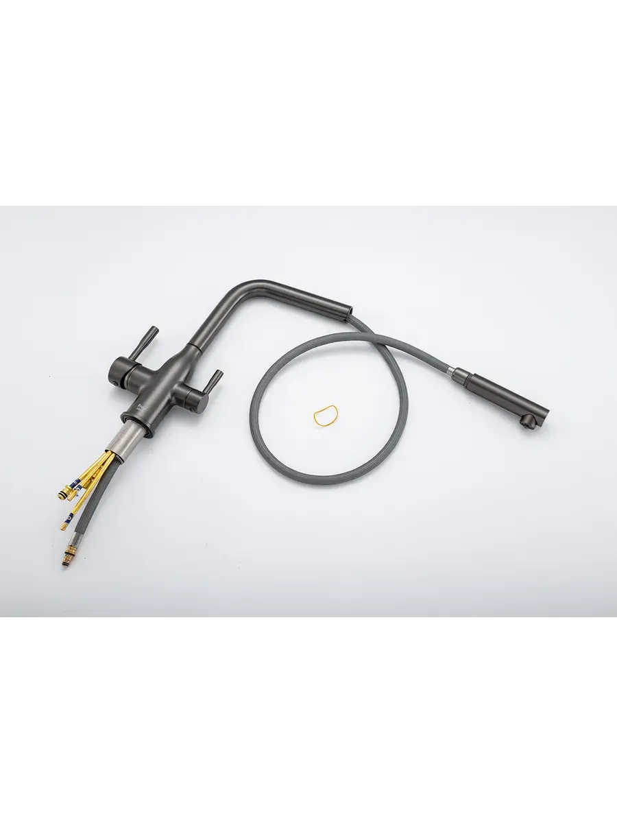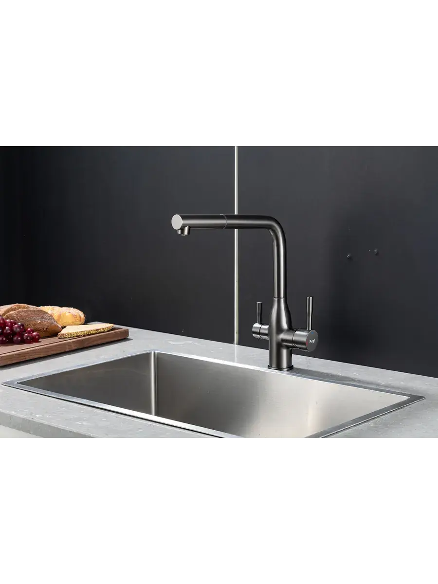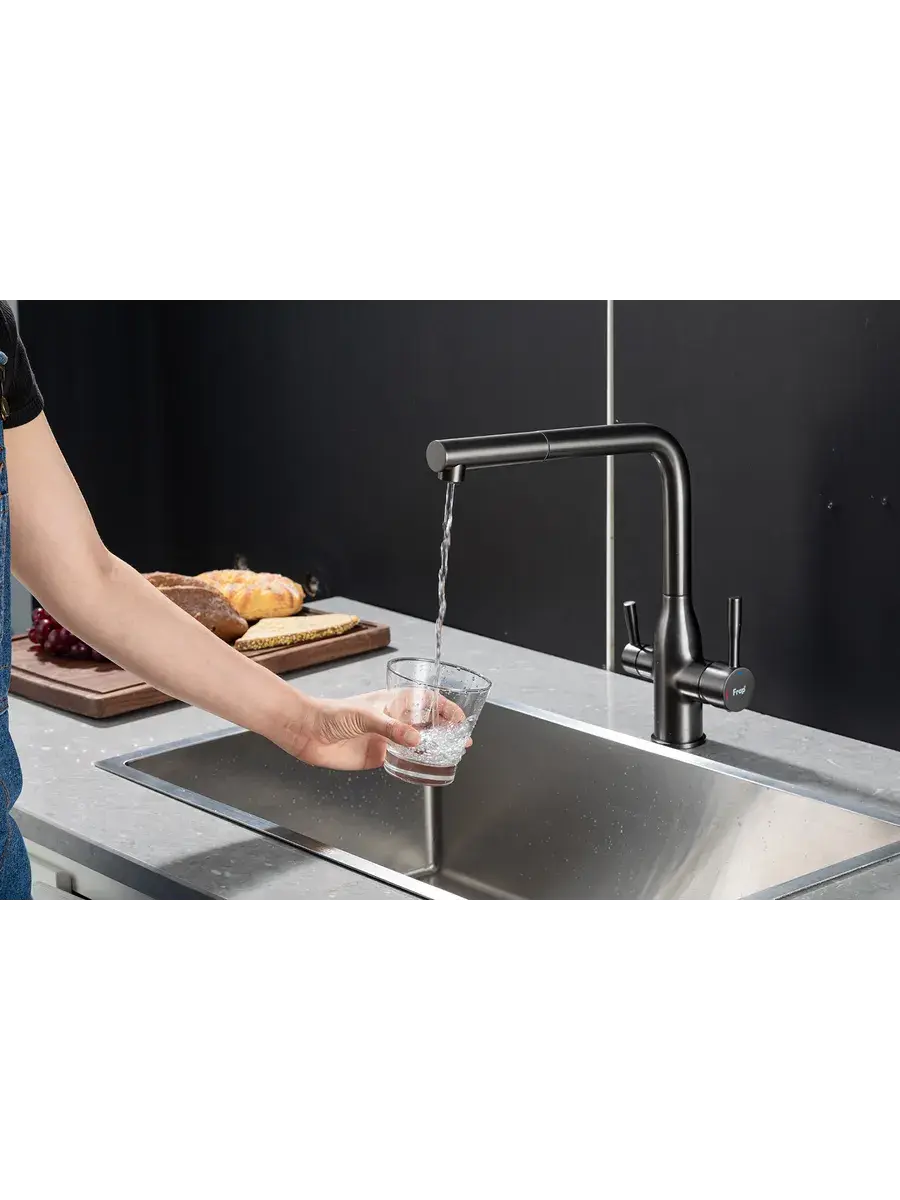 Смеситель для кухни с подключением к фильтру и выдвижным изливом FRAP F4396-39 в цвете оружейная сталь станет стильным и функциональным дополнением к вашей кухне. Модель оснащена выдвижным изливом с поворотным механизмом, что обеспечивает удобство использования и максимальный радиус действия. Высота излива составляет 32.5 см, а длина - 28.6 см, что позволяет комфортно мыть даже габаритную посуду. Смеситель FRAP F4396-39 оборудован встроенным фильтром для чистой питьевой воды, а также аэратором для экономии воды. Двухрычажный механизм управления и керамический картридж гарантируют плавную регулировку температуры и напора воды.