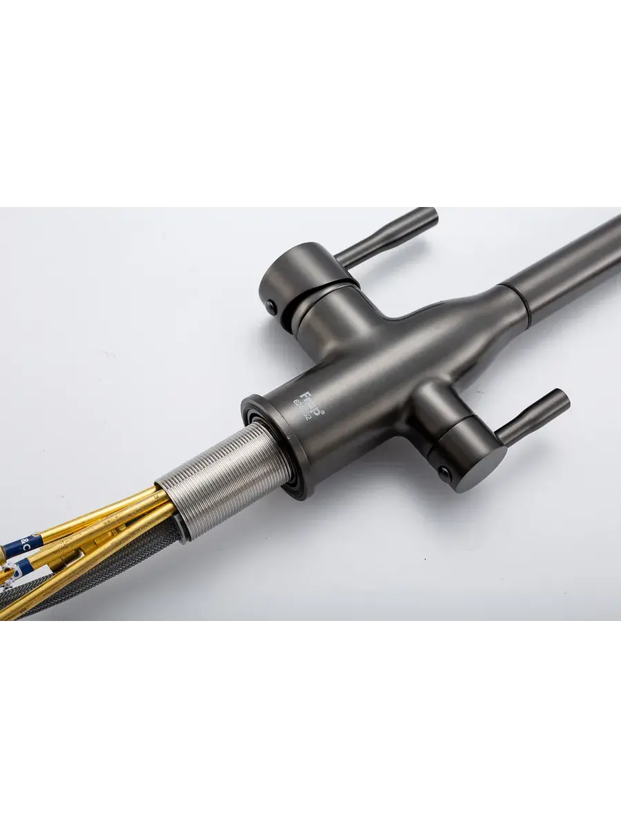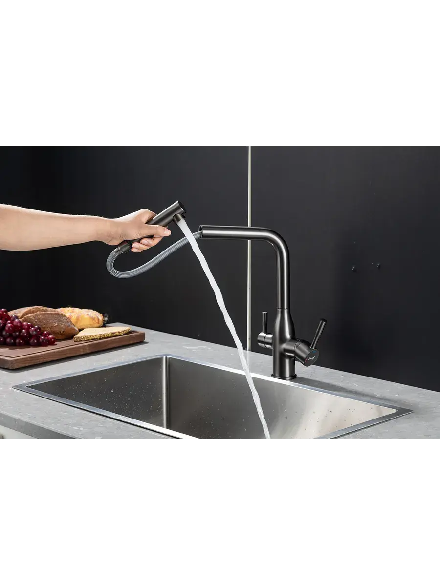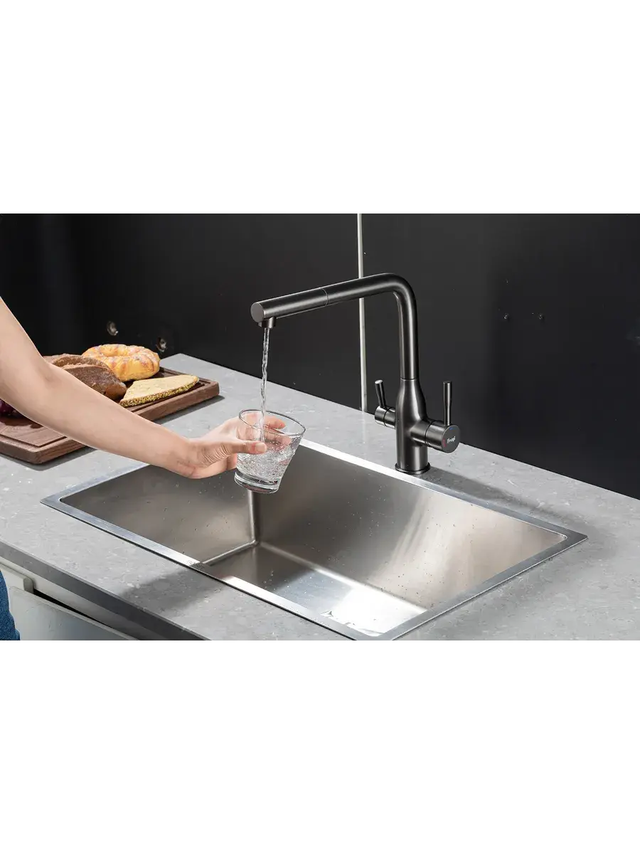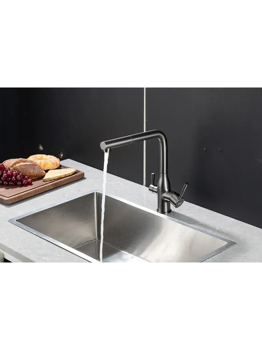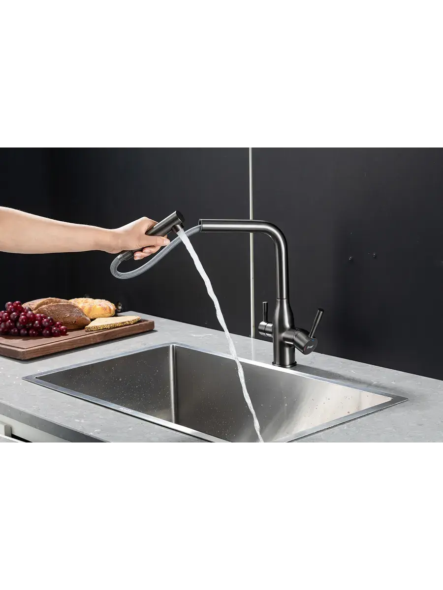 Смеситель для кухни с подключением к фильтру и выдвижным изливом FRAP F4396-39 в цвете оружейная сталь станет стильным и функциональным дополнением к вашей кухне. Модель оснащена выдвижным изливом с поворотным механизмом, что обеспечивает удобство использования и максимальный радиус действия. Высота излива составляет 32.5 см, а длина - 28.6 см, что позволяет комфортно мыть даже габаритную посуду. Смеситель FRAP F4396-39 оборудован встроенным фильтром для чистой питьевой воды, а также аэратором для экономии воды. Двухрычажный механизм управления и керамический картридж гарантируют плавную регулировку температуры и напора воды.