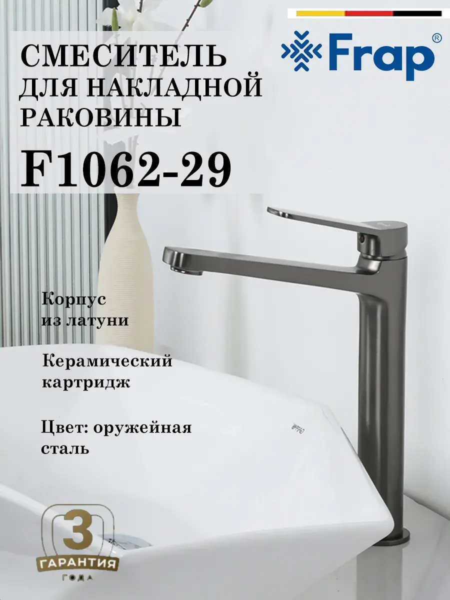 Смеситель высокий для накладной раковины FRAP F1062-29 - стильное и функциональное решение для вашей ванной комнаты. Однорычажный механизм управления позволяет легко регулировать температуру и напор воды, а керамический картридж гарантирует плавную работу и долговечность. Традиционный излив с аэратором обеспечивает комфортное использование, а длина излива в 19 см подходит для большинства раковин. Смеситель выполнен из латуни и покрыт хромом, что придает ему элегантный вид и устойчивость к коррозии. В комплект входит все необходимое для установки: смеситель, подводка, крепление и гарантийный талон.