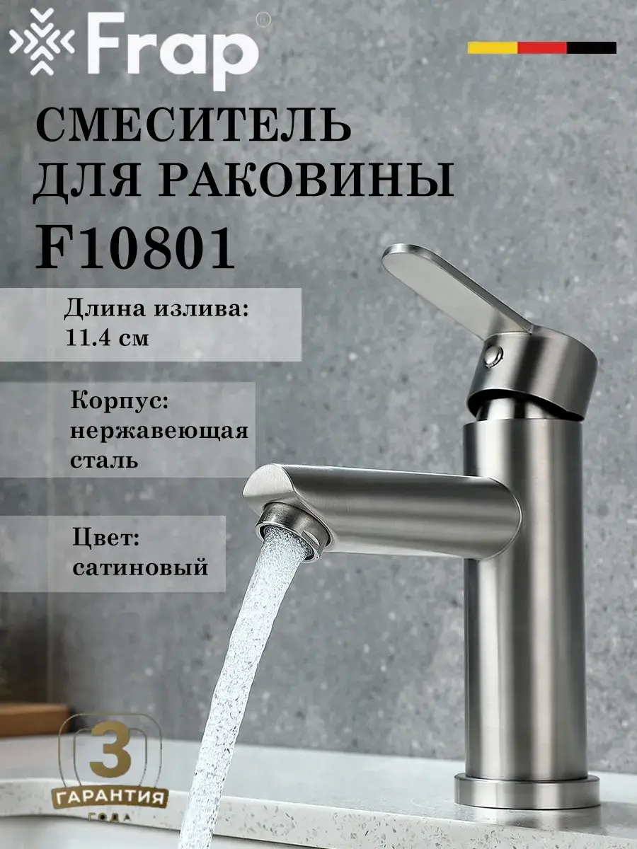 Смеситель для раковины FRAP F10801 - стильное и функциональное решение для вашей ванной комнаты. Однорычажный механизм управления позволяет легко регулировать температуру и напор воды, а керамический картридж гарантирует плавную работу и долговечность. Традиционный излив с аэратором обеспечивает комфортное использование, а длина излива в 11,4 см подходит для большинства раковин. Смеситель выполнен из нержавеющей стали SUS304 и покрыт хромом, что придает ему элегантный вид и устойчивость к коррозии. В комплект входит все необходимое для установки: смеситель, подводка, крепление и гарантийный талон.